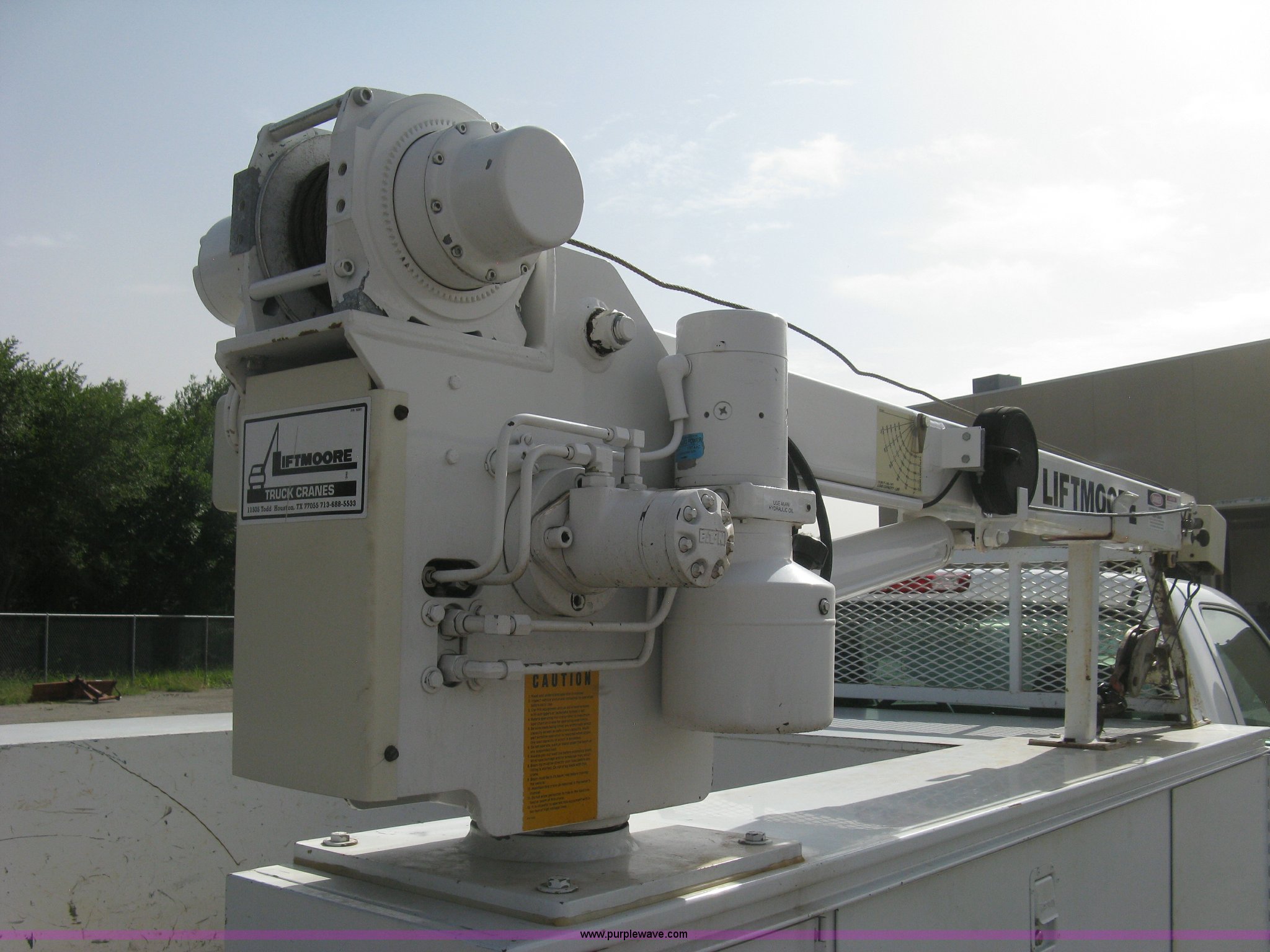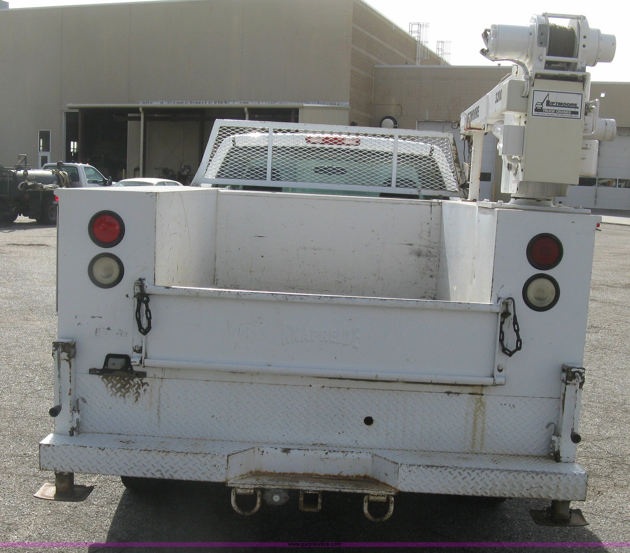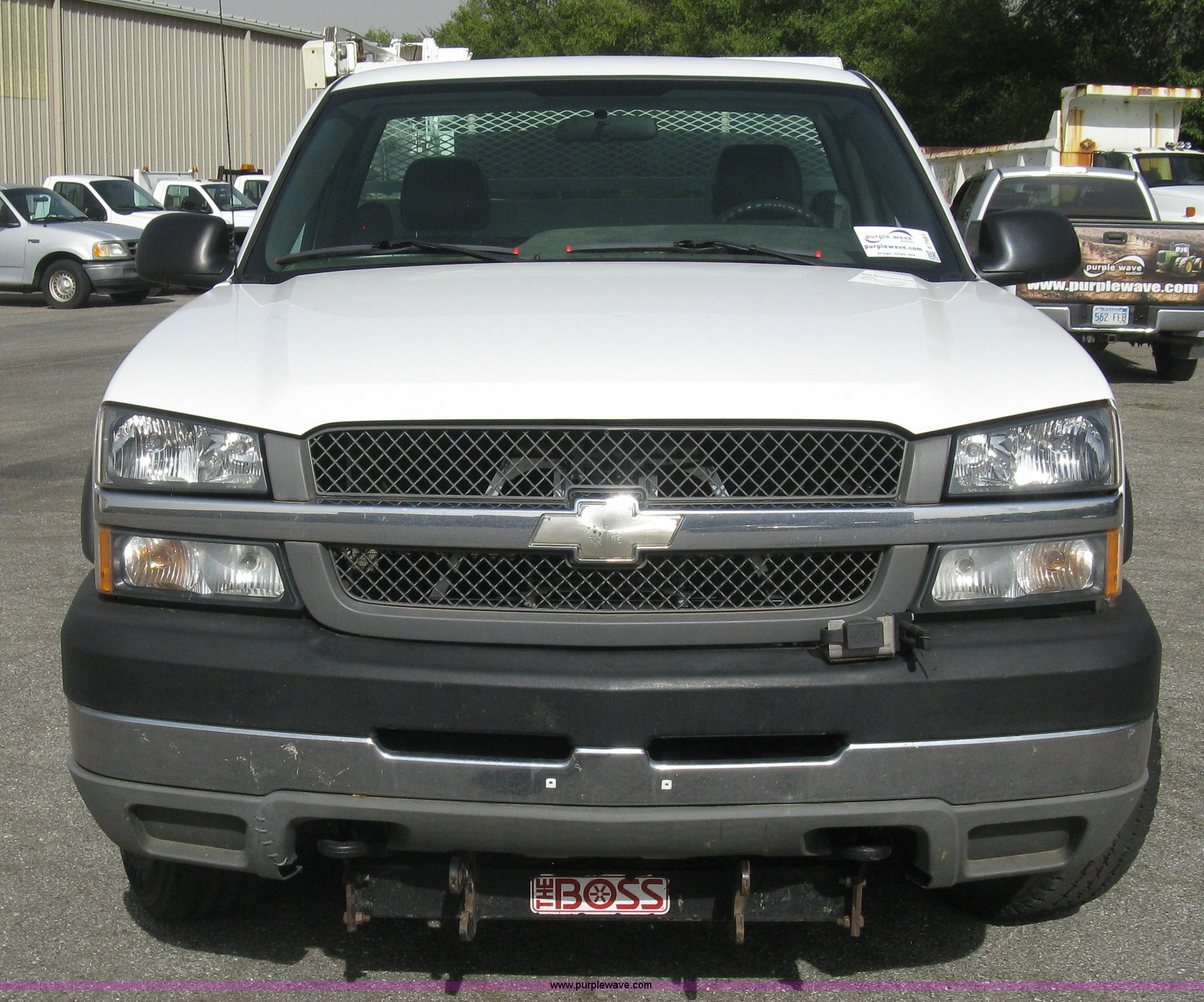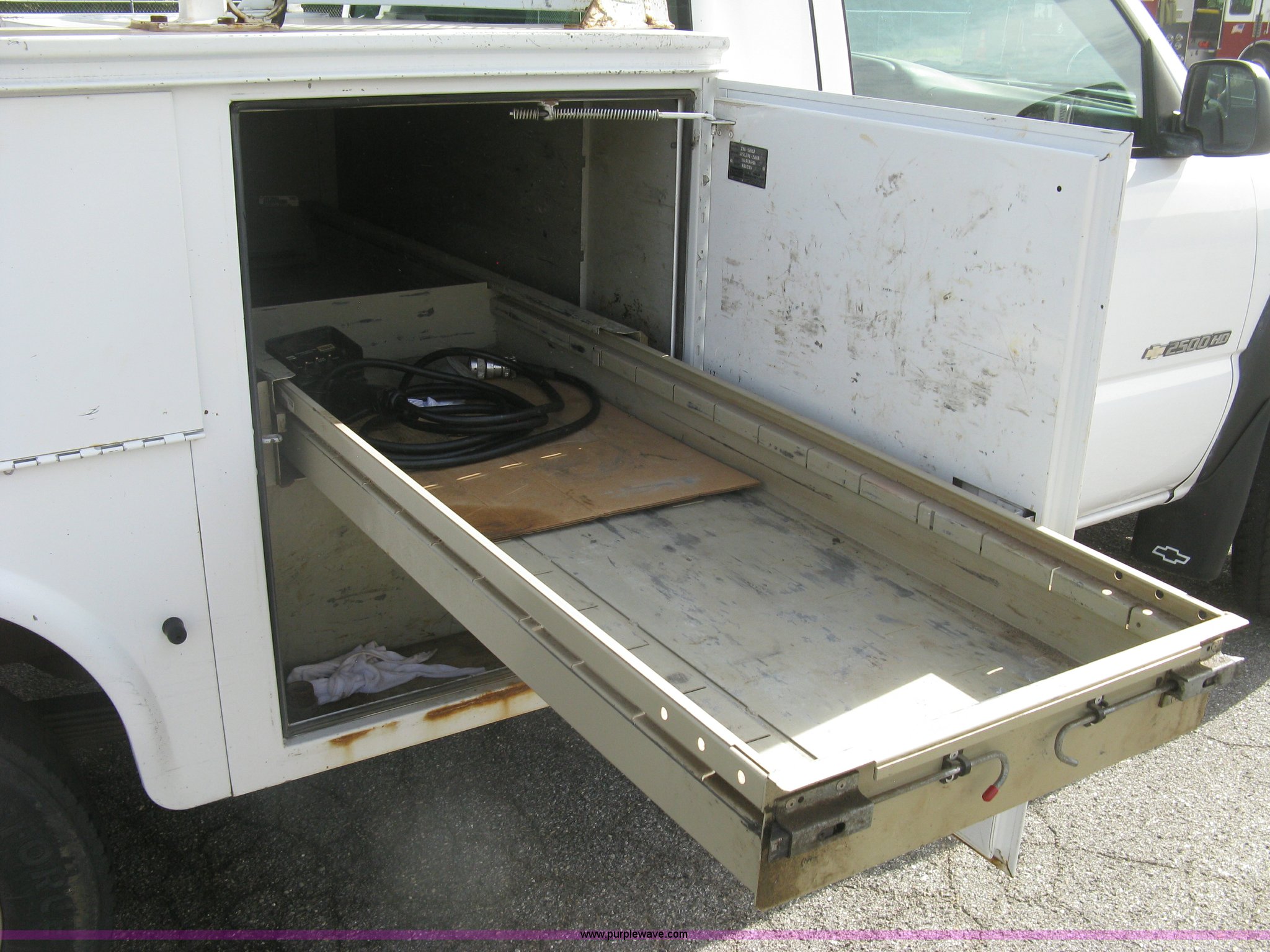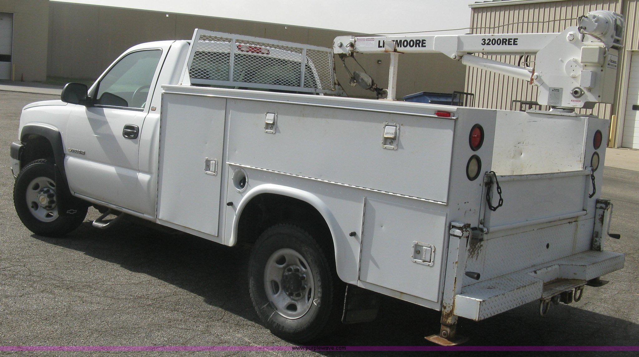 Purple Wave is selling a used Service Truck in Kansas. This item is a 2004 Chevrolet Silverado 2500HD utility truck with the following: 119,662 actual miles, 6.0L V8 OHV 16V gas engine, Automatic transmission, Four wheel drive, AC and heat, Tilt, AM/FM, Manual windows and locks, Cloth interior, Knapheide utility bed, 8'L x 78"W, Headache rack, Step-up bumper, Manual jack support/outrigger on rear bumper, (6) tool cabinets, Lift Moore 3200REE telescopic crane, Tethered remote, Serial S554W58, Boss snow plow mounting frame, No plow, Receiver hitch, Trailer wiring, LT245/75R16 tires, Interior/exterior cosmetic damage, Unit# 31