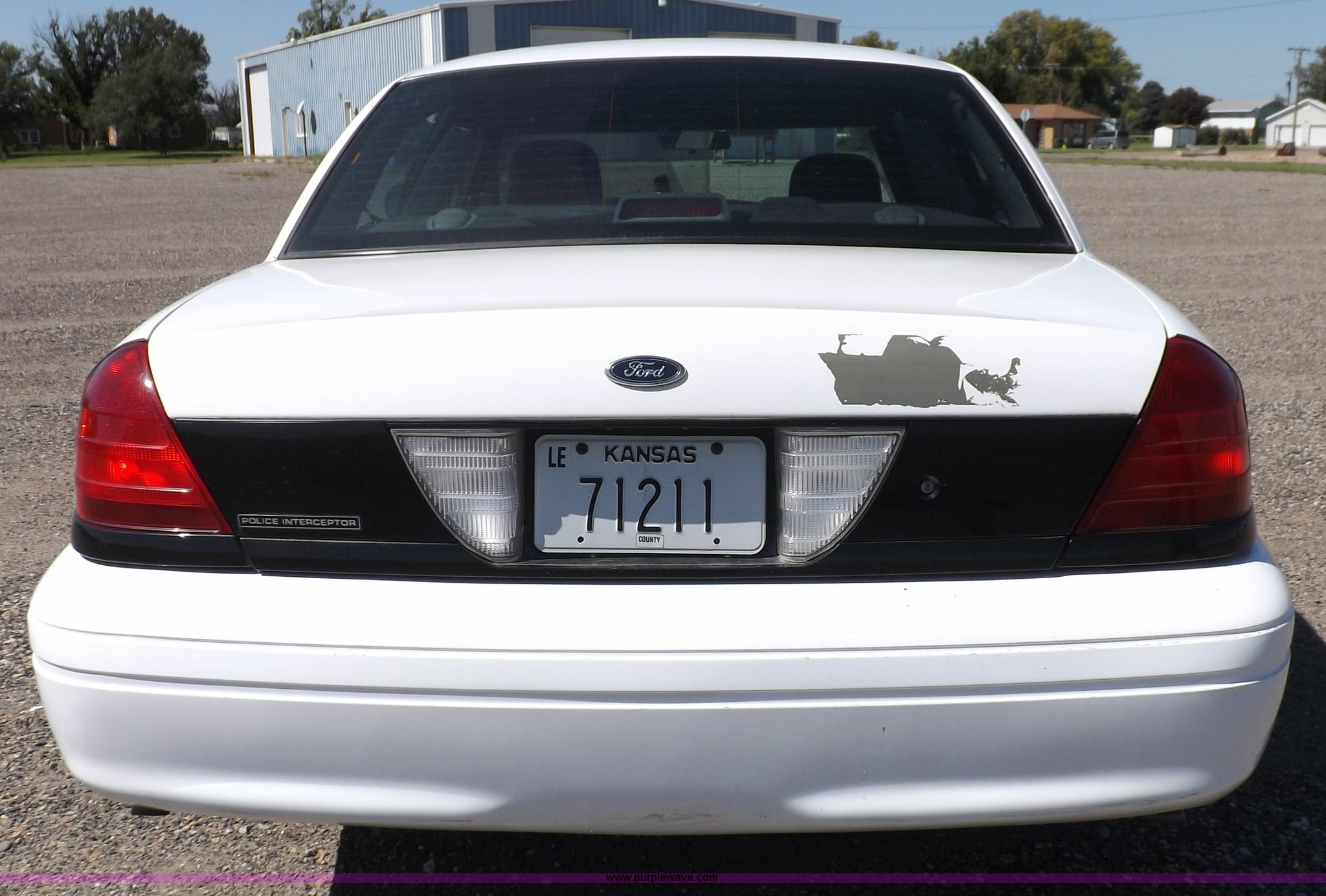 2008 Ford Crown Victoria Police Interceptor. 122,006 actual miles, 4.6L V8 2V SOHC gas engine, Automatic transmission, AC and heat, Tilt, Cruise, AM/FM/CD, Power windows, locks, mirrors, and seats, Cloth interior, Spotlight, Setina Body Guard grill guard, Law Enforcement console, Front to rear partition, Keyless start, 235/55R17 tires, Top drill holes, Paint damage, Weak battery. 2FAHP71V38X126048. Lane County. 750 W Long. Dighton, KS 67839