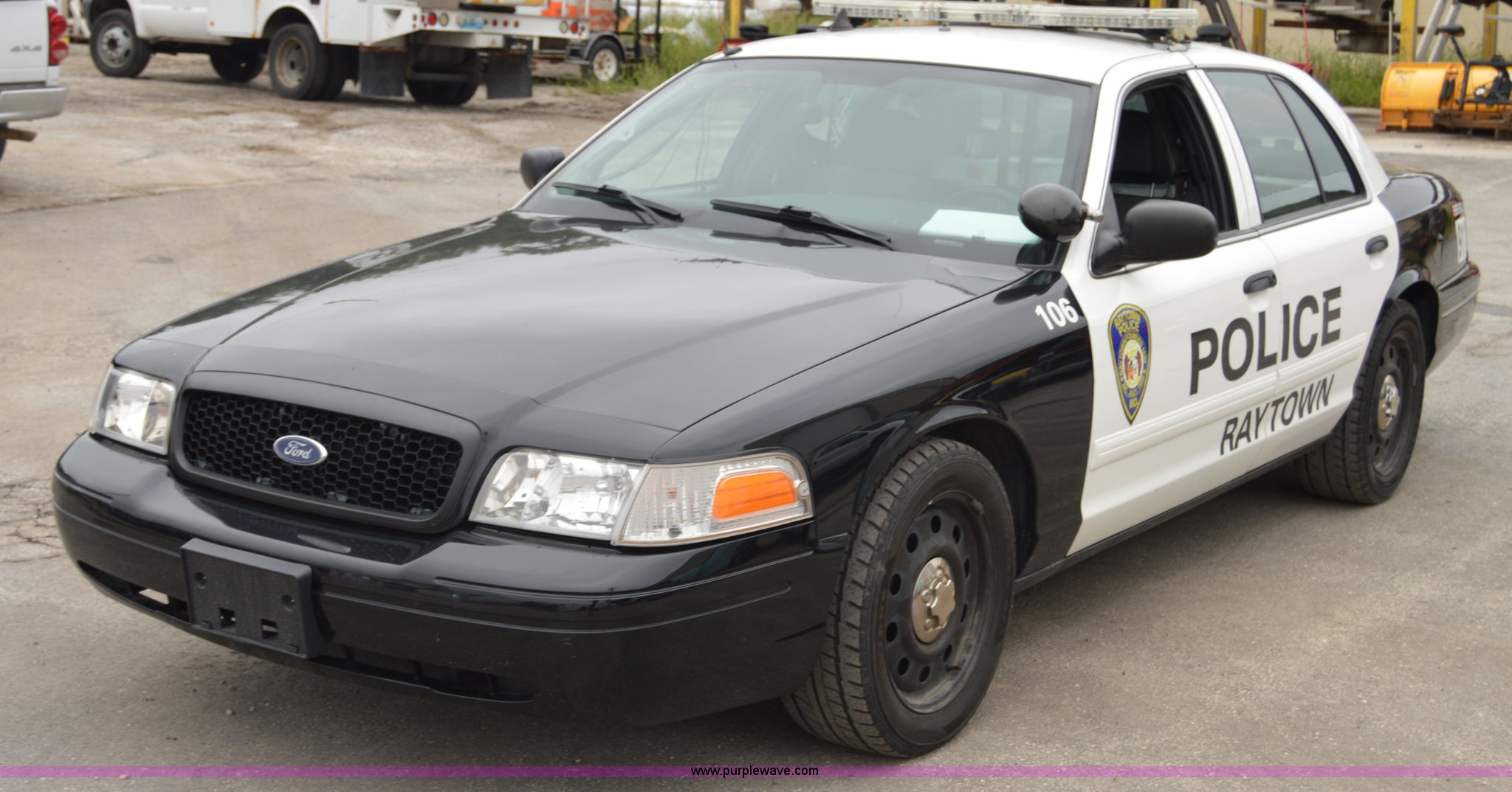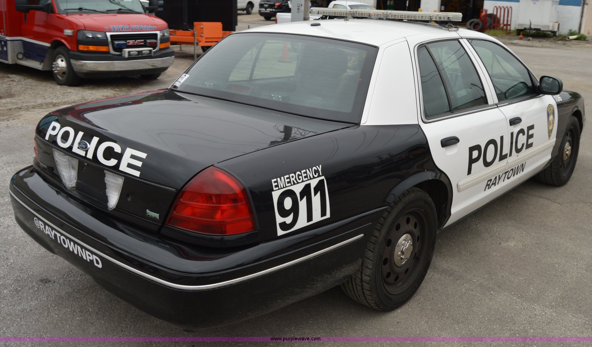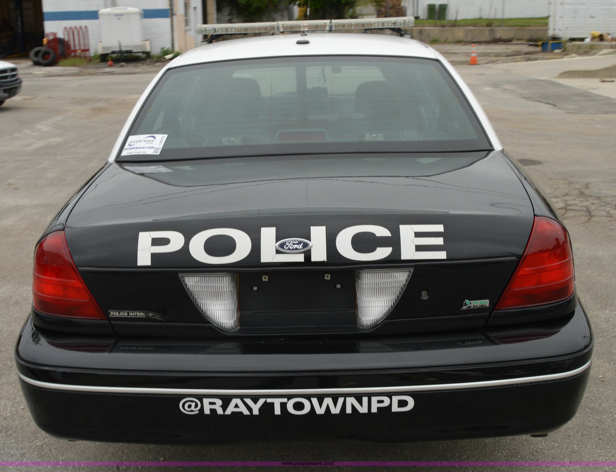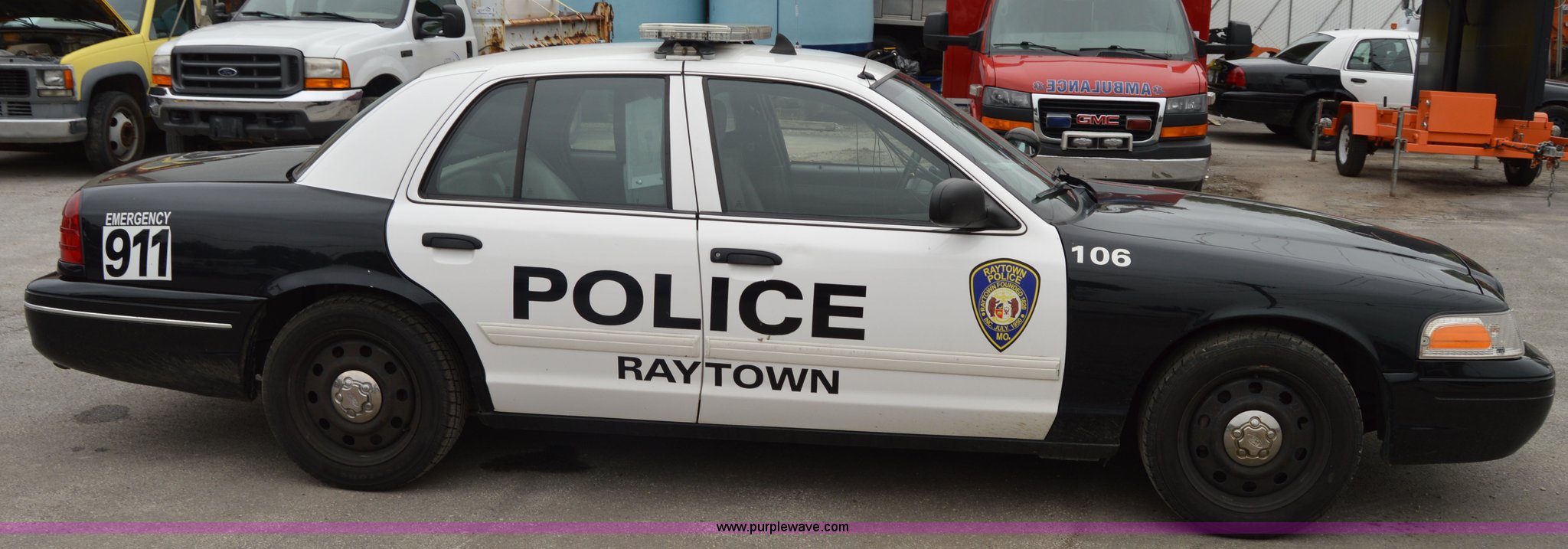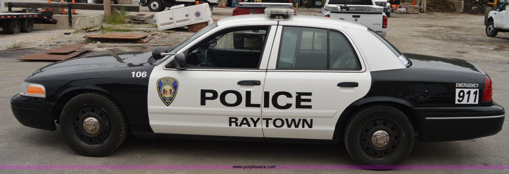 2010 Ford Crown Victoria Police Interceptor. 104,660 miles on odometer, 4.6L V8 SOHC 16V FFV gas engine, Automatic transmission, AC and heat, Tilt, Cruise, AM/FM, Power windows, locks, and mirrors, Cloth interior, Adjustable foot pedals, 235/55R17 tires, Interior/exterior cosmetic damage, Check engine light on, Original rear seat included, Unit# 106. 2FABP7BV3AX102522. City of Raytown. 10014 E 65 St. Raytown, MO 64133