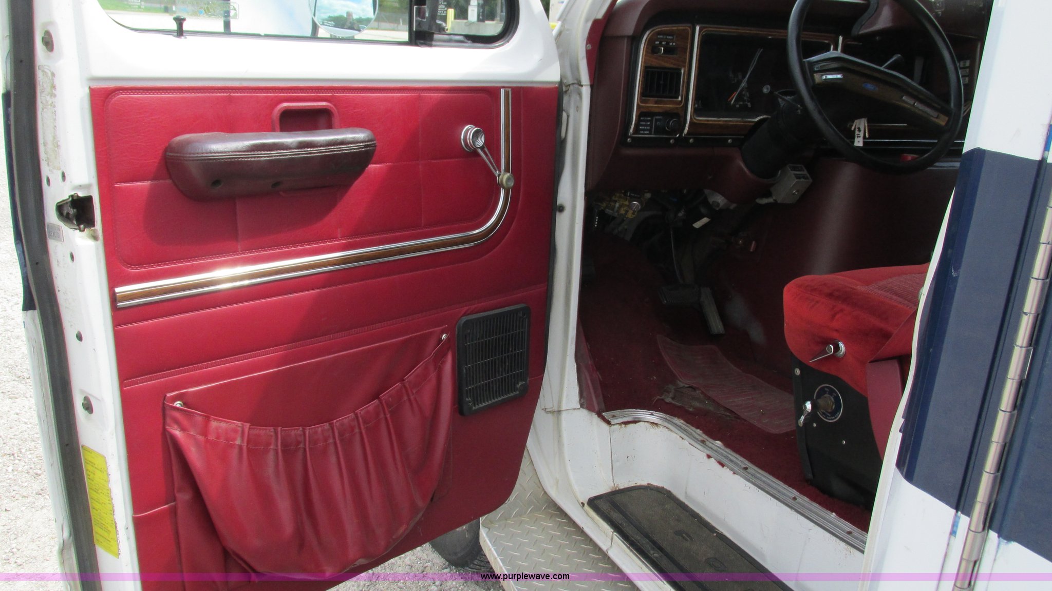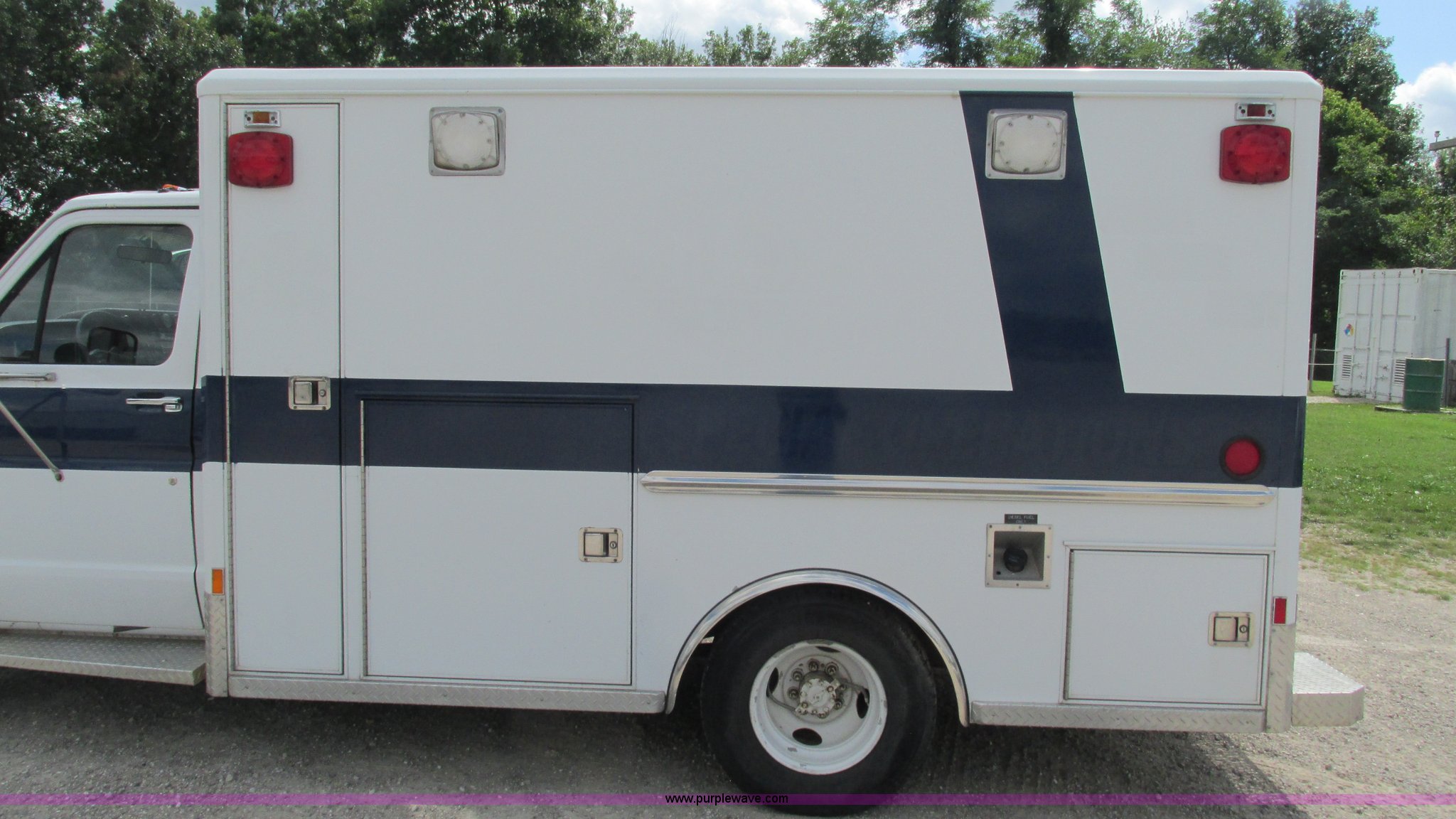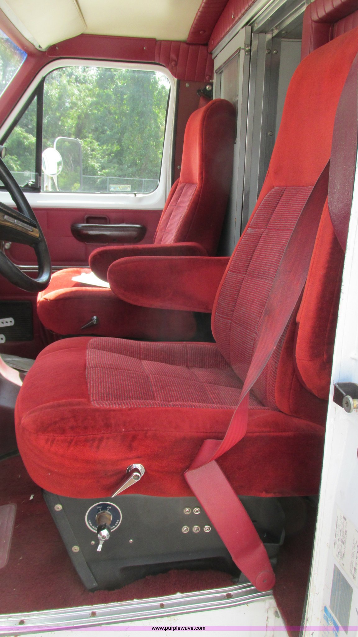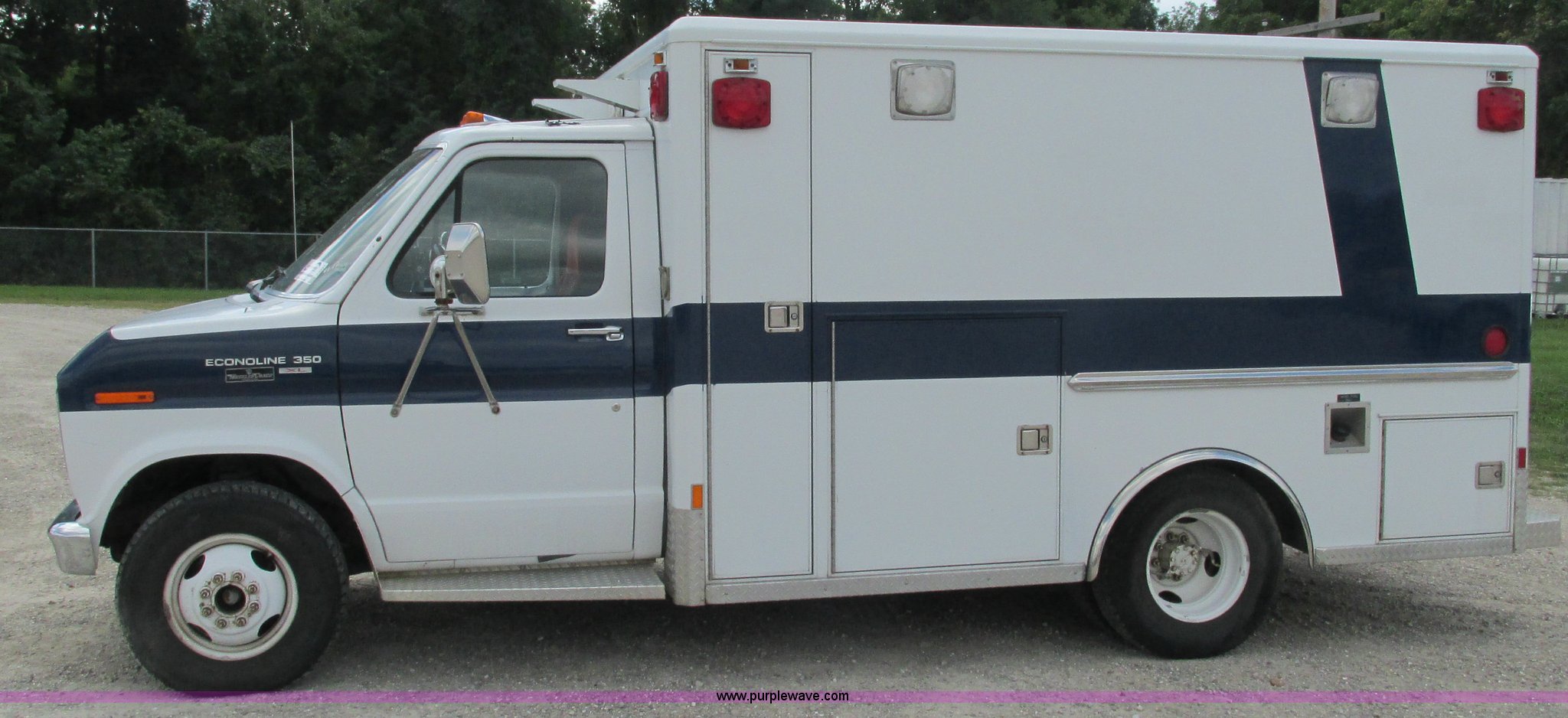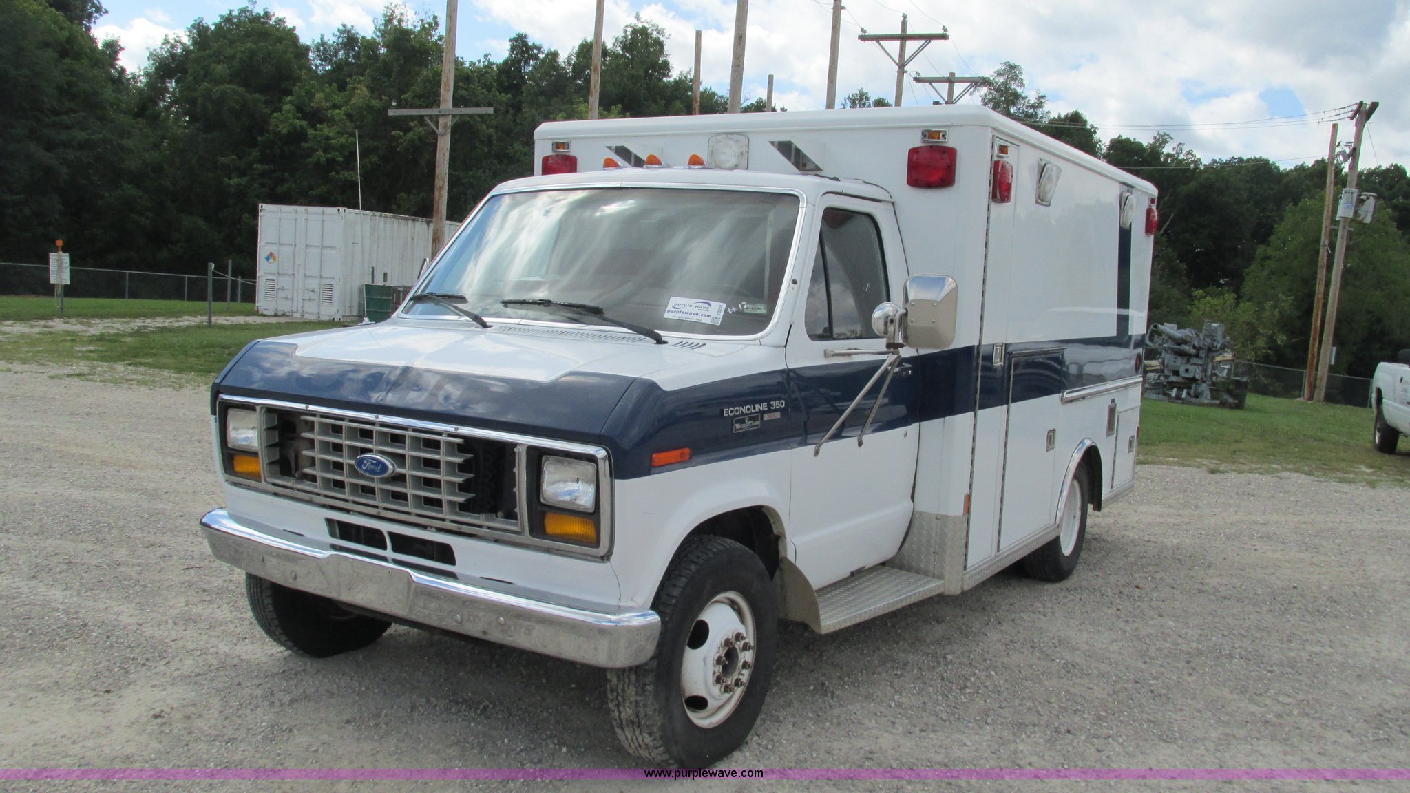 Purple Wave is selling a used Fire Truck or Emergency Vehicle in Missouri. This item is a 1989 Ford Econoline E350 van with the following: 69,508 miles on odometer, 3,583 hours on meter, 7.3L V8 OHV 16V diesel engine, Automatic transmission, AC and heat, Cruise, AM/FM, Manual windows and locks, Cloth interior, Rear AC and heat, Vinyl jump seat and bench seat, Aluminum running boards, Rear wok lights, Wheeled coach conversion, LT215/85R16 tires, FAWR 4,200 lbs, RAWR 10,5000 lbs, RAWR 7,480 lbs, Interior/exterior cosmetic damage, Two compartments will not open, Grill parts missing, Unit# 10145