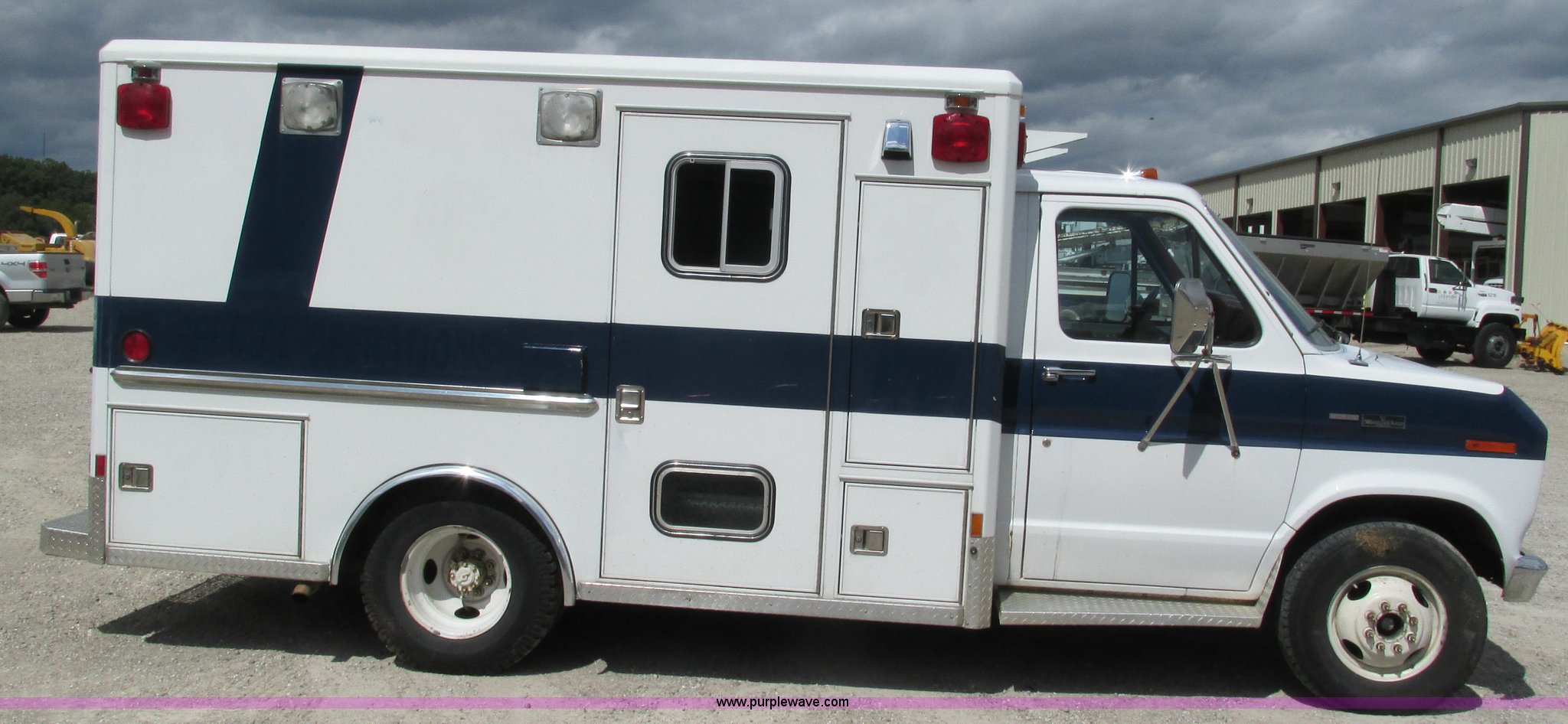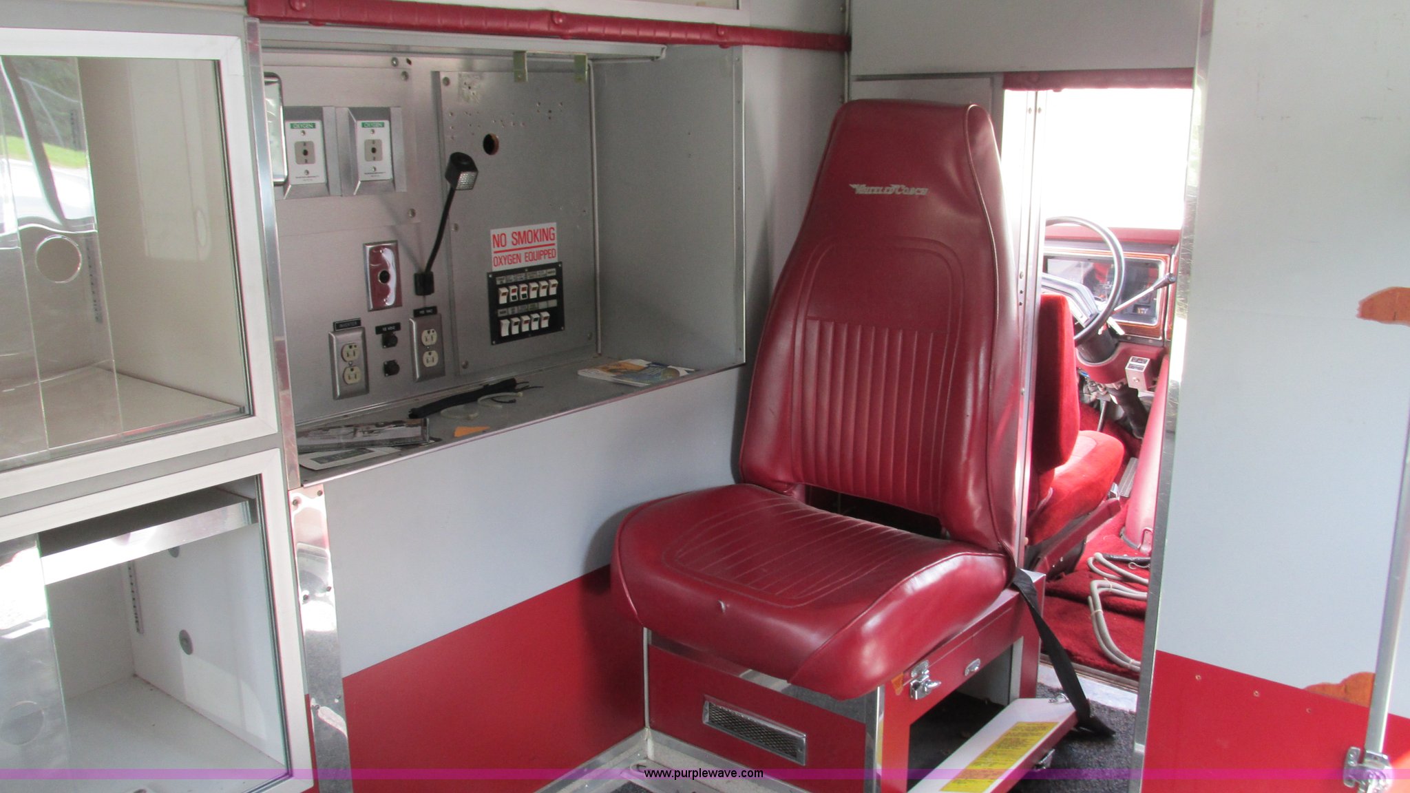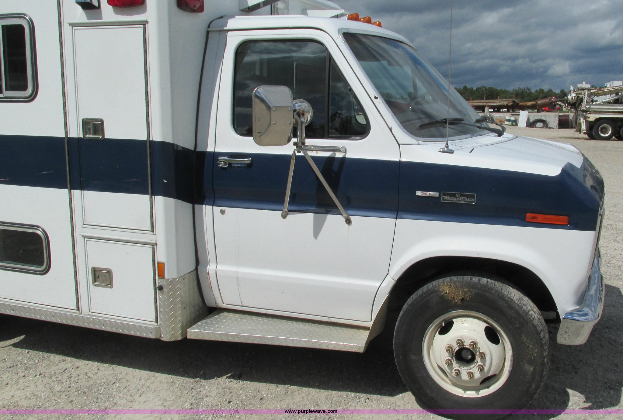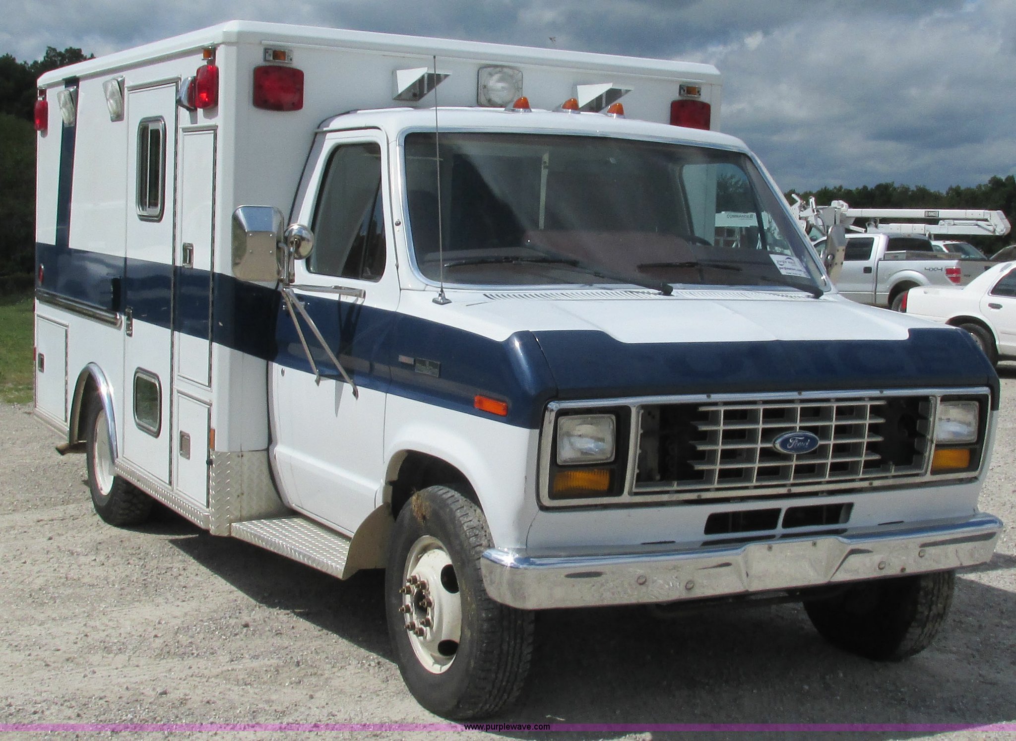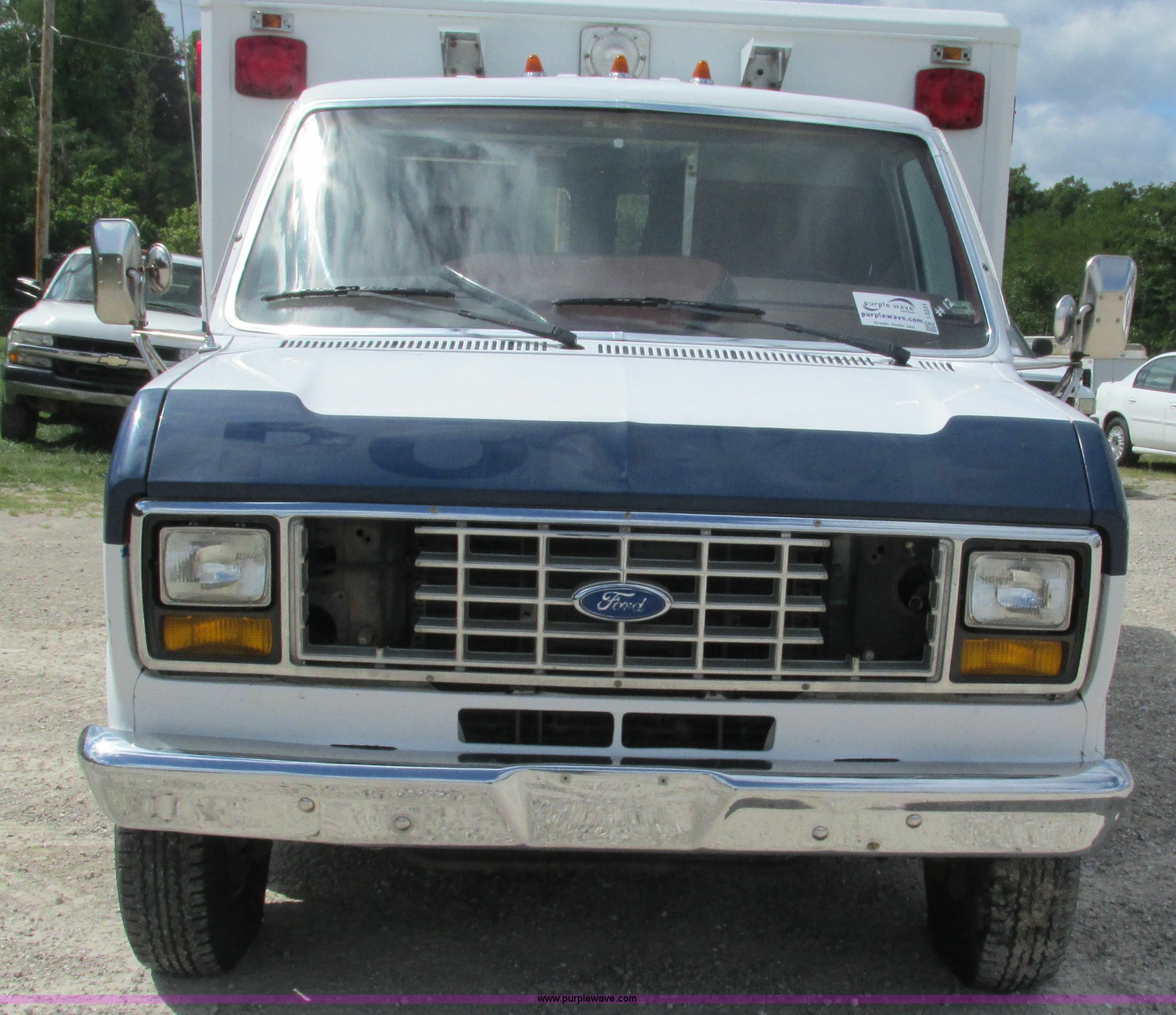 Purple Wave is selling a used Fire Truck or Emergency Vehicle in Missouri. This item is a 1989 Ford Econoline E350 van with the following: 69,508 miles on odometer, 3,583 hours on meter, 7.3L V8 OHV 16V diesel engine, Automatic transmission, AC and heat, Cruise, AM/FM, Manual windows and locks, Cloth interior, Rear AC and heat, Vinyl jump seat and bench seat, Aluminum running boards, Rear wok lights, Wheeled coach conversion, LT215/85R16 tires, FAWR 4,200 lbs, RAWR 10,5000 lbs, RAWR 7,480 lbs, Interior/exterior cosmetic damage, Two compartments will not open, Grill parts missing, Unit# 10145