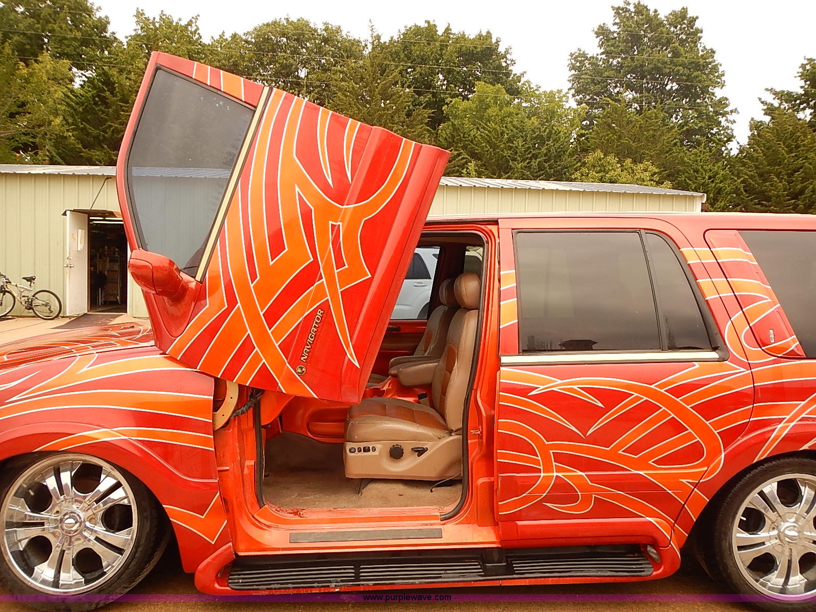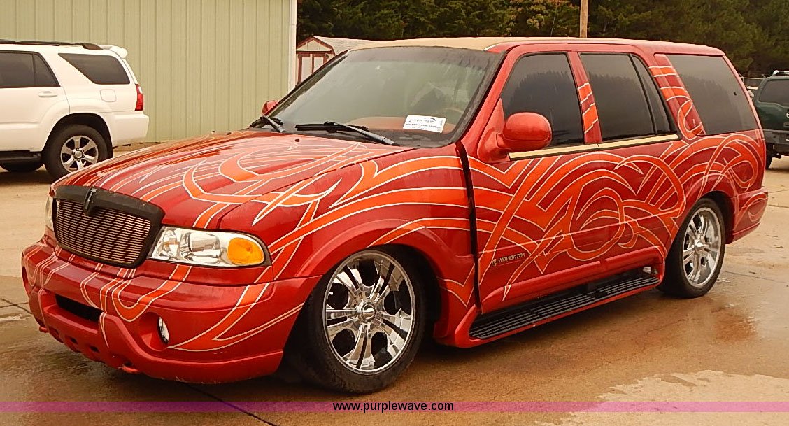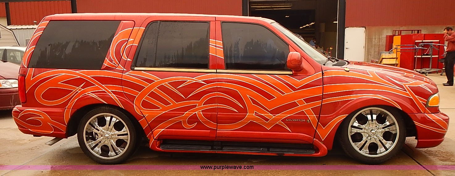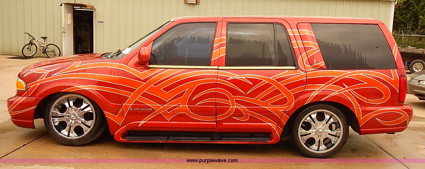 Purple Wave is selling a used Passenger Vehicle in Kansas. This item is a 1998 Lincoln Navigator SUV with the following: 56,373 miles on odometer, 5.4L V8 SOHC 16V gas engine, Automatic transmission, Four wheel drive, AC and heat, Tilt, Cruise, AM/FM/MP3, Power windows, locks, mirrors, and seats, Heated seats, Leather interior, Audio Bahn Special Edition speaker system, (2) Crunch 1,000 watt amplifiers, Lamborgini style front doors, Originals included, Front tow hooks, Fog lights, Running boards, Suicide rear doors, Receiver hitch, Trailer wiring, Air bag suspension, Hankooks 275/40R20 tires, Custom paint, Stereo system inoperable, Dead battery, Slow leak in air bag lines, No exterior door handles, ABS light on