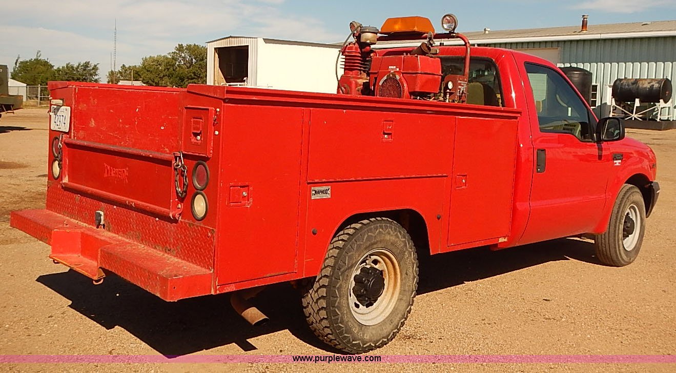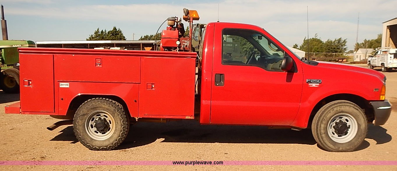 Purple Wave is selling a used Service Truck in Kansas. This item is a 2000 Ford F250 XLT Super Duty utility truck with the following: 112,830 miles on odometer, 5.4L V8 SOHC 16V gas engine, Automatic transmission, AC and heat, AM/FM, Manual windows and locks, Vinyl interior, Knaphiede utility bed, (8) compartments, Rear work lights, Kohler Magnum 14 HP air compressor, Front tow hooks, 235/85R16 tires, Dents and scratches, Gear shifter sloppy, Contents are not included