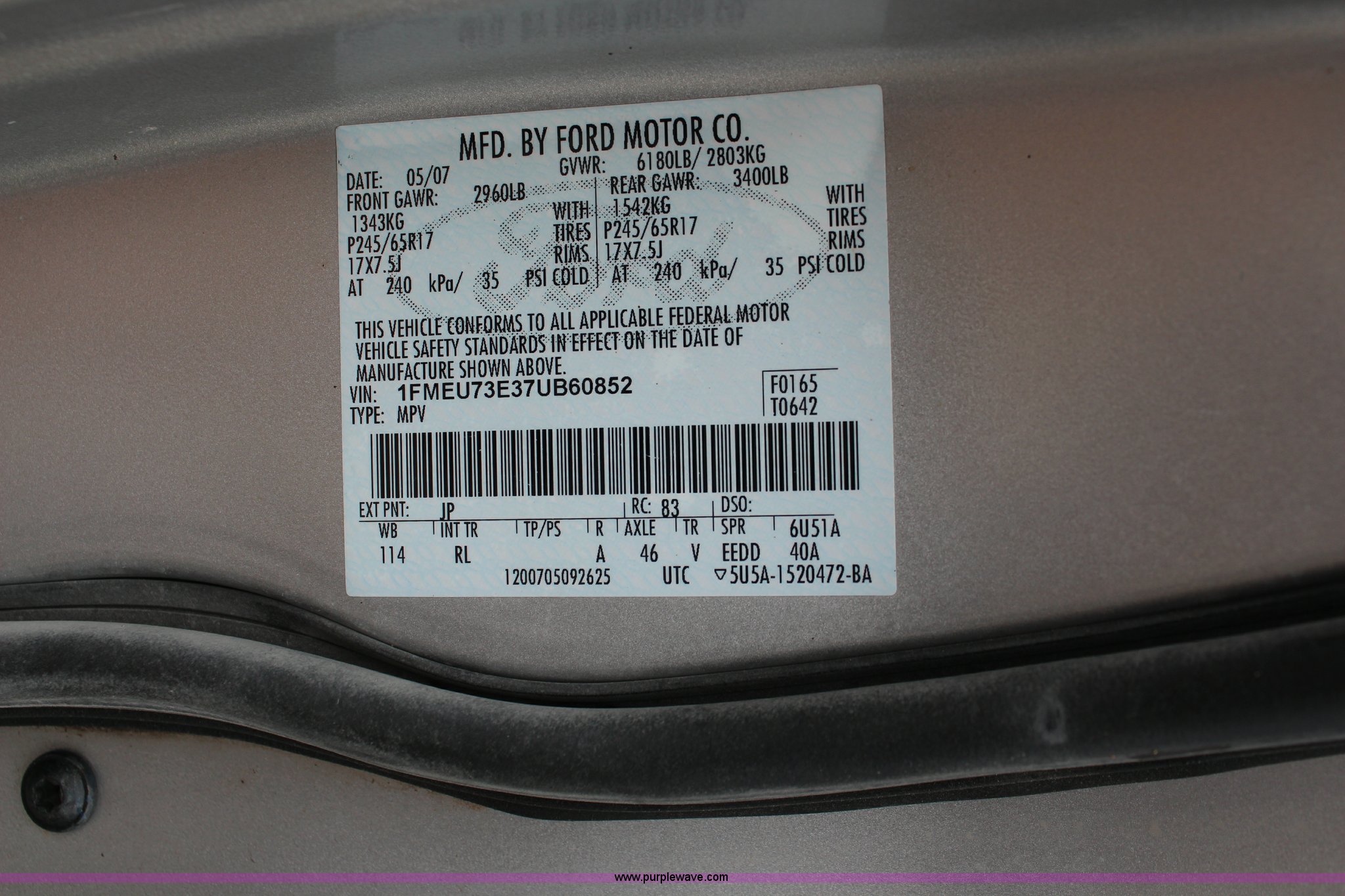2007 Ford Explorer XLT SUV. 124,005 miles on odometer, 4.0L V6 SOHC 16V gas engine, Automatic transmission, Advance Trac RSC, AC and heat, Tilt, Cruise, AM/FM/CD, Power windows, locks, and mirrors, Cloth interior, Receiver hitch, 245/65R17 tires, ABS light on, Air bag light on, Service engine light on. Seller is a government entity who will be assigning and distributing the title. Please contact the seller for distribution questions. 1FMEU73E37UB60852. Leavenworth County Sheriff. 23690 187th St. Leavenworth, KS 66048