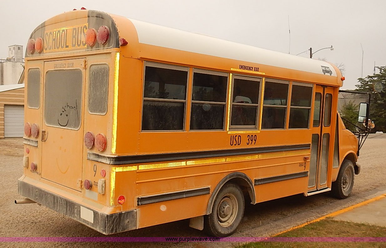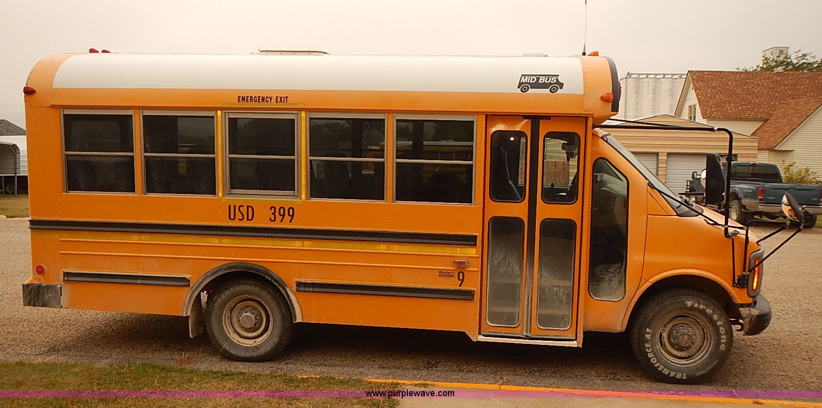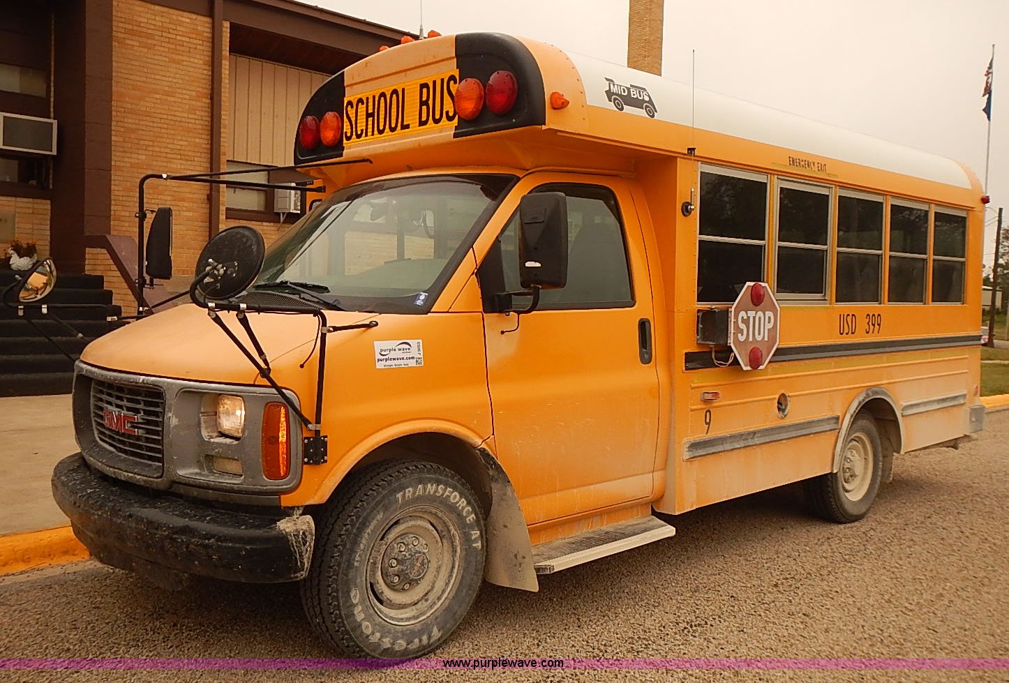 Purple Wave is selling a used Bus in Kansas. This item is a 2001 GMC Savana school bus with the following: 110,496 miles on odometer, Miles may vary, still in use, 5.7L V8 gas engine, Automatic transmission, AC and heat, AM/FM/cassette, Manual windows and locks, Vinyl interior, Heated mirrors, 18 passenger capacity, Seat belts, 245/75R16 tires, Decals will be removed prior to auction, Unit# 9
