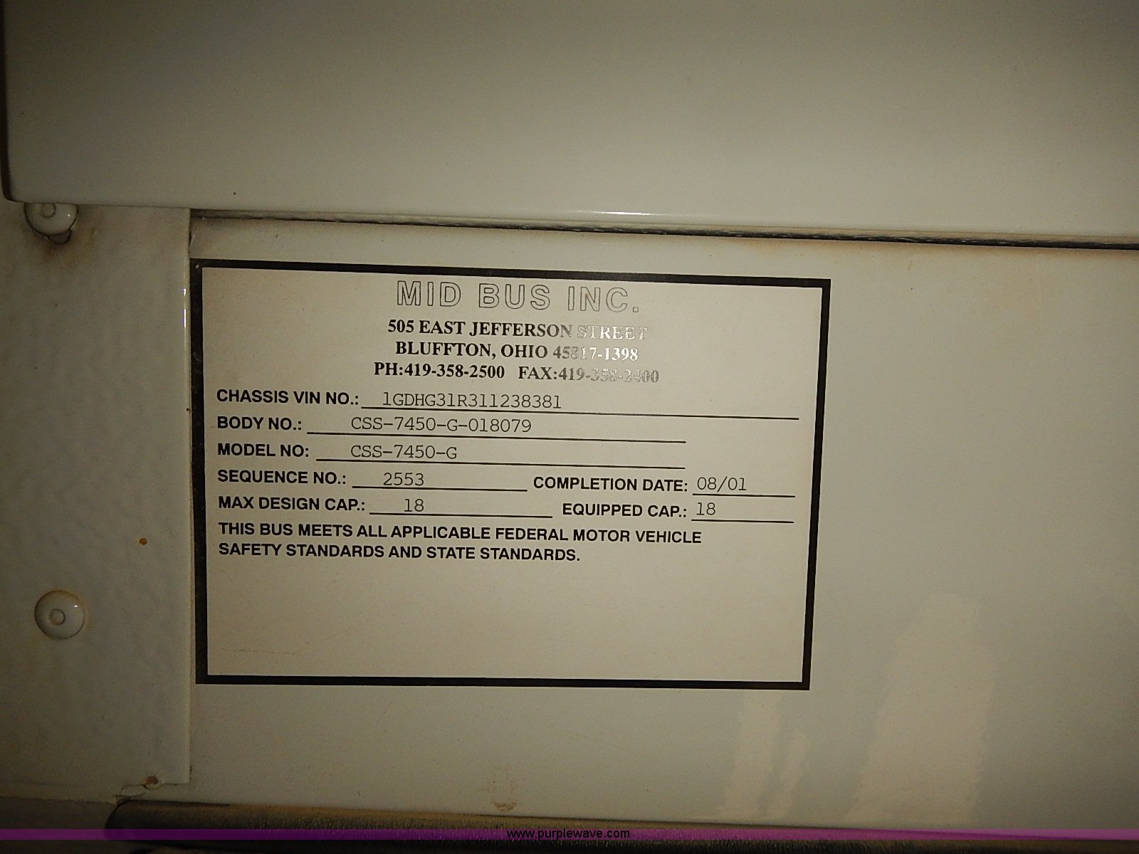 2001 GMC Savana school bus. 110,496 miles on odometer Miles may vary, still in use, 5.7L V8 gas engine, Automatic transmission, AC and heat, AM/FM/cassette, Manual windows and locks, Vinyl interior, Heated mirrors, 18 passenger capacity, Seat belts, 245/75R16 tires, Decals will be removed prior to auction, Unit# 9. 1GDHG31R311238381. USD 399. 610 3rd. Natoma, KS 67651