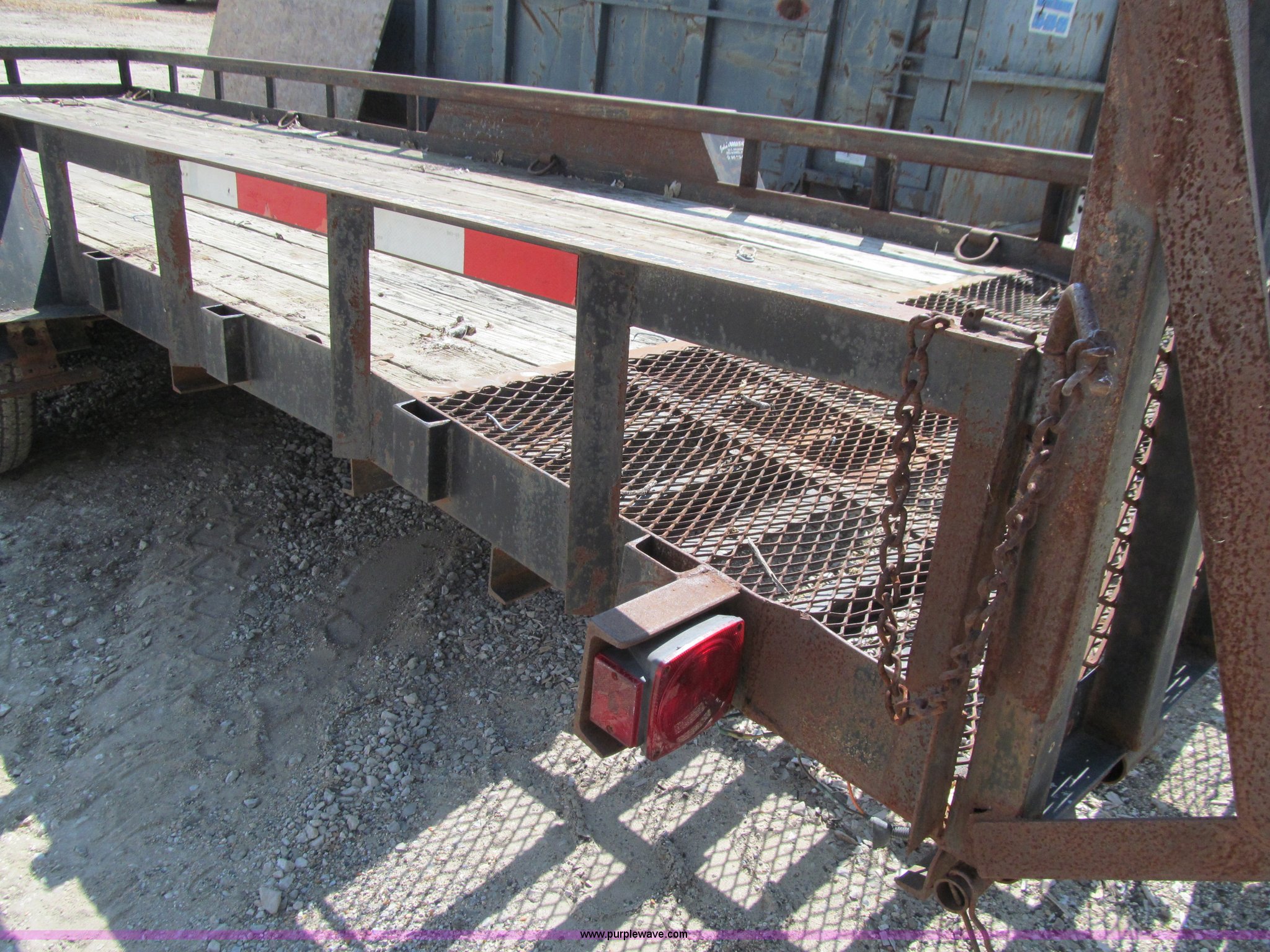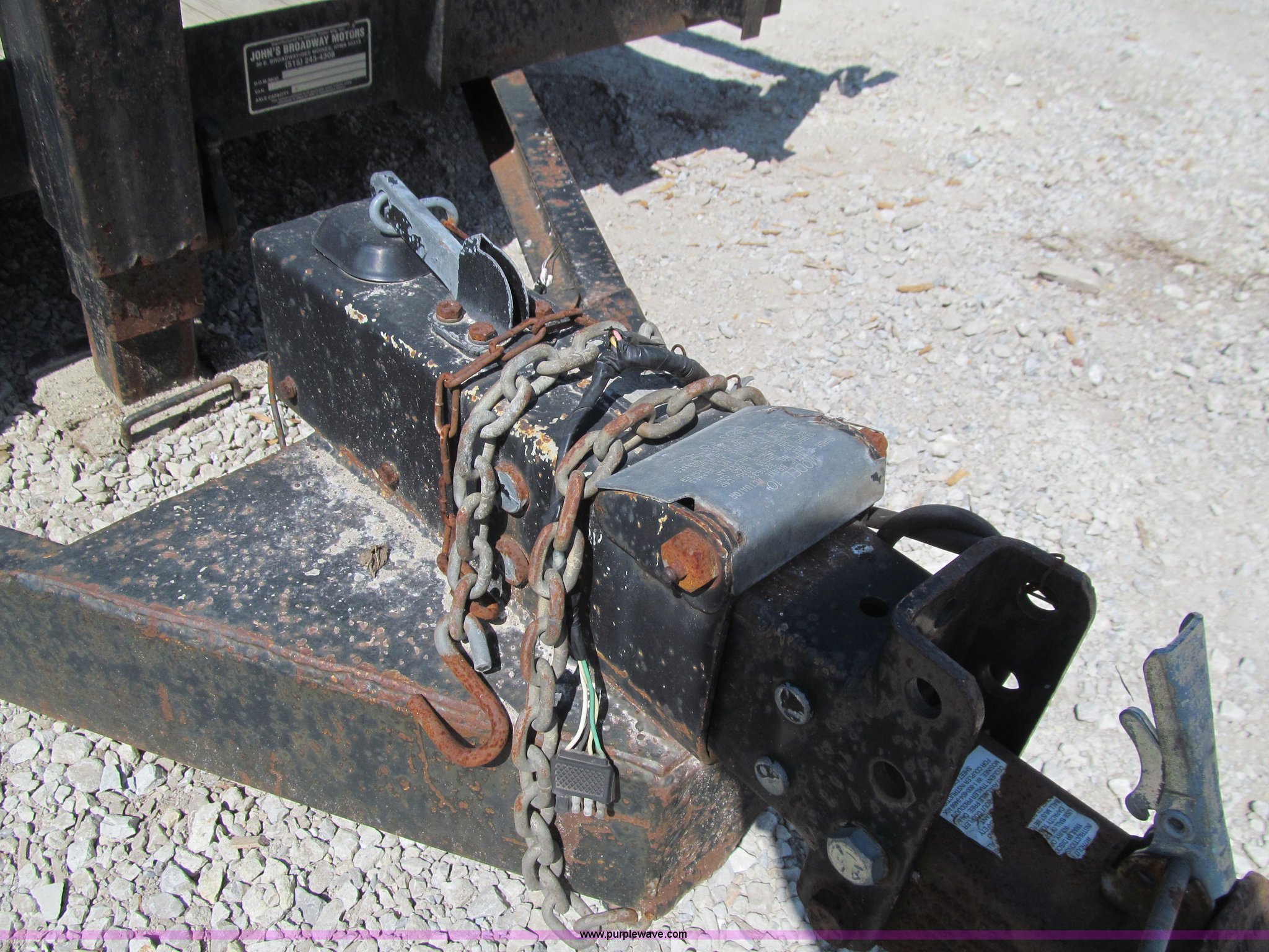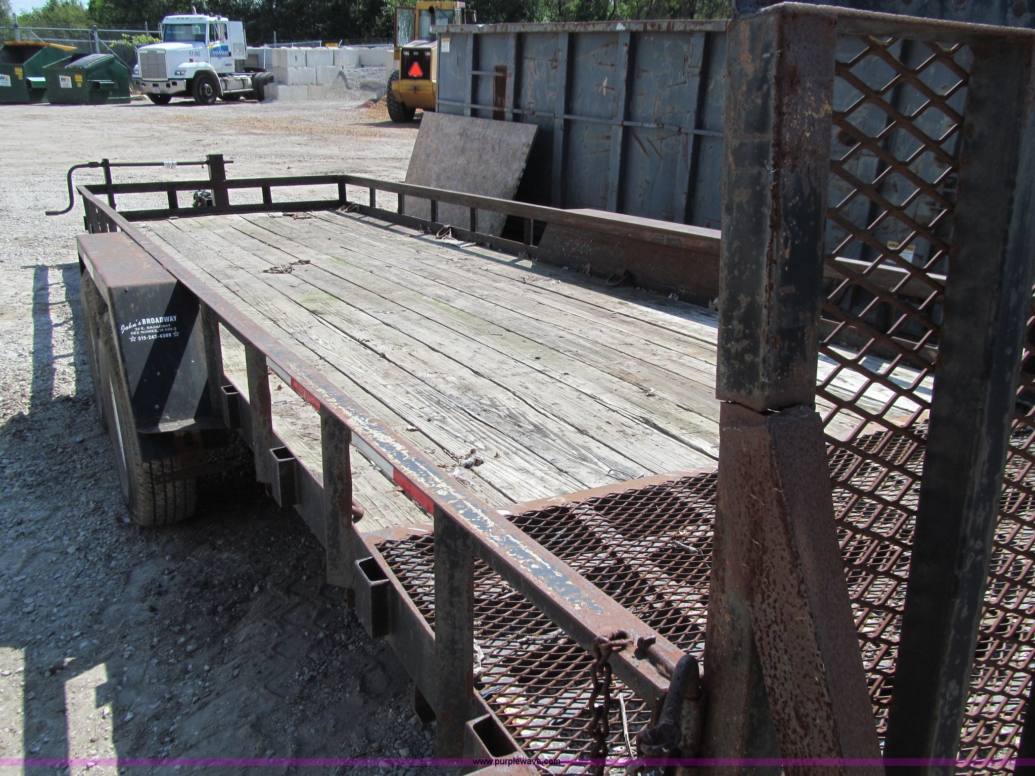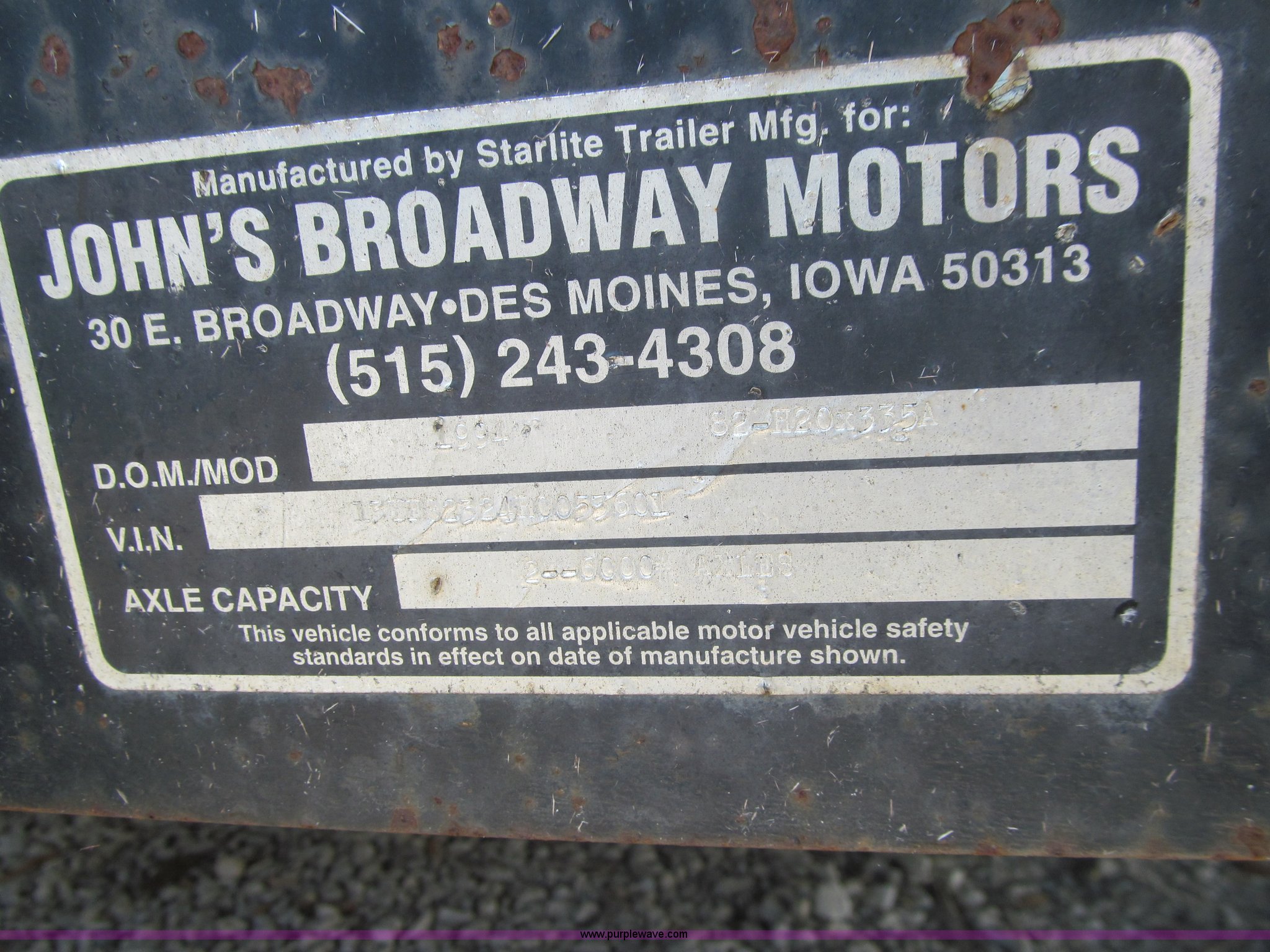 Purple Wave is selling a used Equip. Trailer in Iowa. This item is a 1994 John's Broadway equipment trailer with the following: Model 82-H20X335A, 81" x 238" wood deck, 81" x 36" expanded metal beaver tail, 84" x 40" split loading ramps, 2 5/16" ball hitch, Spring suspension, Hydraulic surge brakes, ST225/75R15 tires, GVWR 12,000 lbs, Front jack stand bent