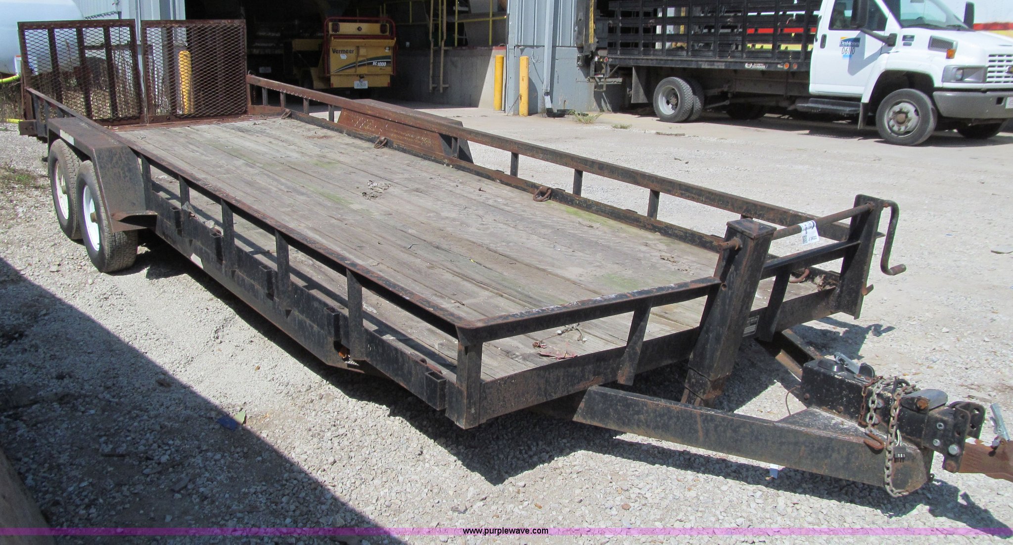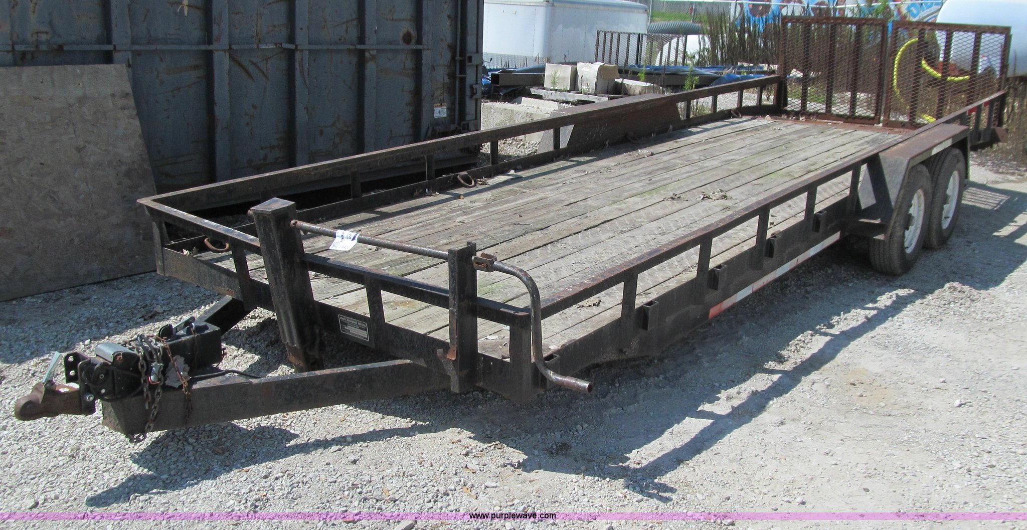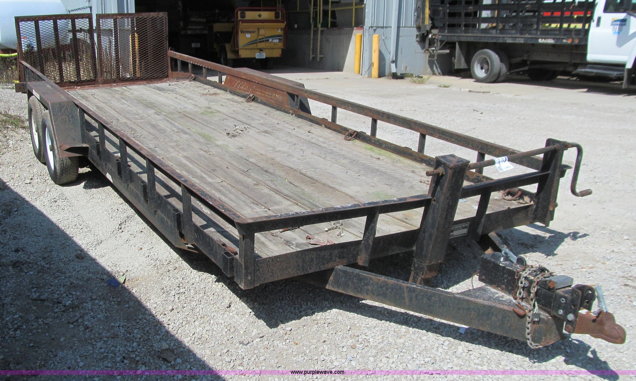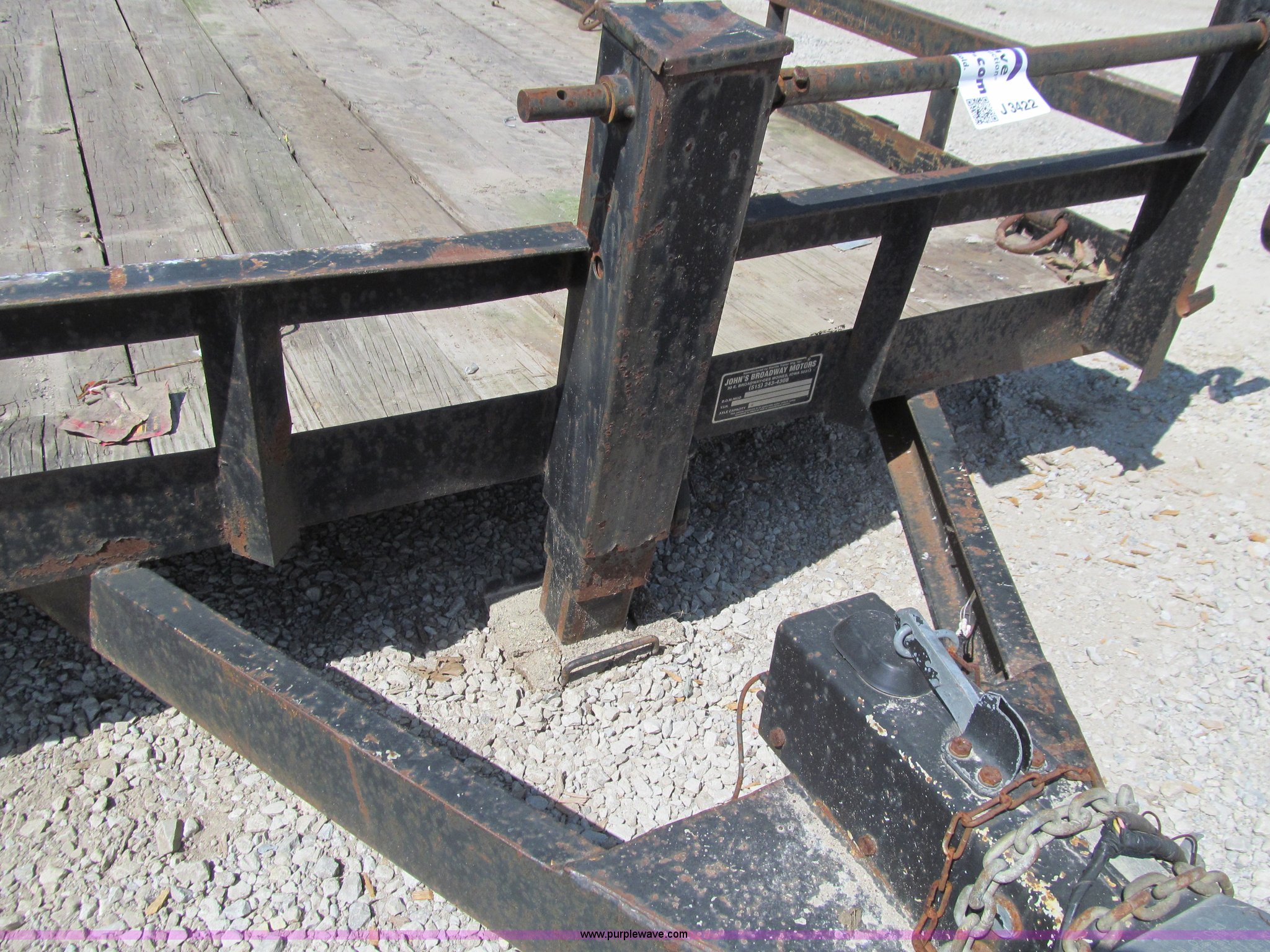 Purple Wave is selling a used Equip. Trailer in Iowa. This item is a 1994 John's Broadway equipment trailer with the following: Model 82-H20X335A, 81" x 238" wood deck, 81" x 36" expanded metal beaver tail, 84" x 40" split loading ramps, 2 5/16" ball hitch, Spring suspension, Hydraulic surge brakes, ST225/75R15 tires, GVWR 12,000 lbs, Front jack stand bent