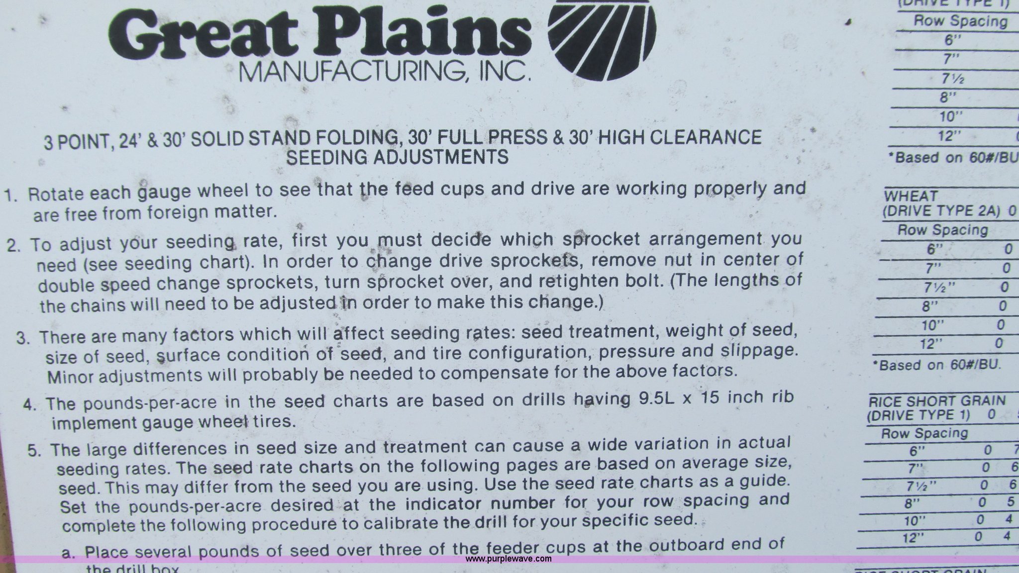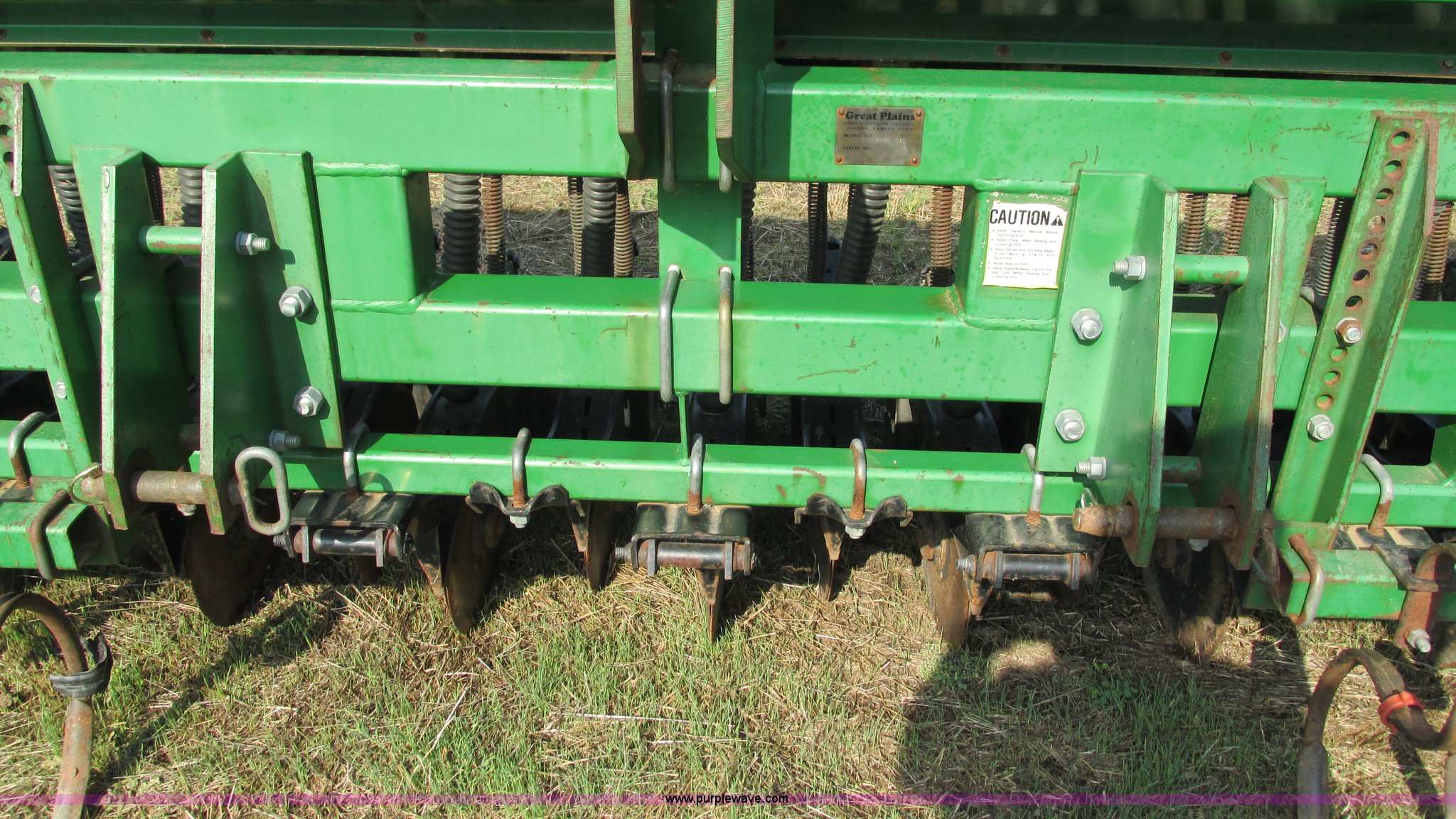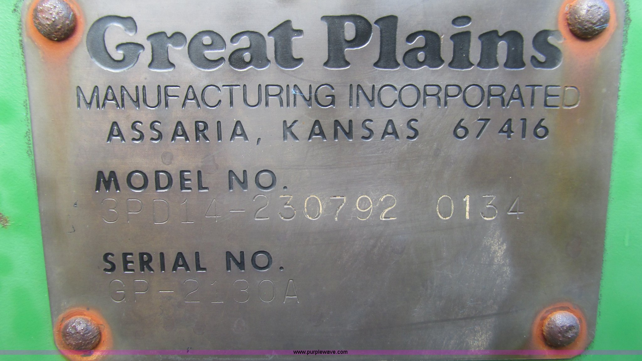 Purple Wave is selling a used Grain Drill or Seeder in Missouri. This item is a Great Plains Solid Stand 14 grain drill with the following: Model 3PD142307920134, 14'W, 23 rows, 7" spacing, Bulk fill, Mechanical delivery, Three point hitch, Track scratchers, Wide gauge wheels, 19.5-15 operation tires, 235/75R15 stabilizer tires, Serial GP21308