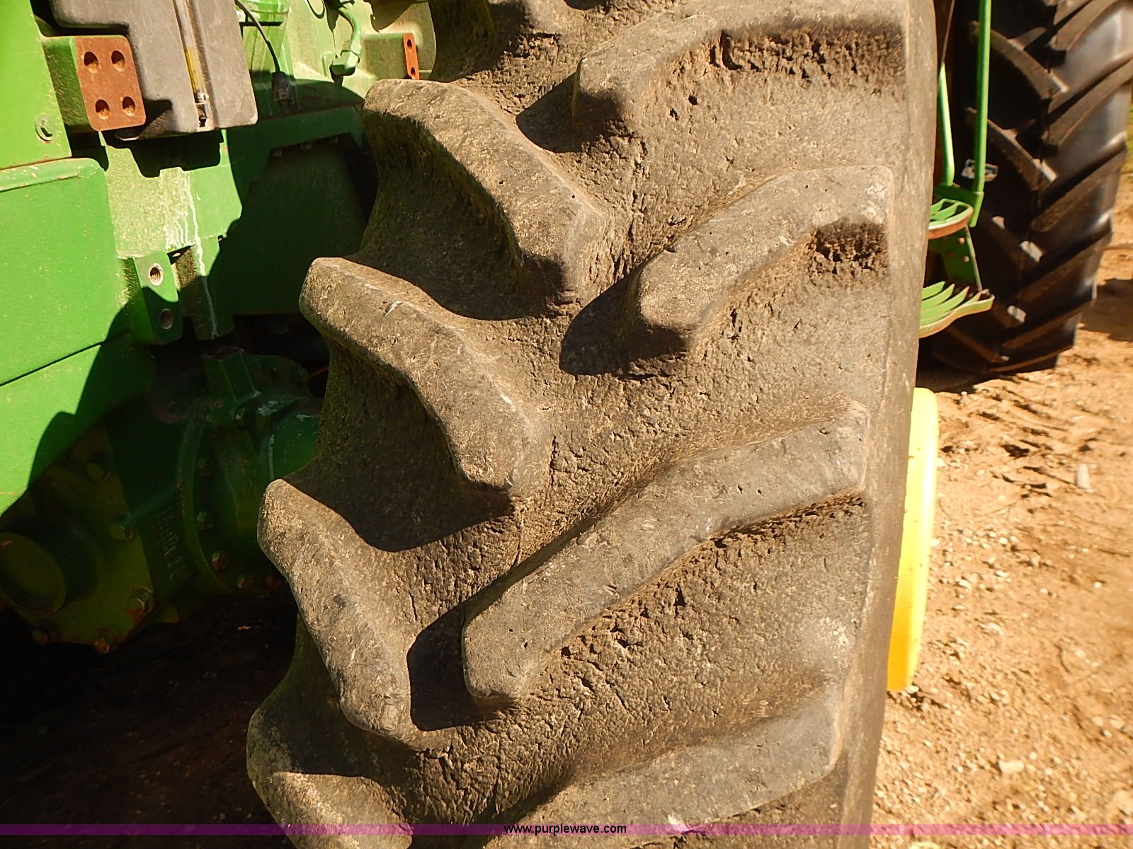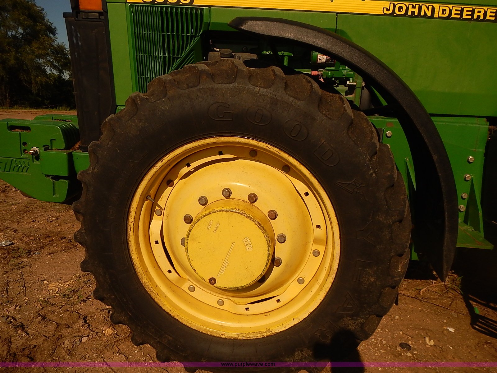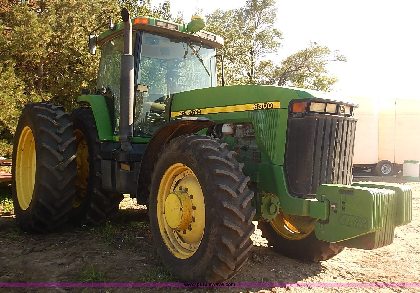 Purple Wave is selling a used Tractor in Kansas. This item is a 1997 John Deere 8300 MFWD tractor with the following: 9,745 hours on meter, John Deere six cylinder turbo diesel engine, 200 HP, Serial SE6081H390632, Powershift transmission, 16F-4R gears, Differential lock, AC and heat, AM/FM/cassette/weatherband, Spring suspension seat, Instructor's seat, Tilt steering wheel, Work lights, Front and rear windshield wipers, Block heater, Front fenders, Three point, Quick attach, Draw bar, Auxiliary outlet, Large 1000 PTO, (4) rear hydraulic remote sets, (18) suitcase weights, Front wheel weights, 135 gallon fuel tank, Goodyear 385/85R24 front tires, New Mitas 480/80R46 dual rear tires, Auto steer equipment not included, Engine replaced at 9,200 hours, Serial RW800P012242