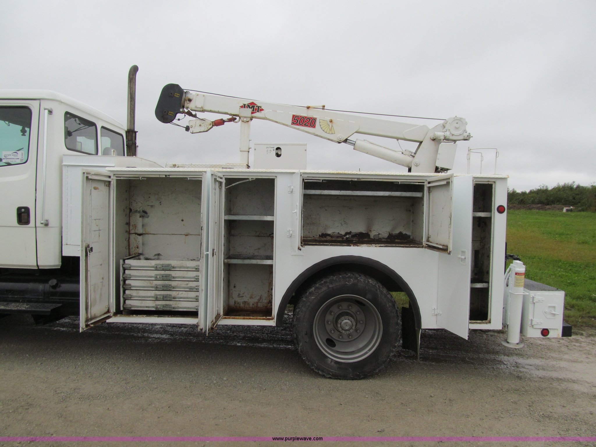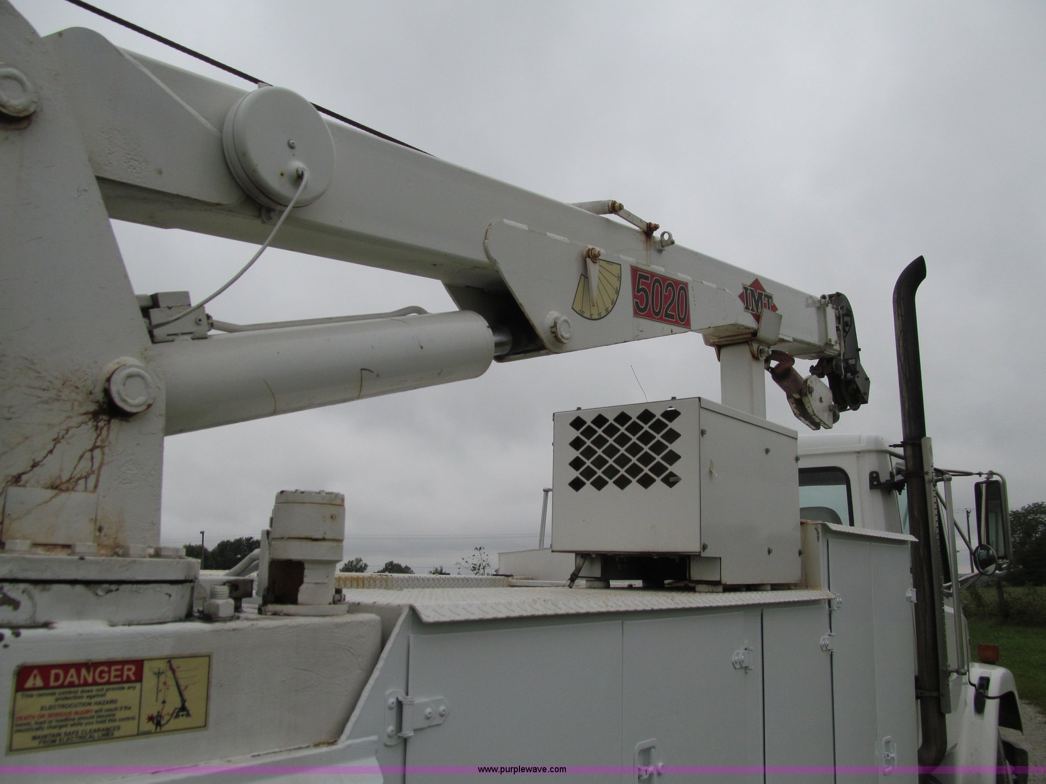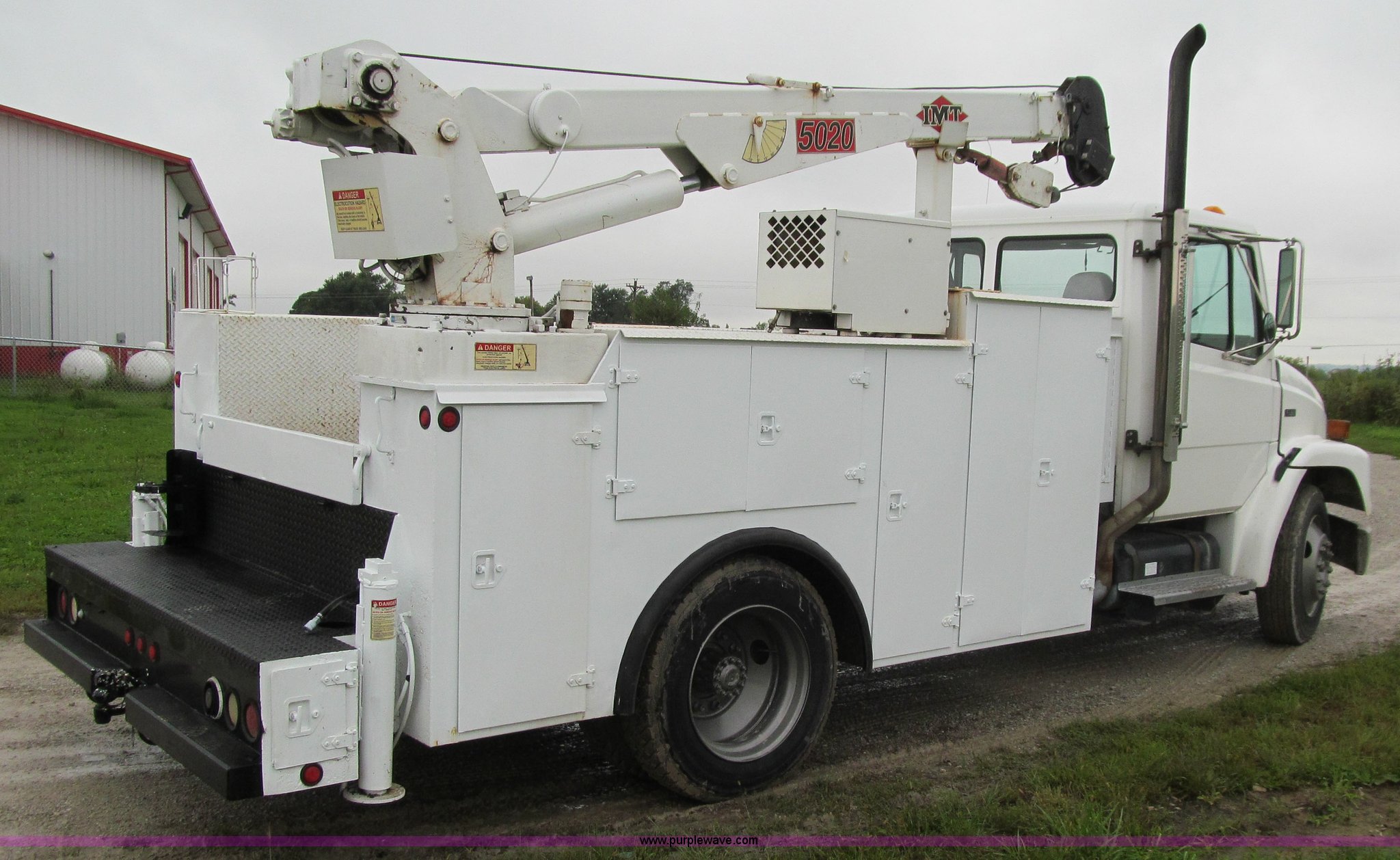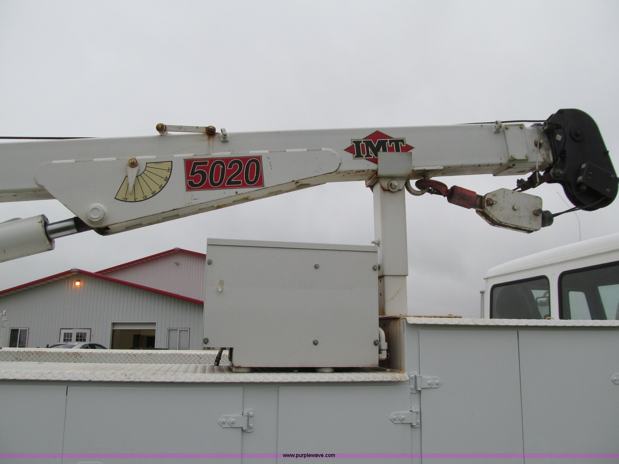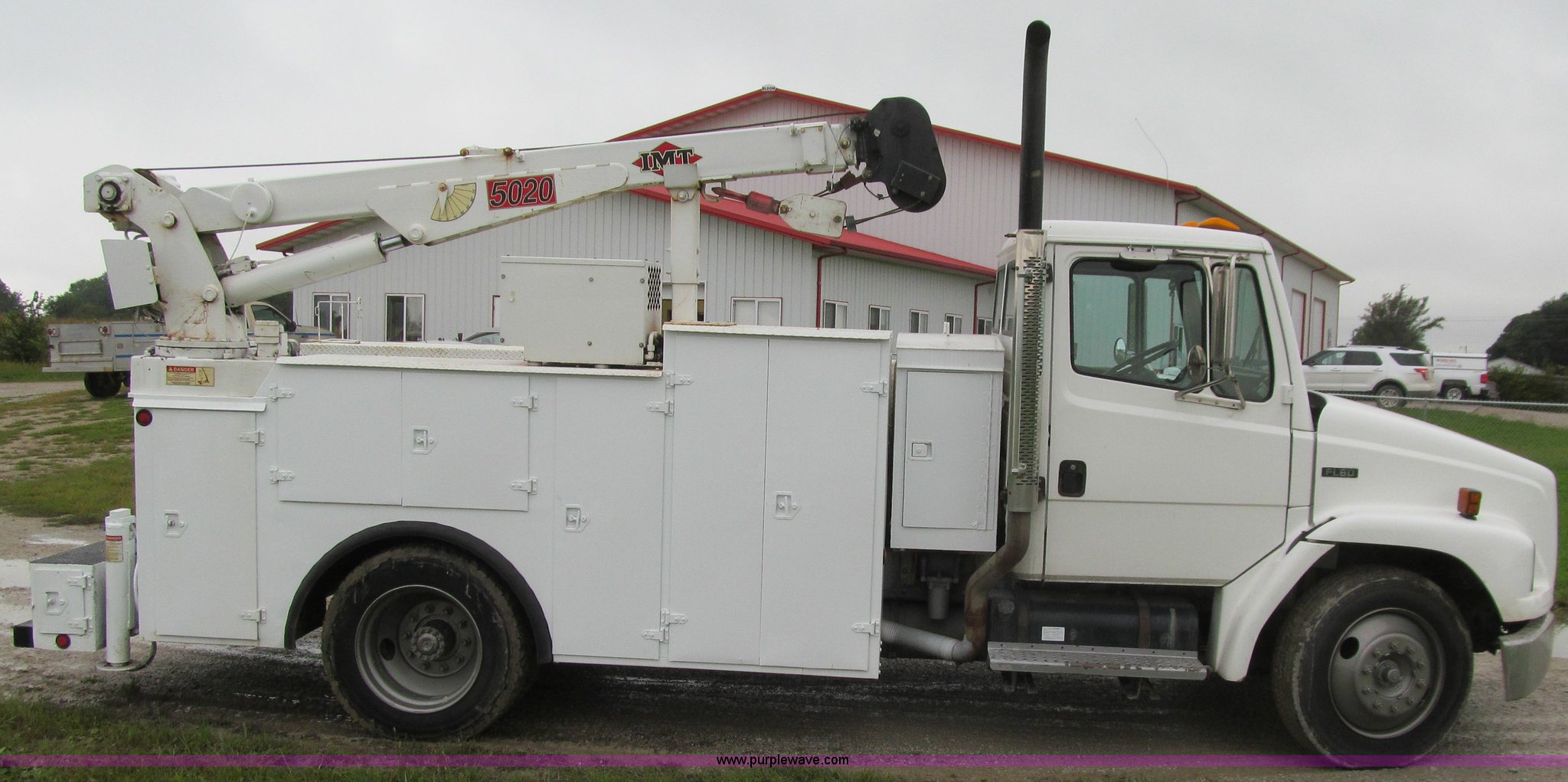 Purple Wave is selling a used Service Truck in Iowa. This item is a 1999 Freightliner FL60 service truck with the following: 275,104 miles on odometer, Caterpillar 3126 7.2L L6 turbo diesel engine, 210 HP, Five speed manual transmission, Two speed rear end, AC and heat, Tilt, Cruise, AM/FM/Weather band, Manual windows and locks, Telescoping steering wheel, Air suspension seat, Cloth interior, Chelsea PTO, 11'L service bed, Four compartments per side, Tailgate, Bumper, IMT DA435HAR air compressor, Hose, Reel, Rear hydraulic outriggers, IMT 5020 crane, Three sections, 8,600 lbs maximum lift capacity,, 18" storage box, Dual fuel tanks, Spring suspension, Hydraulic brakes, 3:91 gear ratio, 162" wheelbase, 235/80R22.5 front tires, 245/75R22.5 rear tires, GVWR 25,500 lbs, FAWR 8,000 lbs, RAWR 17,500 lbs, Non-operational odometer