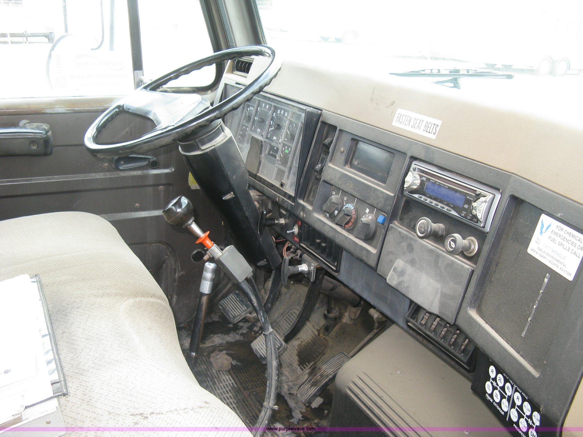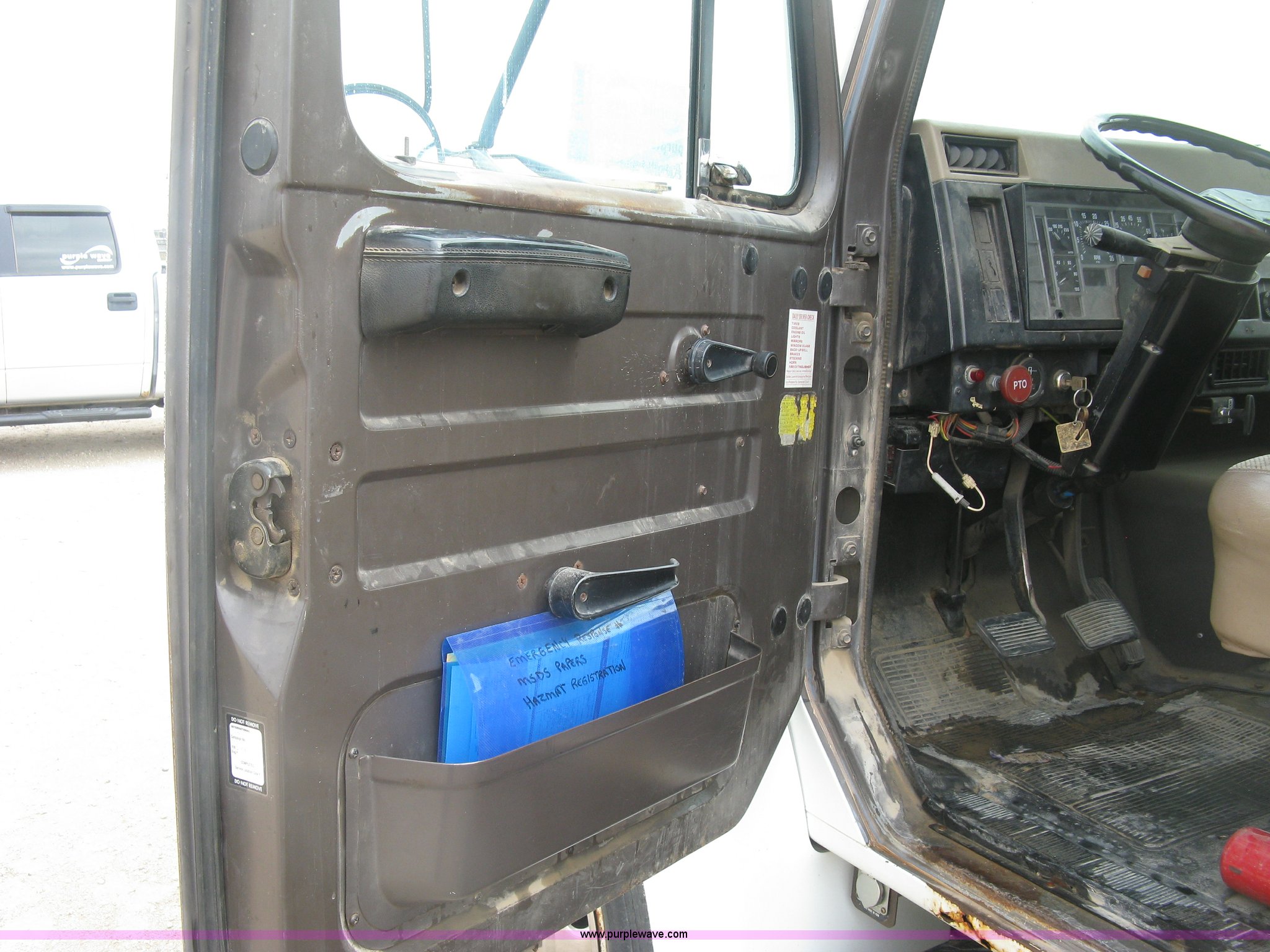 Purple Wave is selling a used Tank Truck or Water Truck in Kansas. This item is a 1992 International 4700 fuel tanker truck with the following: 218,731 actual miles, 5,022 hours on meter, International DT360 5.9L L6 diesel engine, Spicer Double Duty D five speed transmission, Two speed rear end, AC and heat, JVC AM/FM/CD, Manual windows and locks, Cloth interior, PTO, Beall 1,500 gallon tank bed, Four compartments, 600 gallon, 300 gallon, 200 gallon, and 400 gallon capacities, Fuel metering system, Electric driven hose reel, Hose, Nozzle, Caution light, Spot lights, Block heater, Single fuel tank, Rear exhaust, Spring suspension, 218" wheel base, 225/70R22.5 tires, FHWA April 2013 annual inspection, Dash cluster has been replaced, Rust, Unit# FTRK001