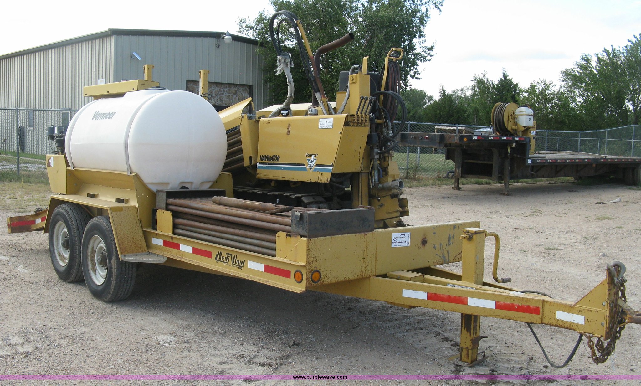 1996 Vermeer D7X11A Navigator directional drill. 1,334 hours on meter, Kubota V1505-E four cylinder diesel engine, Side mounted open operator station, Walk-behind travel control, 9"W steel tracks, Vermeer MT300 mud pump station Kohler Command Pro Series gas engine 12.5 HP, 300 gallon poly tank, Carrier with fork slots, Serial 1VRM120S7T1000636, Approximately 26 drill stems on machine 6'L, Approximately 56 drill stems on rack 6'L, (2) auger drill ends, 1997 Redihaul flatbed equipment trailer 14'L x 78"W wood deck, 3'L dovetail, Dual 5'L x 15"W folding ramps, Adjustable height pintle hitch, Spring suspension, 9.50-16.5 tires, GVWR 17,150 lbs, Portions of deck damaged, Serial 1VRS130N1T1000106. 47SS142T3V1012068. Nowak Construction. 200 S. Goddard Road. Goddard, KS 67052