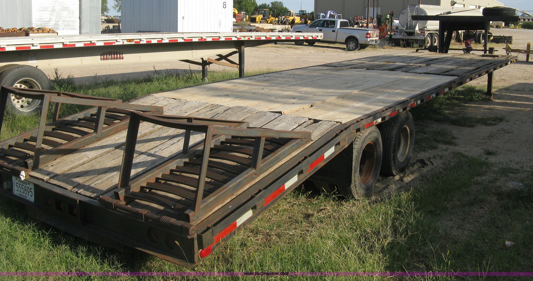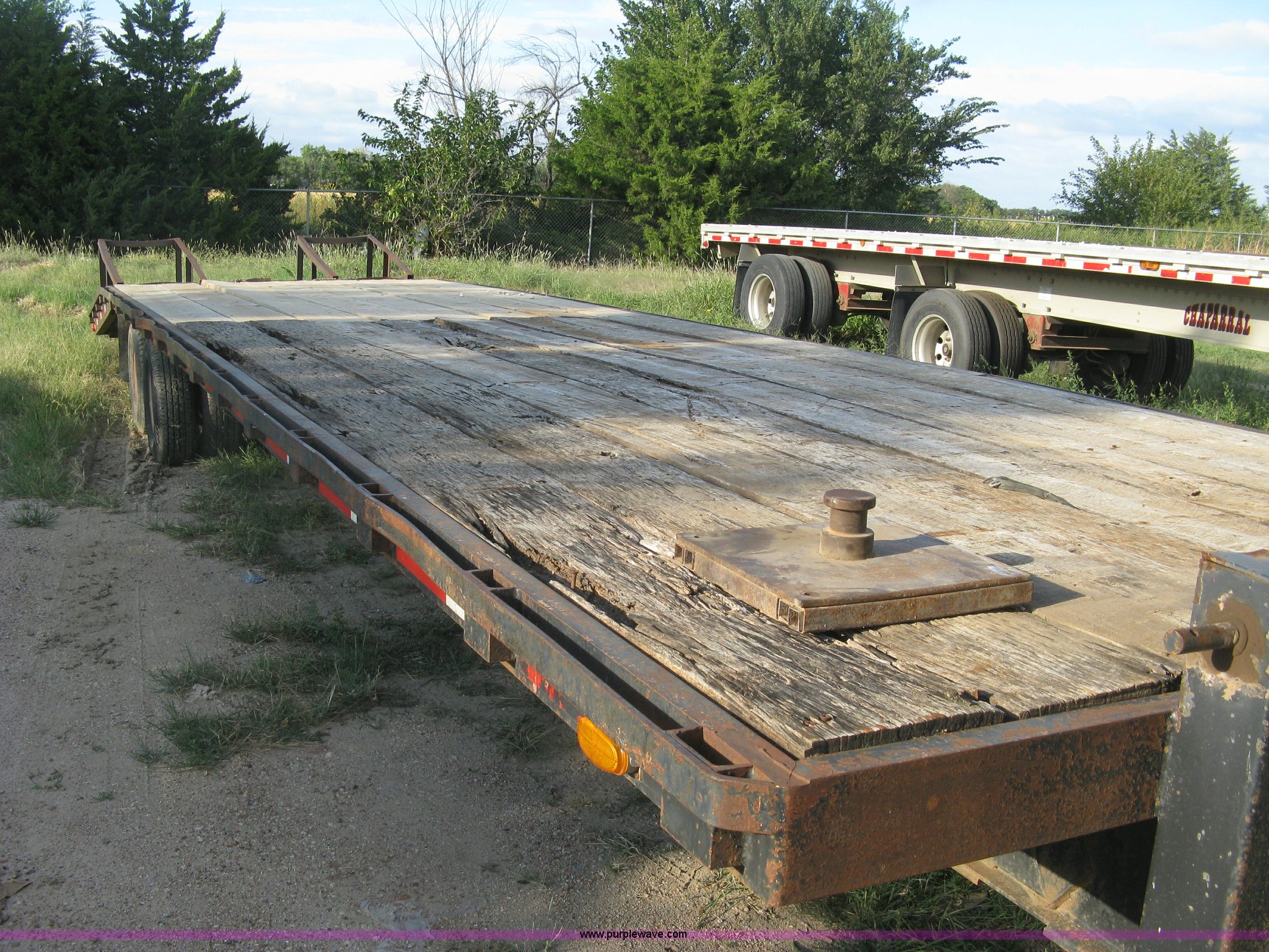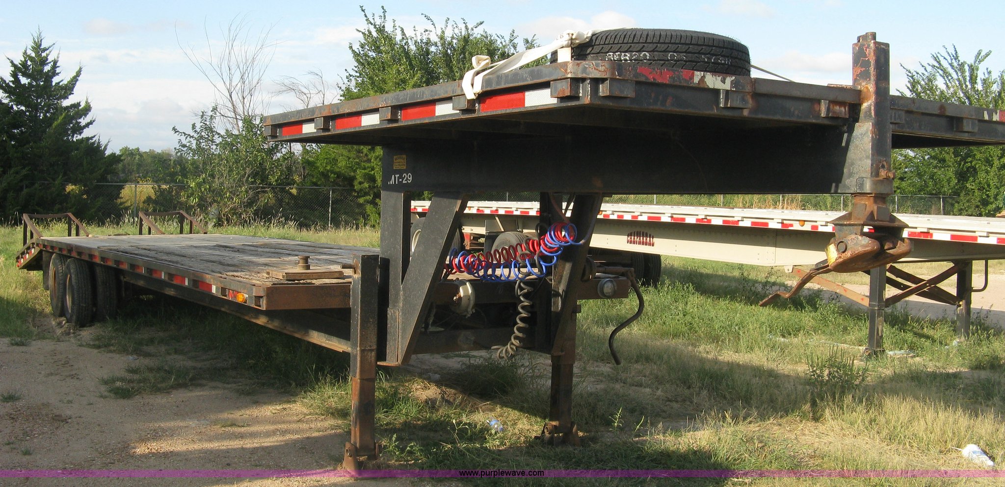 Purple Wave is selling a used Equip. Trailer in Kansas. This item is a 1998 Overbilt flatbed trailer with the following: 29'L x 8'W main deck, 80"L dovetail, 110"L upper deck, 63"L x 27"W folding ramps, Wood deck, Stake side pockets, Tie-down rails, Two post landing gear, Oil bath hubs, Adjustable height gooseneck hitch with fifth wheel adapter, Weld repairs, Spring suspension, LT235/85R16 tires, GVWR 30,652 lbs, Unit# MT29