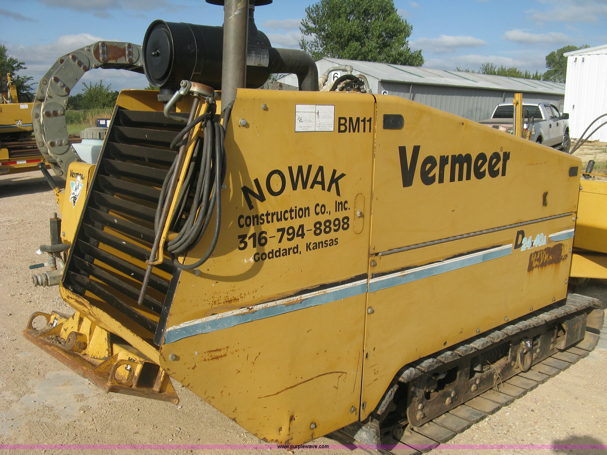 1995 Vermeer D24X40A directional drill. 4,807 hours on meter, Cummins 3.9L four cylinder diesel engine 125 HP, Serial 45930826, Side mounted open operator station, Walk-behind travel control, Approximately 55 drill stems 10'L, 16"W triple grouser tracks Rubber in-lay, Worn, Serial 1VRS160ZXY1001248, Unit# BM11. Nowak Construction. 200 S. Goddard Road. Goddard, KS 67052