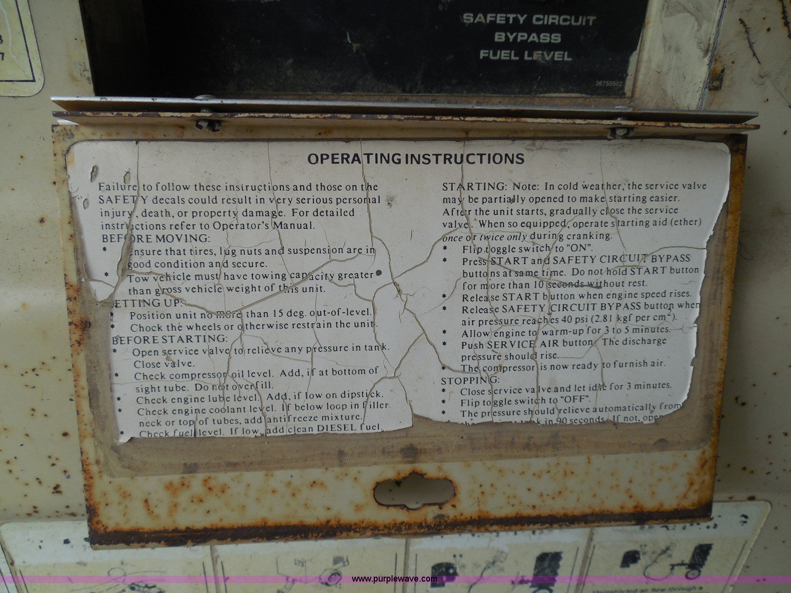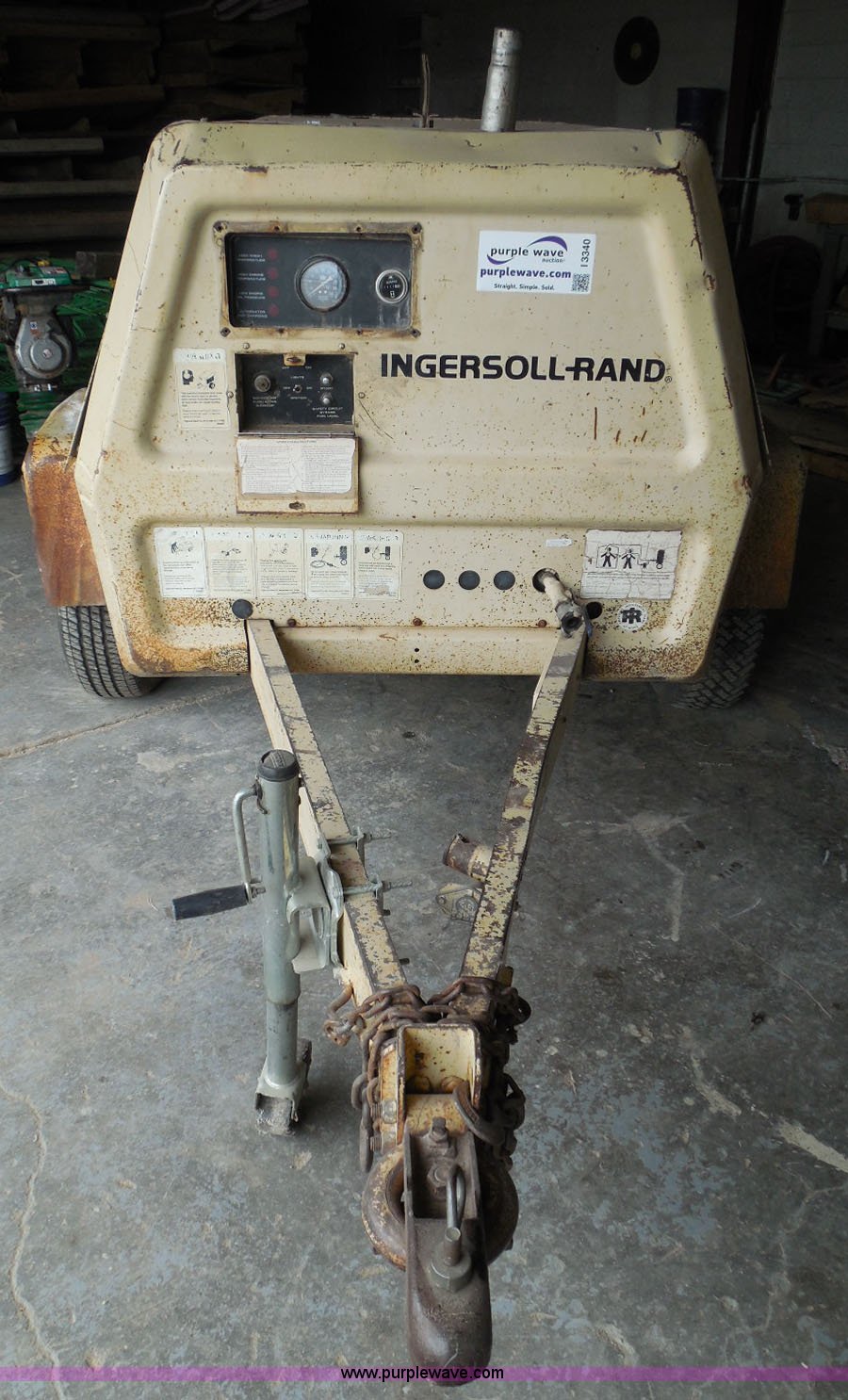 Purple Wave is selling a used Air Compressor in Kansas. This item is a Ingersoll Rand 130 air compressor with the following: 1,079 hours on meter, John Deere three cylinder diesel engine, Single outlet, GR78-15 left tire, P215/75R15 right tire, Non-operational unit, Serial 182219U172