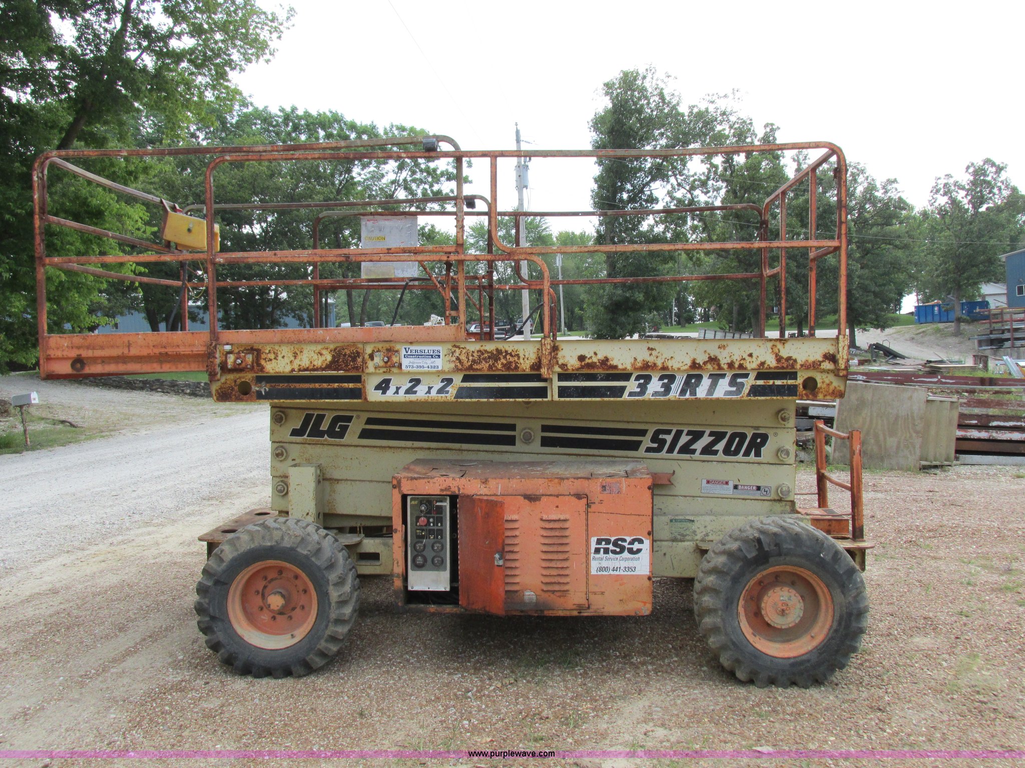 Purple Wave is selling a used Scissor or Vertical Lift in Missouri. This item is a 1996 JLG 33RTS scissor lift with the following: 4,417 hours on meter, Dual fuel four cylinder engine, Gas or propane capable, 10.5'L x 68"W platform, 6'L platform extension, 33' maximum lift height, 12-16.5 tires, Rust, Dents, Serial C0249230200020699
