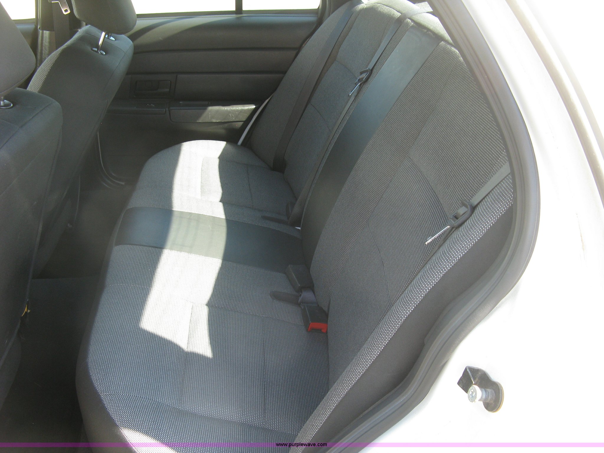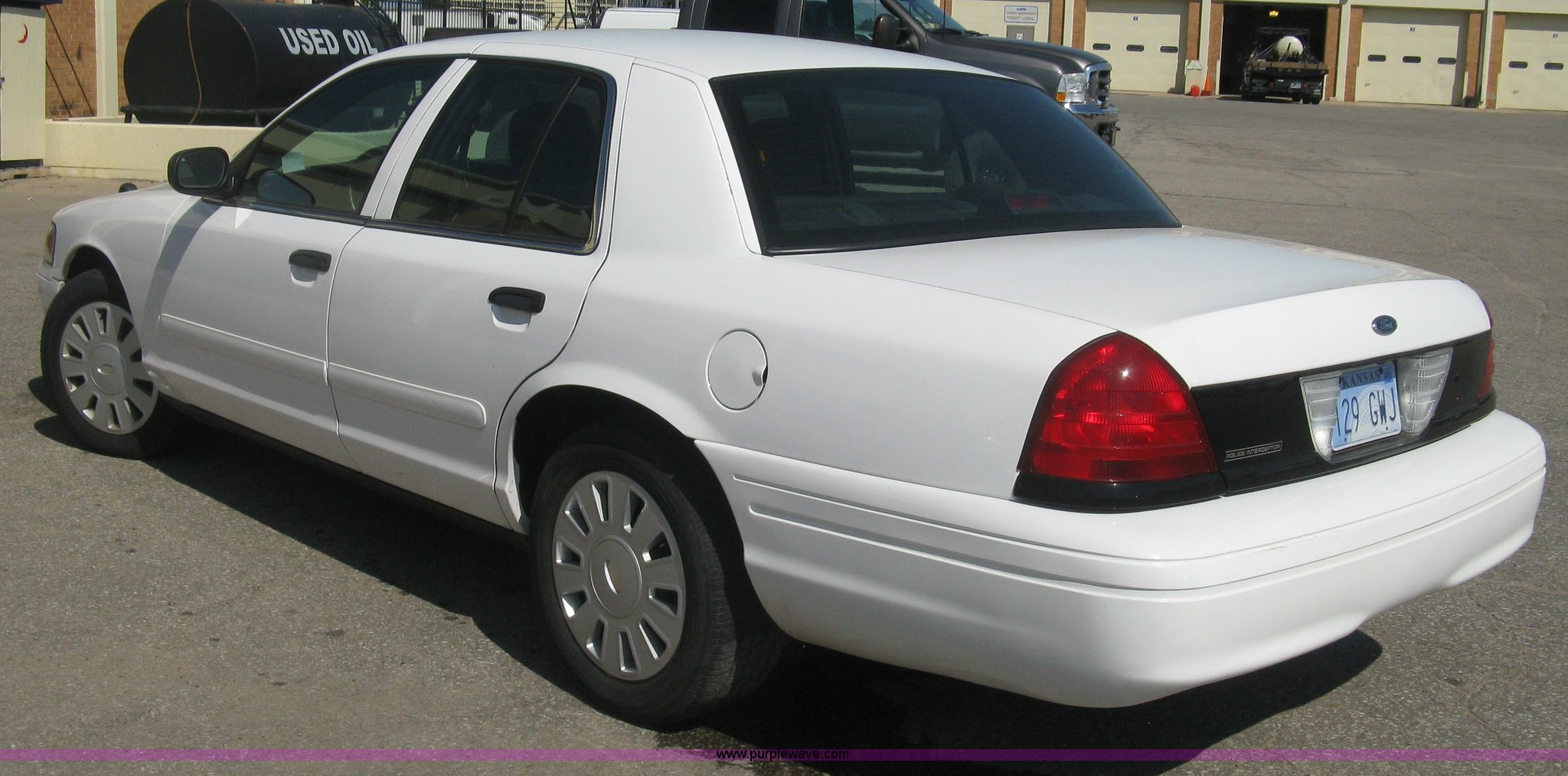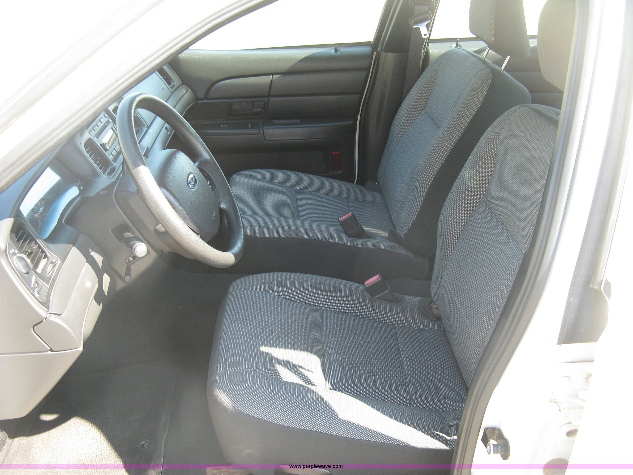 Purple Wave is selling a used Passenger Vehicle in Kansas. This item is a 2007 Ford Crown Victoria Police Interceptor with the following: 115,146 actual miles, 4.6L V8 SOHC 16V gas engine, Automatic transmission, AC and heat, Tilt, Cruise, AM/FM/CD, Power windows, locks, mirrors, and seats, Cloth interior, Push bumper, On-board fire suppression system, P235/55R17 tires, Paint chipped, Front passenger door dented, Unit# 5949