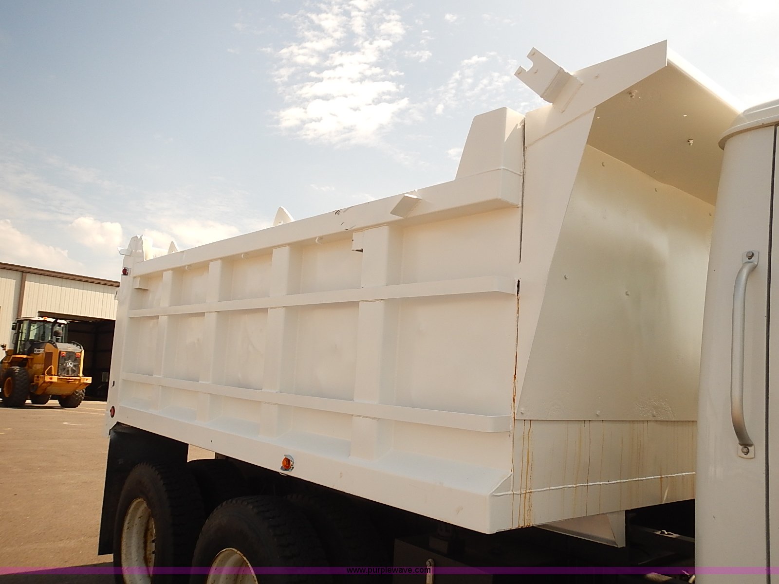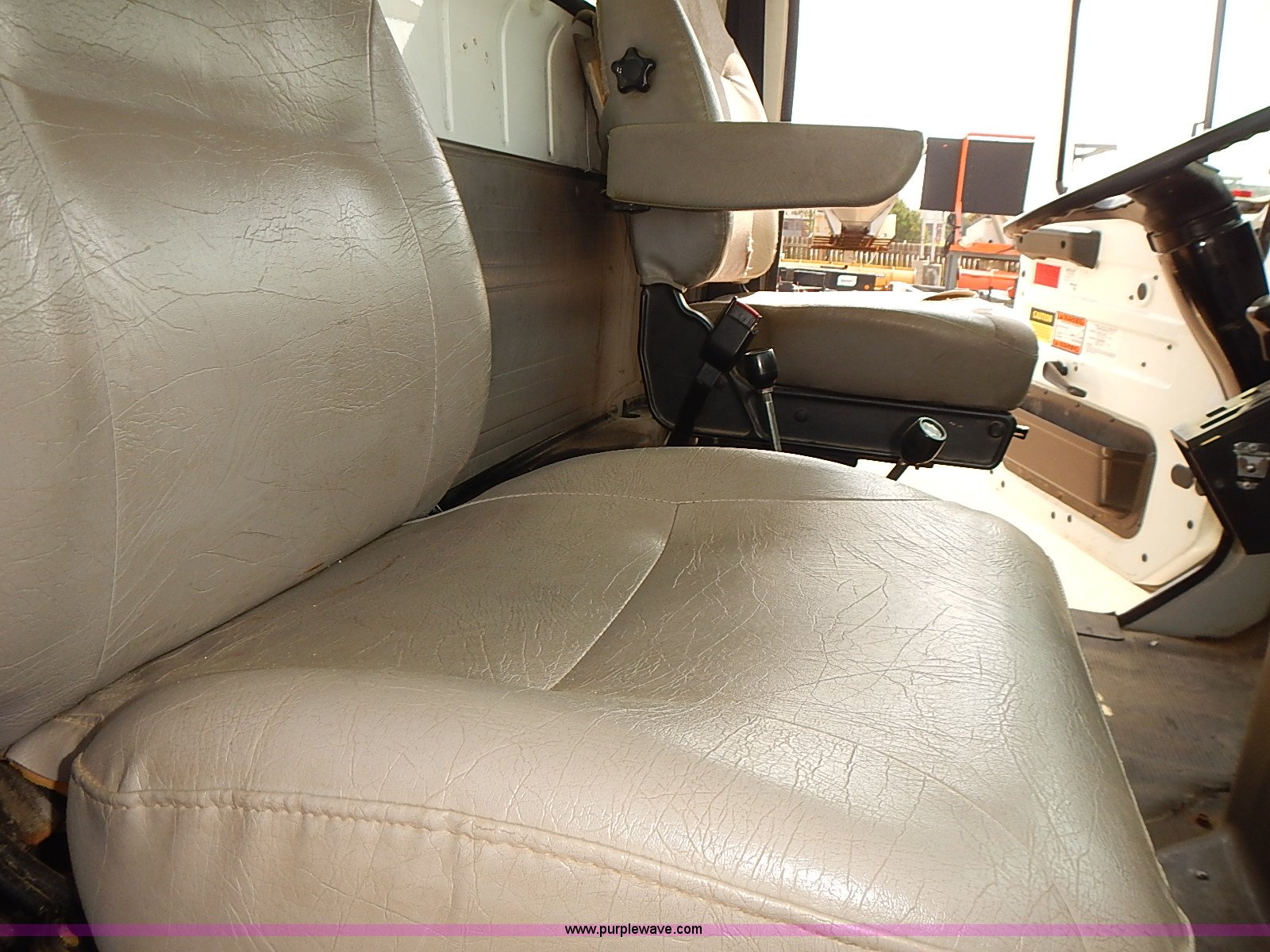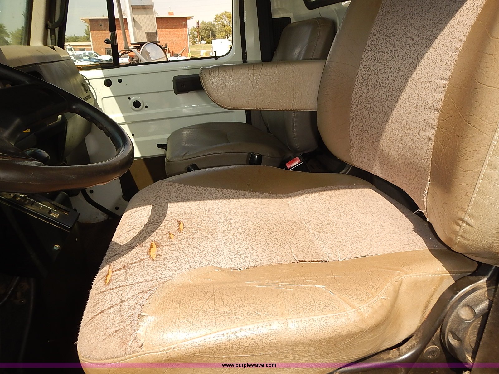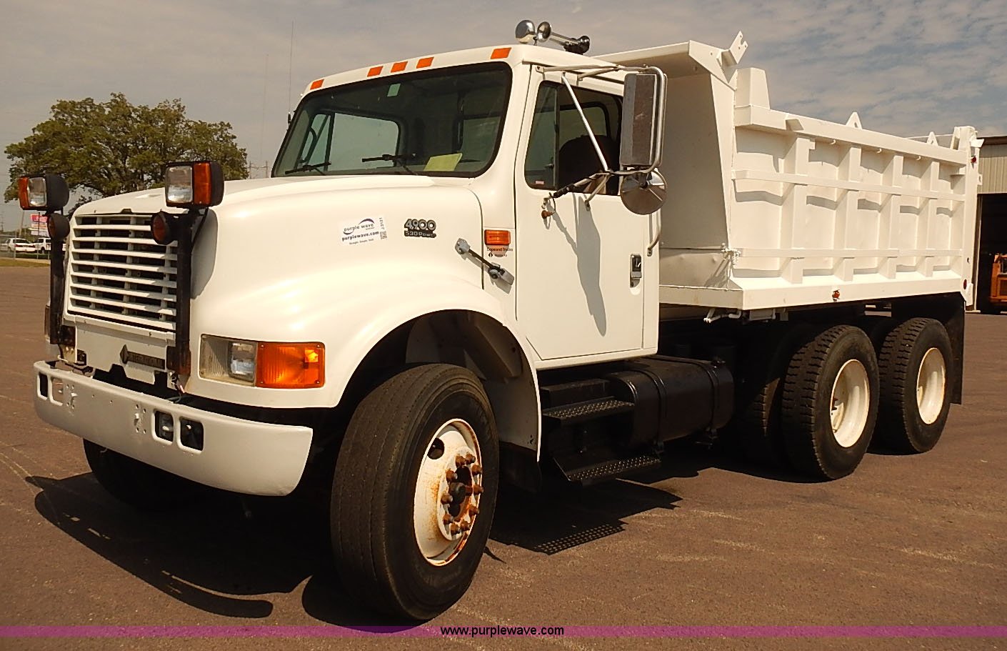 Purple Wave is selling a used Construction Dump Truck in Kansas. This item is a 2000 International 4900 dump truck with the following: 95,367 miles on odometer, 6,133 hours on meter, International DT530 8.7L L6 diesel engine, Automatic transmission, Locking differential, AC and heat, Cruise, AM/FM/cassette, Power windows, Heated mirrors, Chelsea PTO, Gresen GRS11 spreader control, 12'L x 8'W dump bed, Single ram three stage hoist, Air operated end gate, Rear hydraulic remotes, Front and rear tow hooks, Front work lights, Air horn, Block heater, Pintle hitch, Trailer wiring, Spring suspension, Air brakes, 11R22.5 tires, Maintenance records available