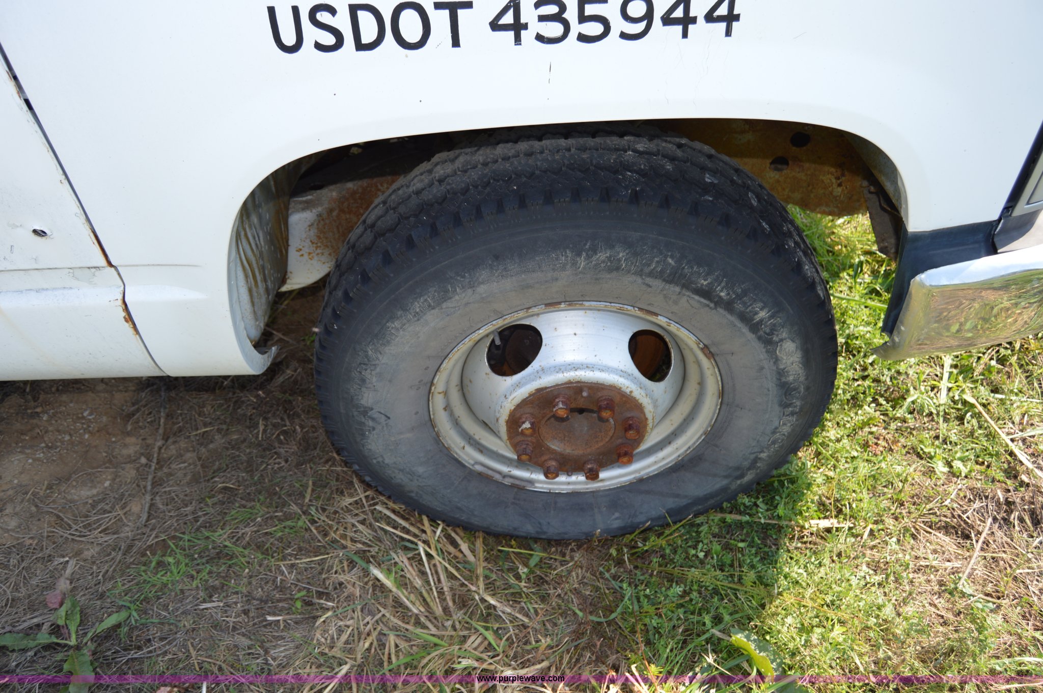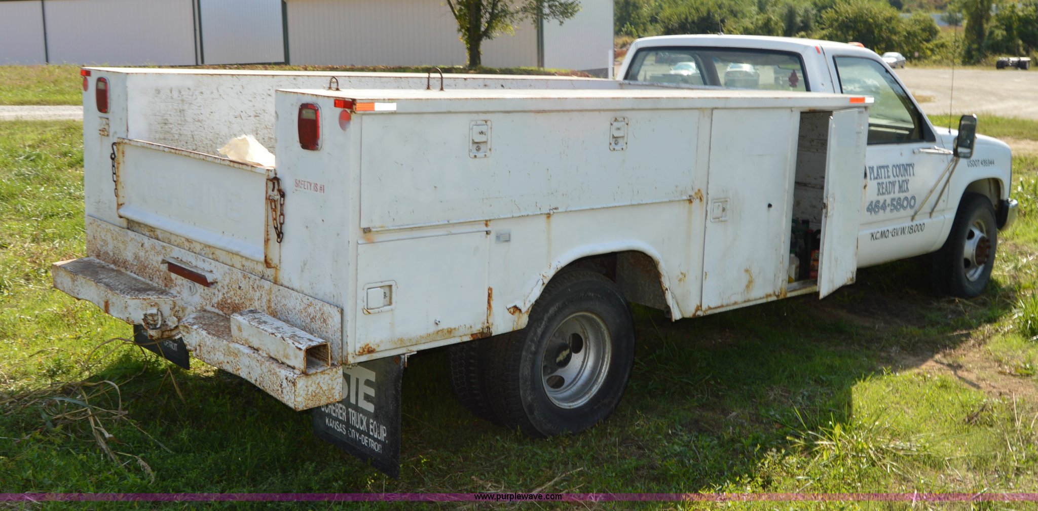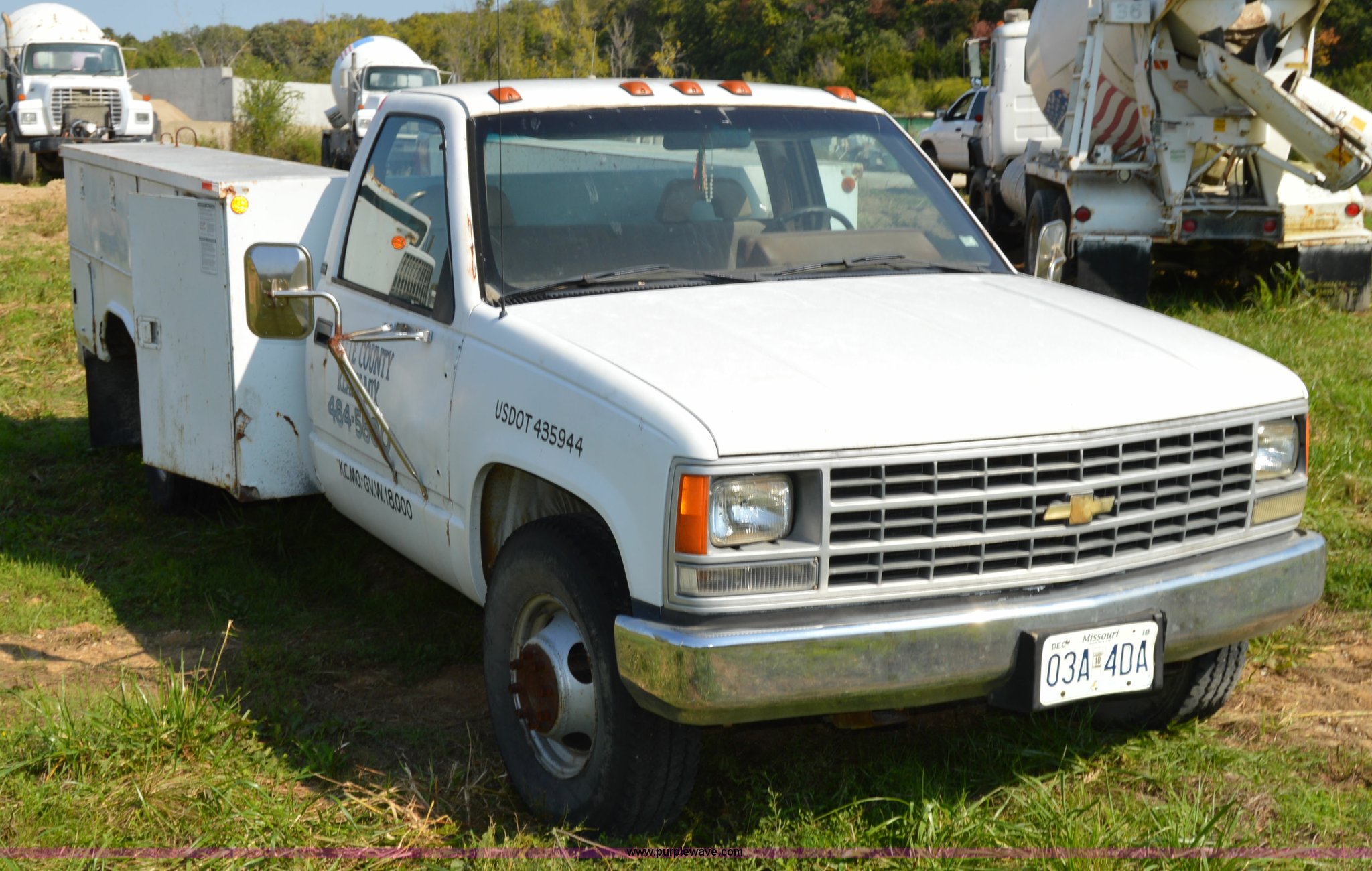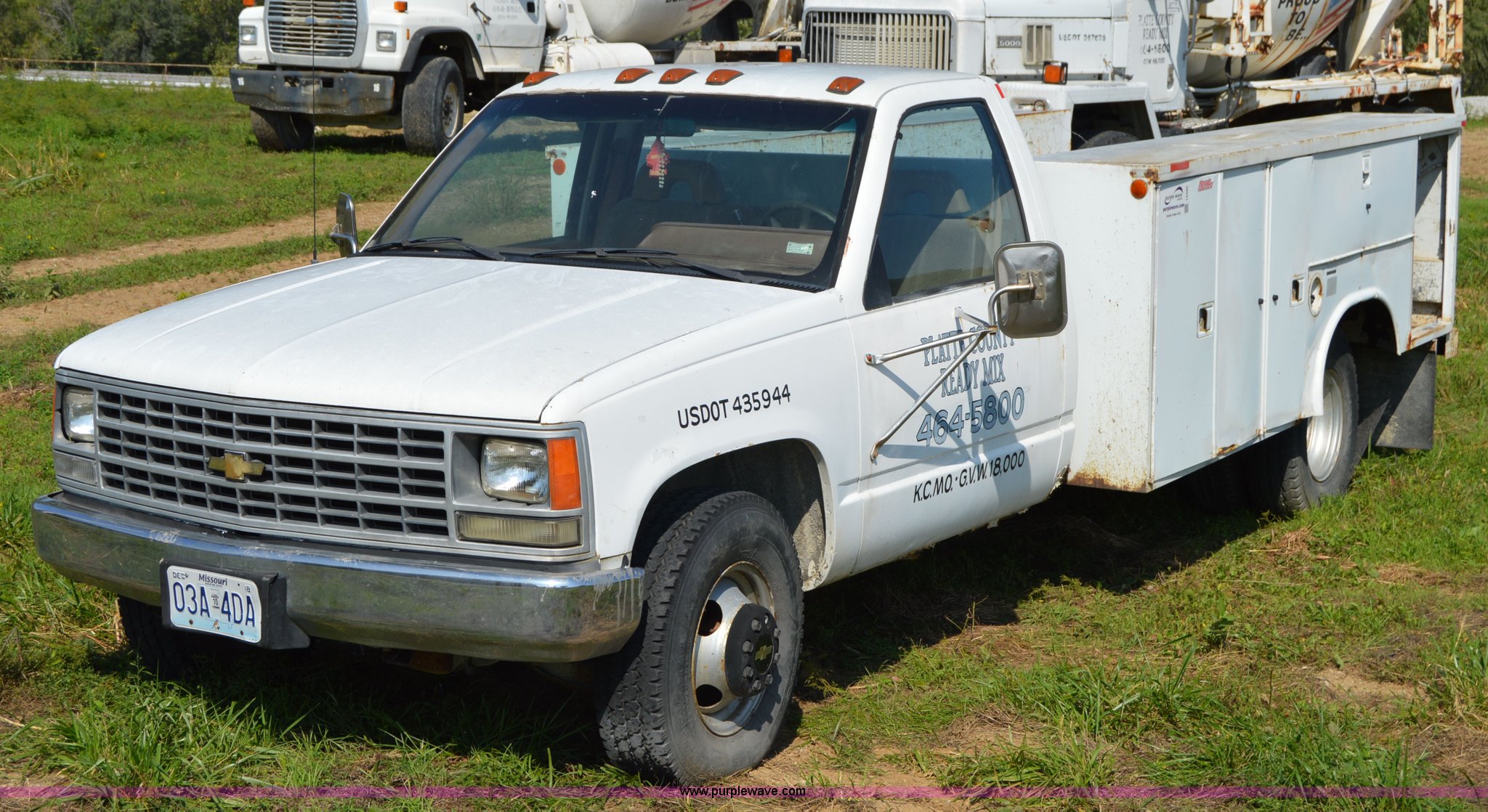Purple Wave is selling a used Service Truck in Missouri. This item is a 1991 Chevrolet 3500 utility truck with the following: 47,500 miles on odometer, 5.7L V8 OHV 16V gas engine, Automatic transmission, Heat, AM/FM, Manual windows and locks, Cloth interior, 235/85R16 tires, Interior/exterior cosmetic damage, Dead battery, Turns over but will not start, Unknown running condition, Rear tire has tread falling off, Toolbox not included