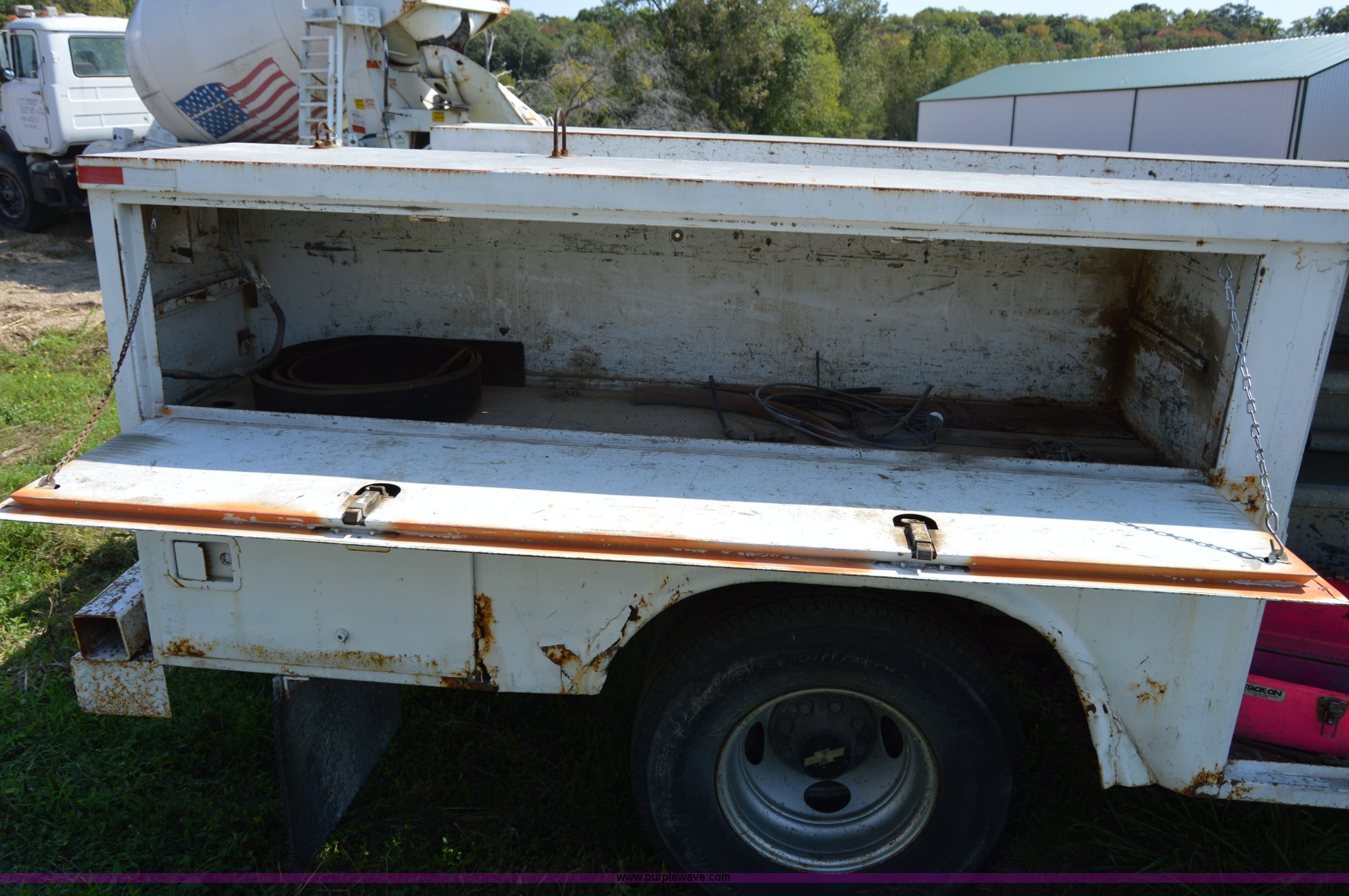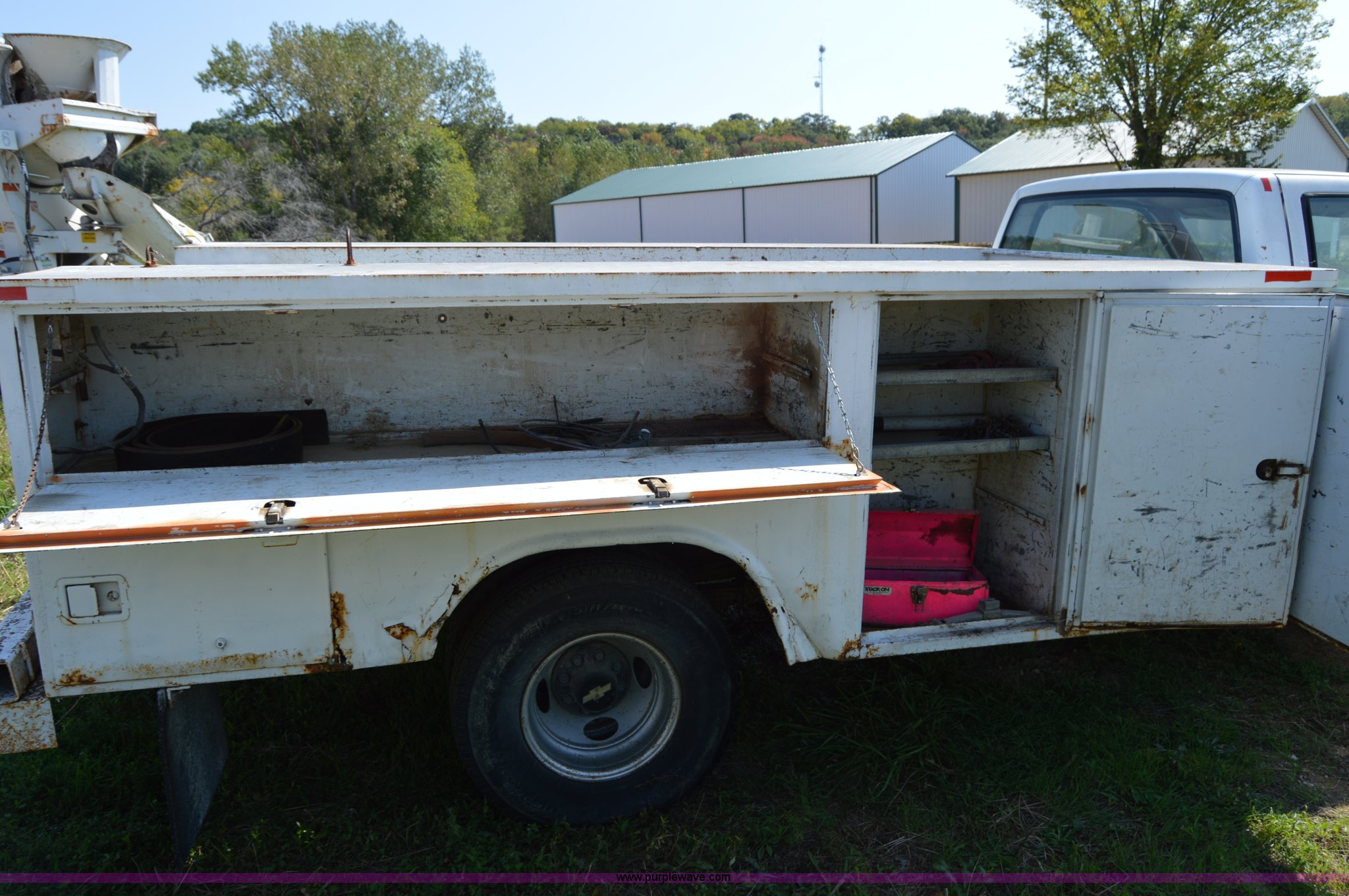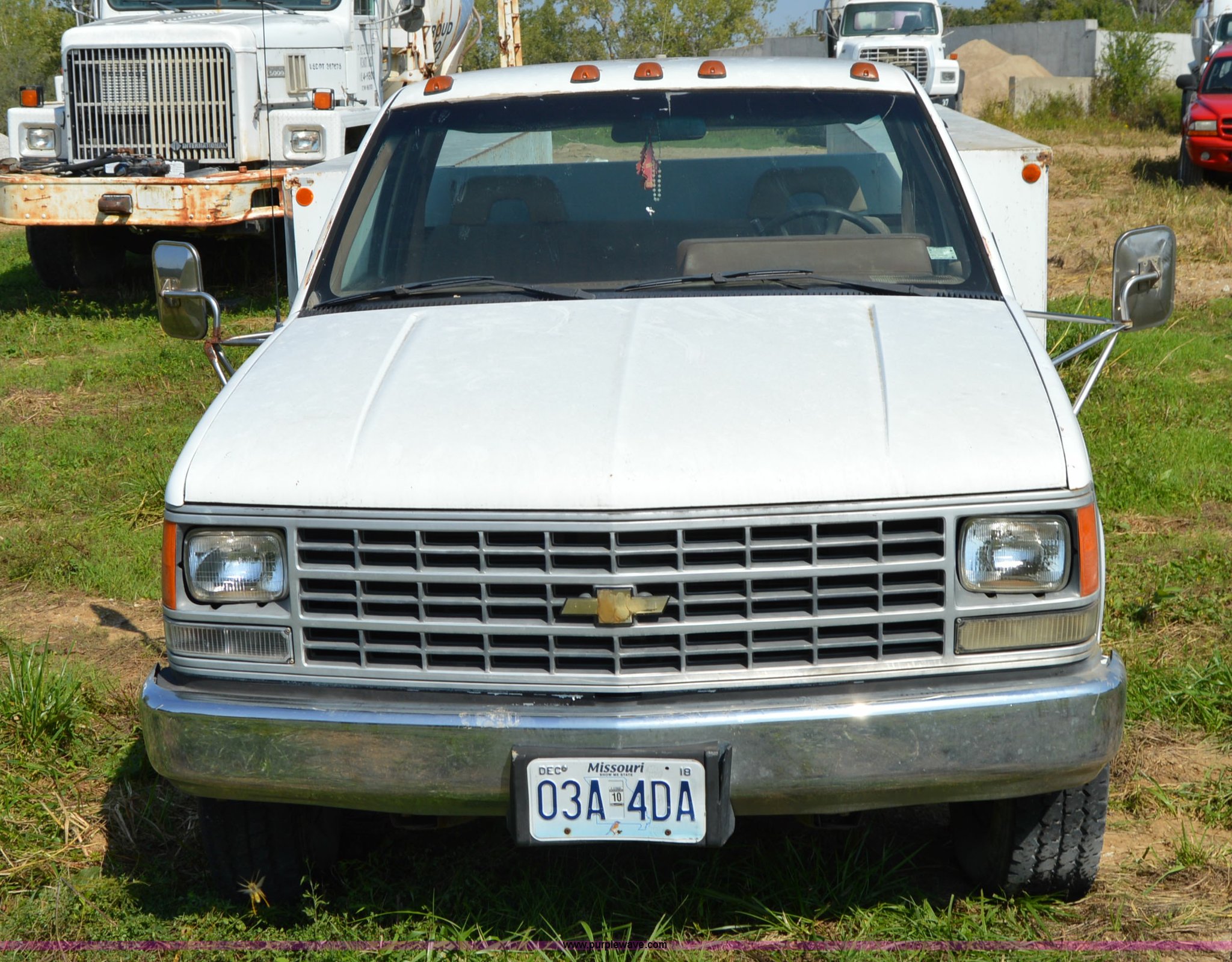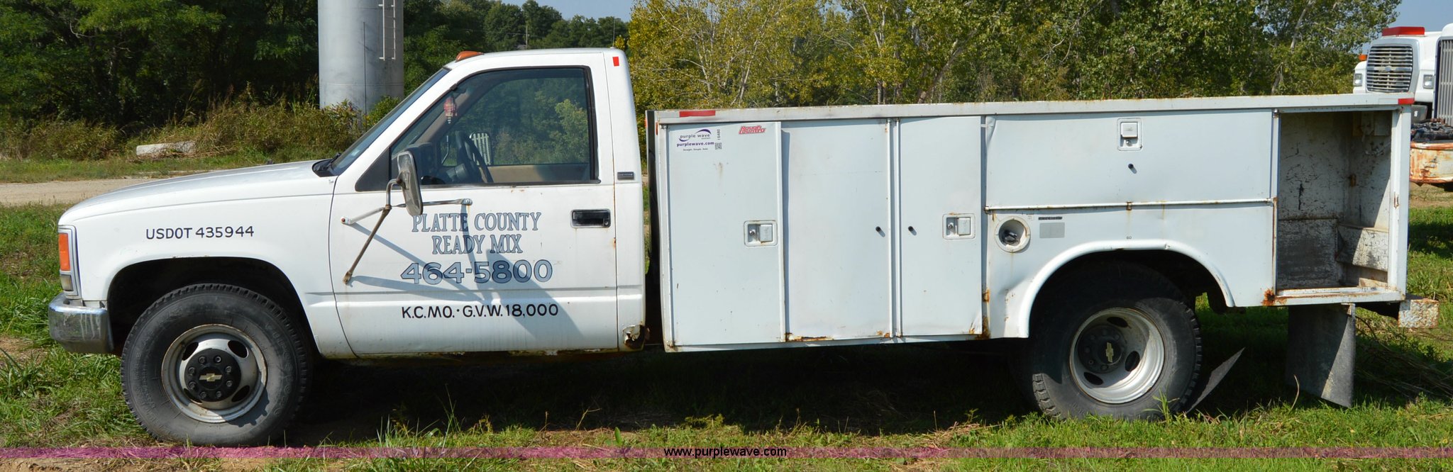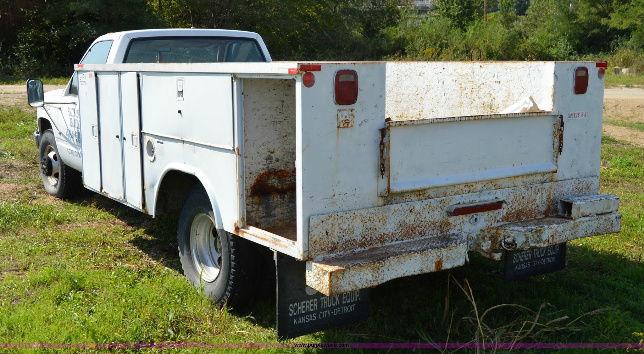 Purple Wave is selling a used Service Truck in Missouri. This item is a 1991 Chevrolet 3500 utility truck with the following: 47,500 miles on odometer, 5.7L V8 OHV 16V gas engine, Automatic transmission, Heat, AM/FM, Manual windows and locks, Cloth interior, 235/85R16 tires, Interior/exterior cosmetic damage, Dead battery, Turns over but will not start, Unknown running condition, Rear tire has tread falling off, Toolbox not included
