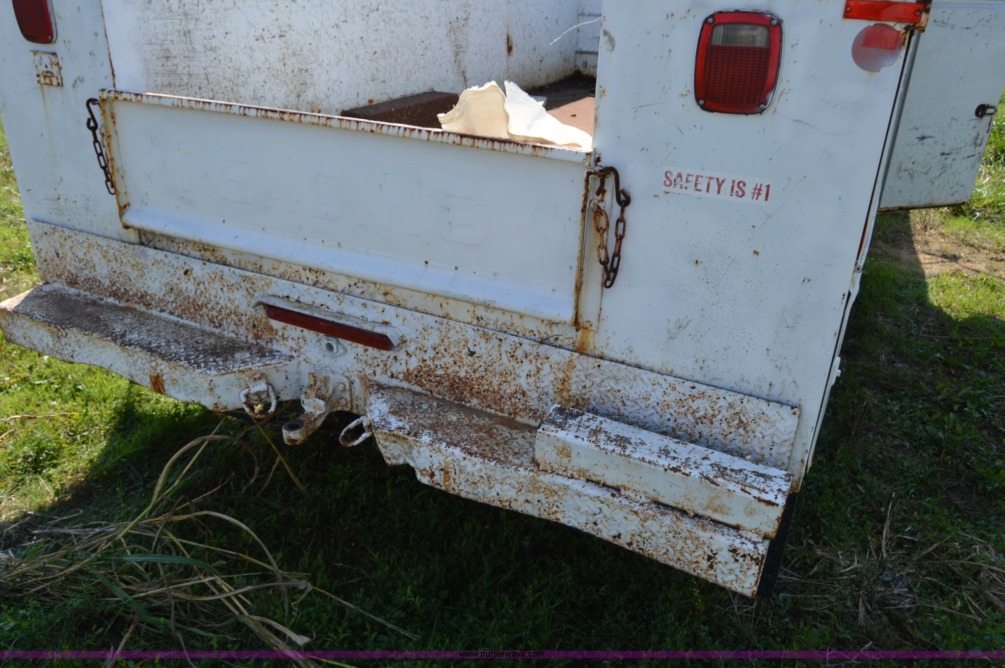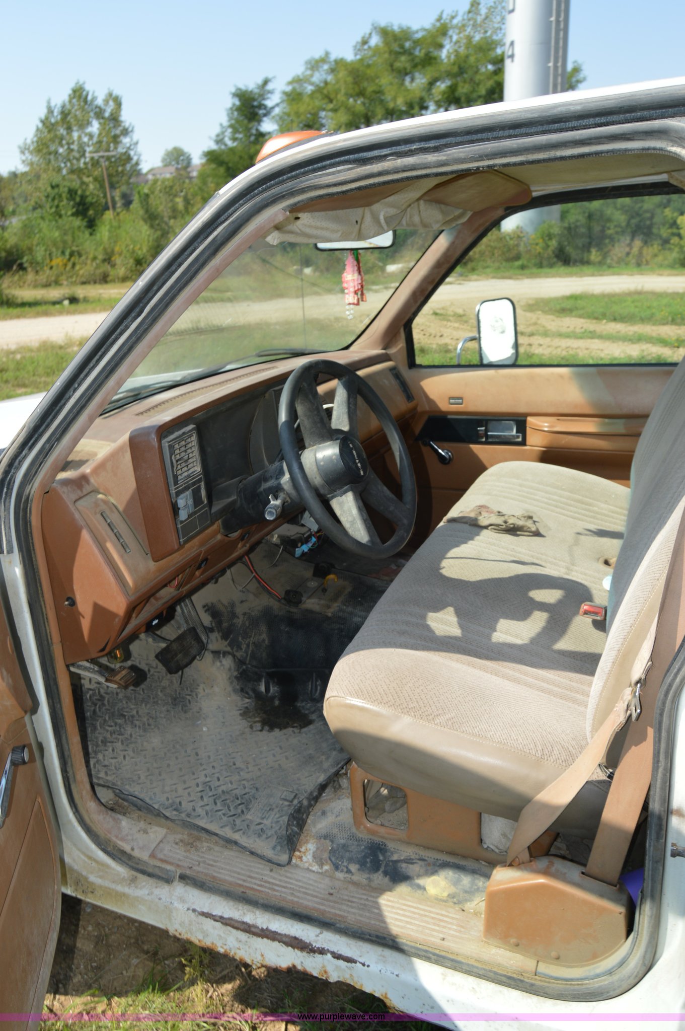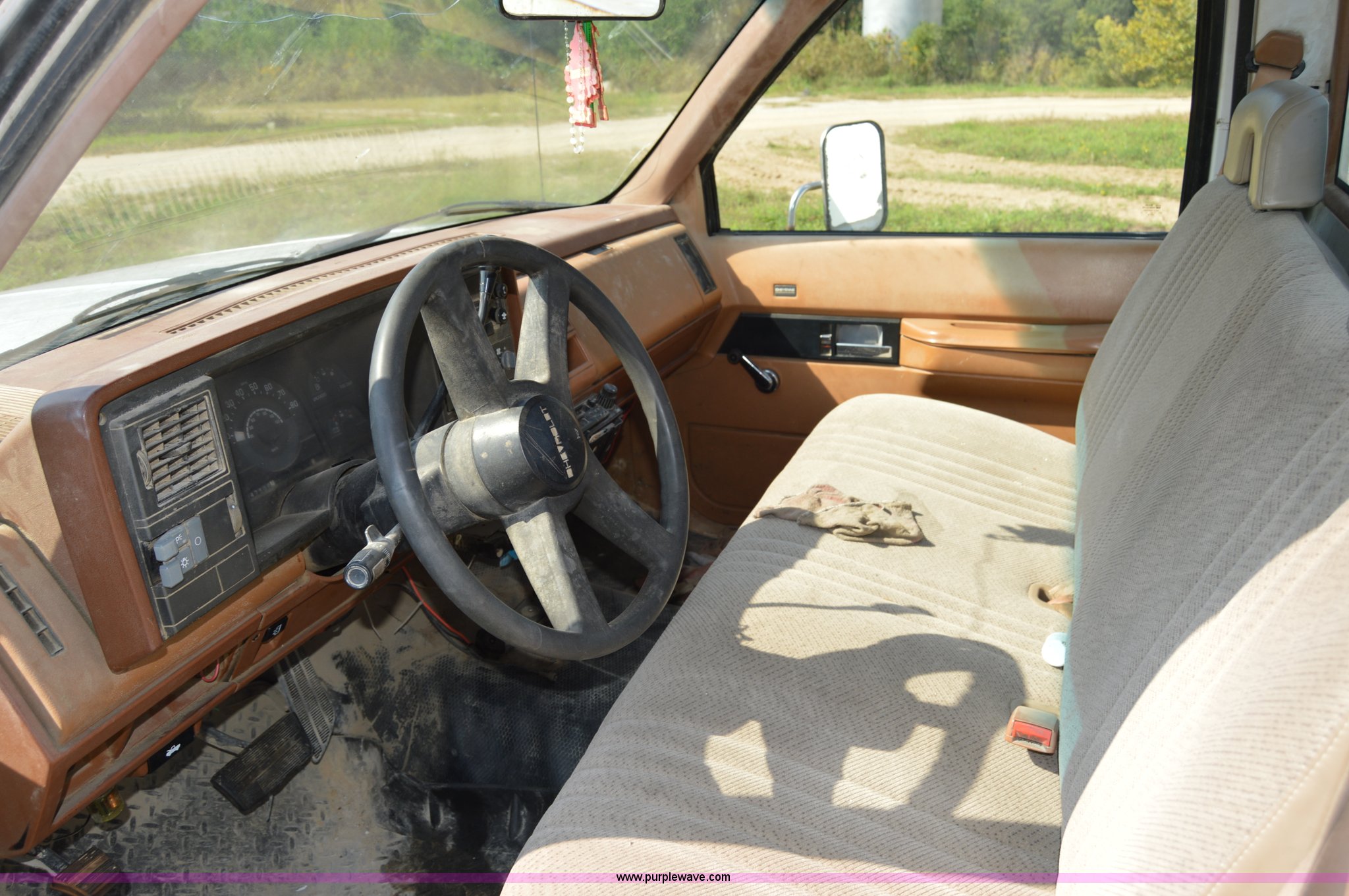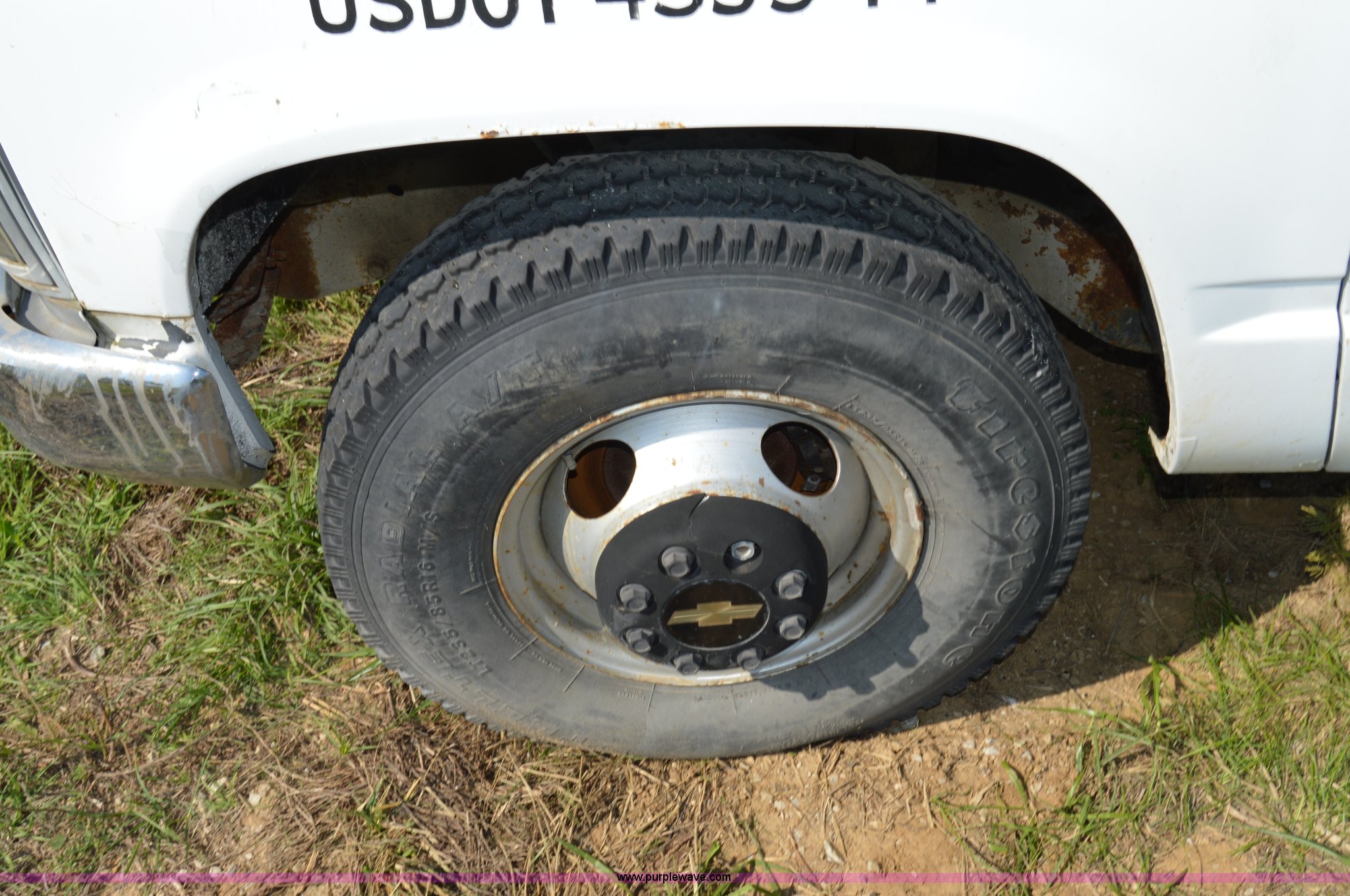 Purple Wave is selling a used Service Truck in Missouri. This item is a 1991 Chevrolet 3500 utility truck with the following: 47,500 miles on odometer, 5.7L V8 OHV 16V gas engine, Automatic transmission, Heat, AM/FM, Manual windows and locks, Cloth interior, 235/85R16 tires, Interior/exterior cosmetic damage, Dead battery, Turns over but will not start, Unknown running condition, Rear tire has tread falling off, Toolbox not included