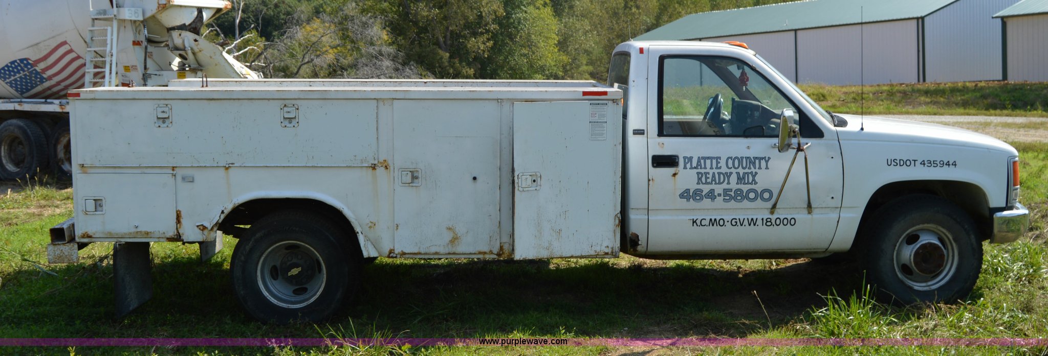 1991 Chevrolet 3500 utility truck. 47,500 miles on odometer, 5.7L V8 OHV 16V gas engine, Automatic transmission, Heat, AM/FM, Manual windows and locks, Cloth interior, 235/85R16 tires, Interior/exterior cosmetic damage, Dead battery, Turns over but will not start Unknown running condition, Rear tire has tread falling off, Toolbox not included. 1GBJC34KXME105876. Platte County Ready Mix. 15475 Knighton Ave. Platte City, MO 64079