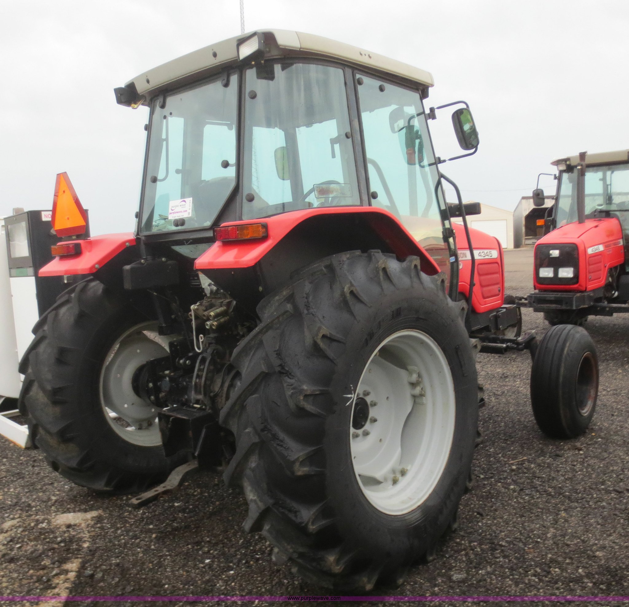 Purple Wave is selling a used Tractor in Kansas. This item is a 2003 Massey Ferguson 4345 tractor with the following: 1,896 hours on meter, Perkins 3.99L four cylinder diesel engine, Shuttle shift transmission, 12F-12R gears, AC and heat, AM/FM, Draw bar, 540/1000 PTO, Three rear hydraulic remotes, 36 x 11.22 foam filled airplane front tires, 18.4-30 rear tires, Three point arms missing, Electrical issues, Rear main seal leaks oil, Code 44 problems, Transmission issues, Unit will not move, Paint faded and scratched, Serial M13570, KDOT ID 352-4053
