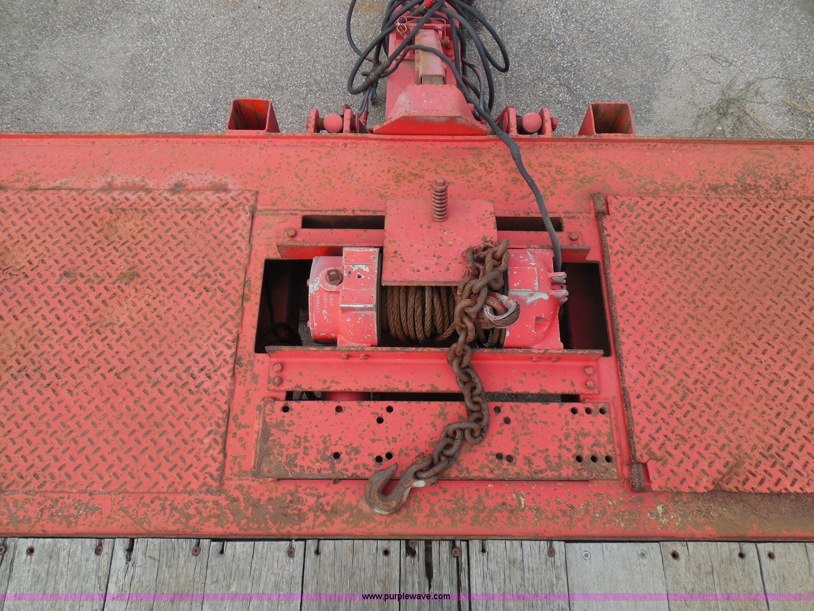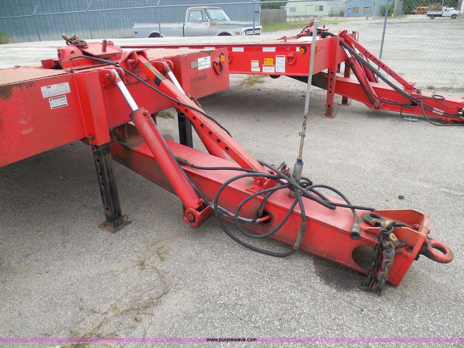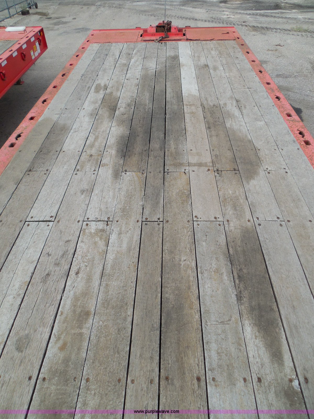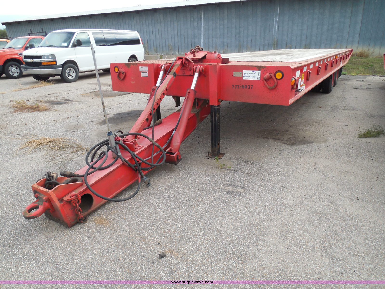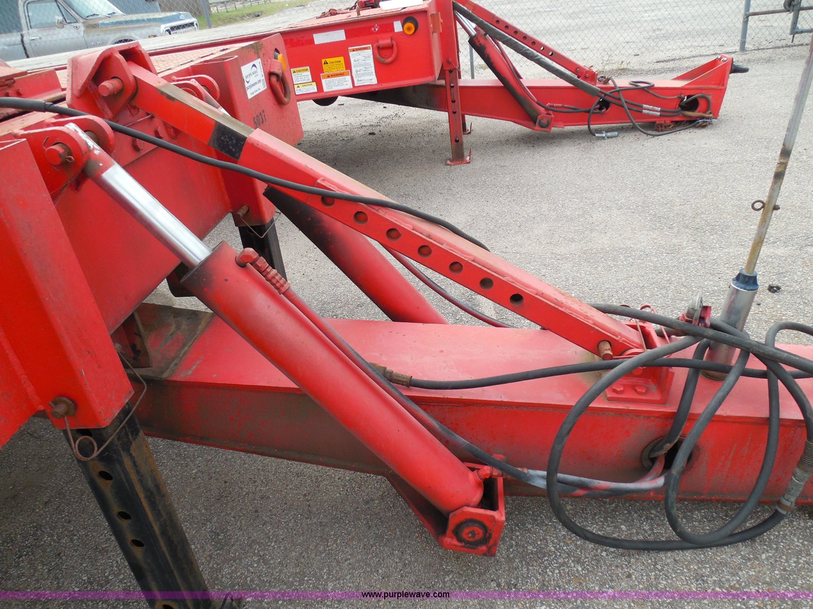 Purple Wave is selling a used Equip. Trailer in Kansas. This item is a 1998 Landoll 345-31 tilt deck equipment trailer with the following: 31'L x 102"W deck, D-ring tie downs, Side stake pockets, Wedge tail, Twin cylinder tilt, Hydraulic three lever ground controls, Braden cable winch, Chain well, Oil bath hubs, Spring suspension, Air brakes, 10R17.5 tires, Stringers rusted, Boards damaged, Unit needs work, KDOT ID 777-5037