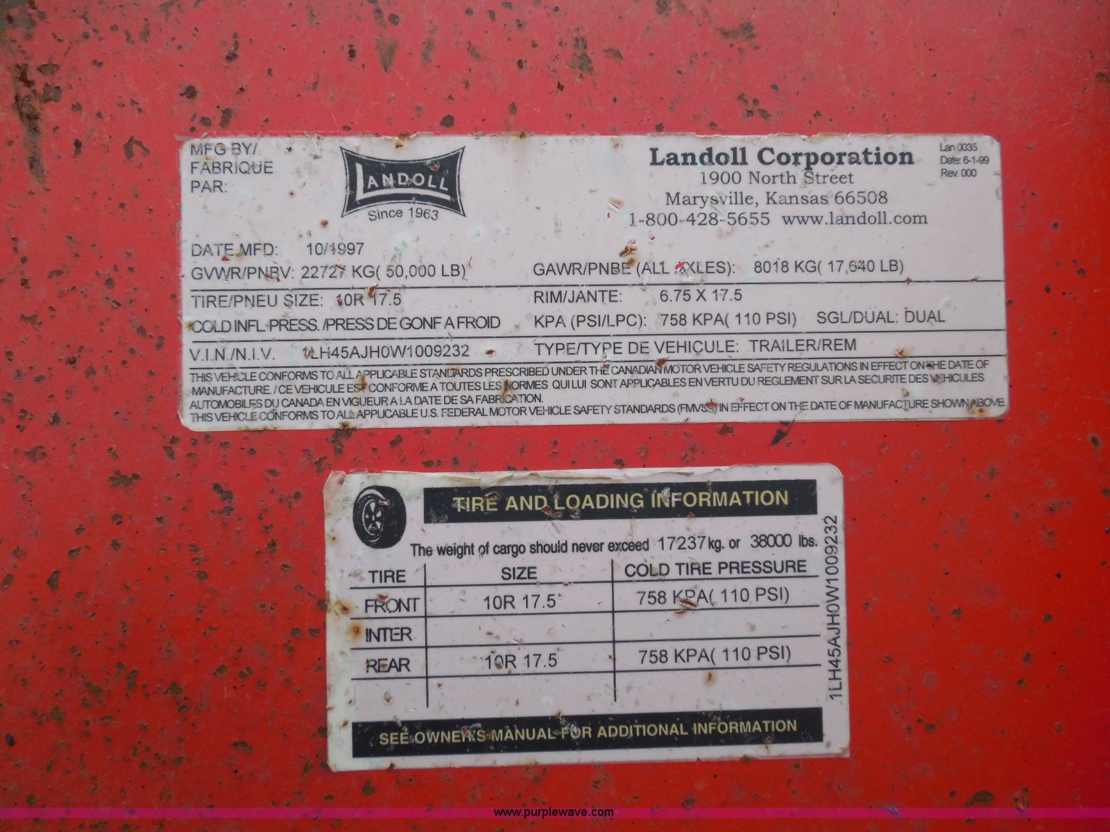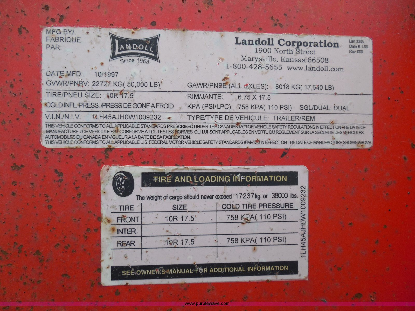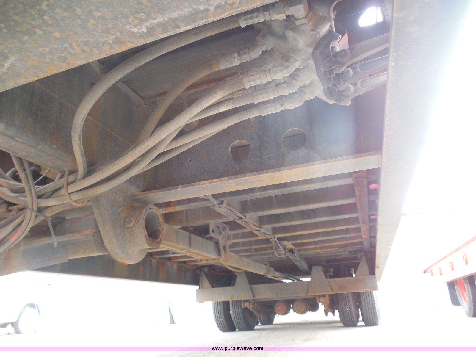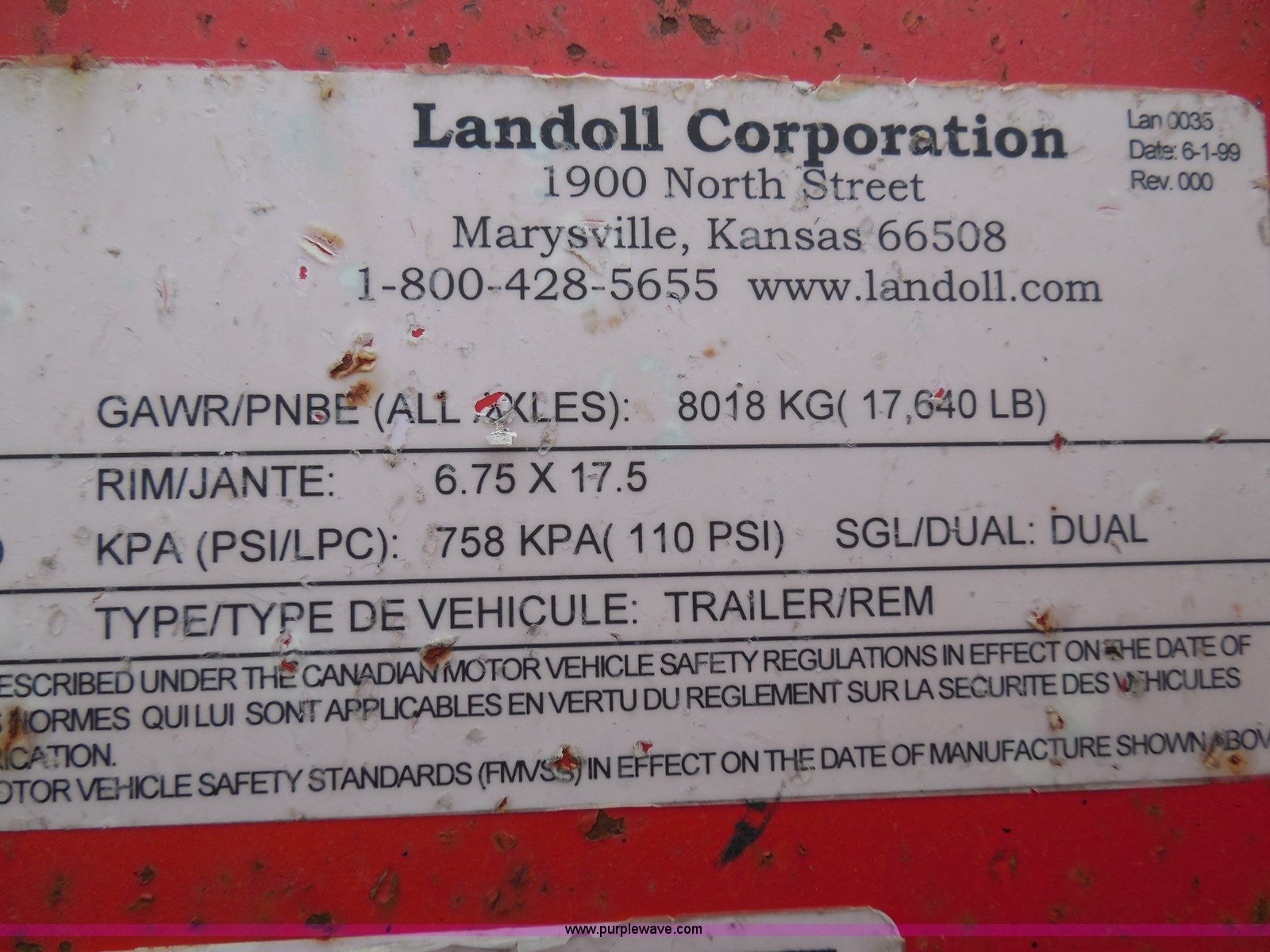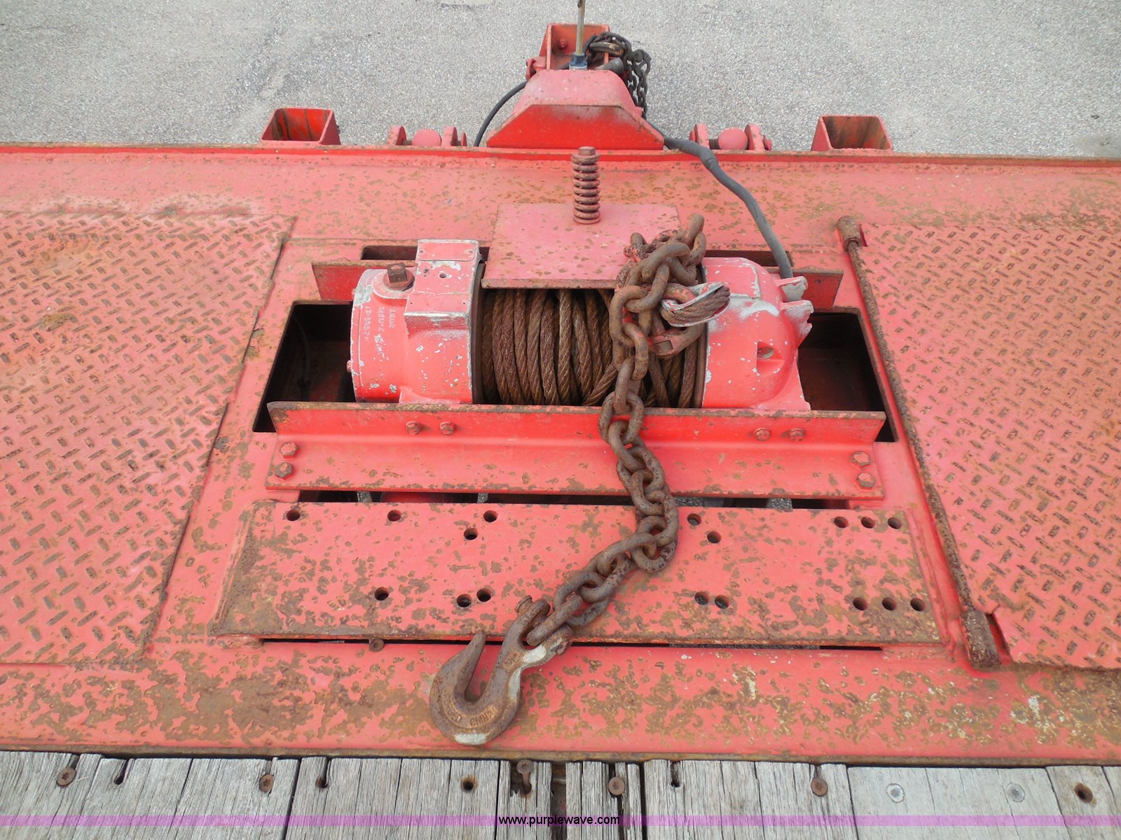Purple Wave is selling a used Equip. Trailer in Kansas. This item is a 1998 Landoll 345-31 tilt deck equipment trailer with the following: 31'L x 102"W deck, D-ring tie downs, Side stake pockets, Wedge tail, Twin cylinder tilt, Hydraulic three lever ground controls, Braden cable winch, Chain well, Oil bath hubs, Spring suspension, Air brakes, 10R17.5 tires, Stringers rusted, Boards damaged, Unit needs work, KDOT ID 777-5037
