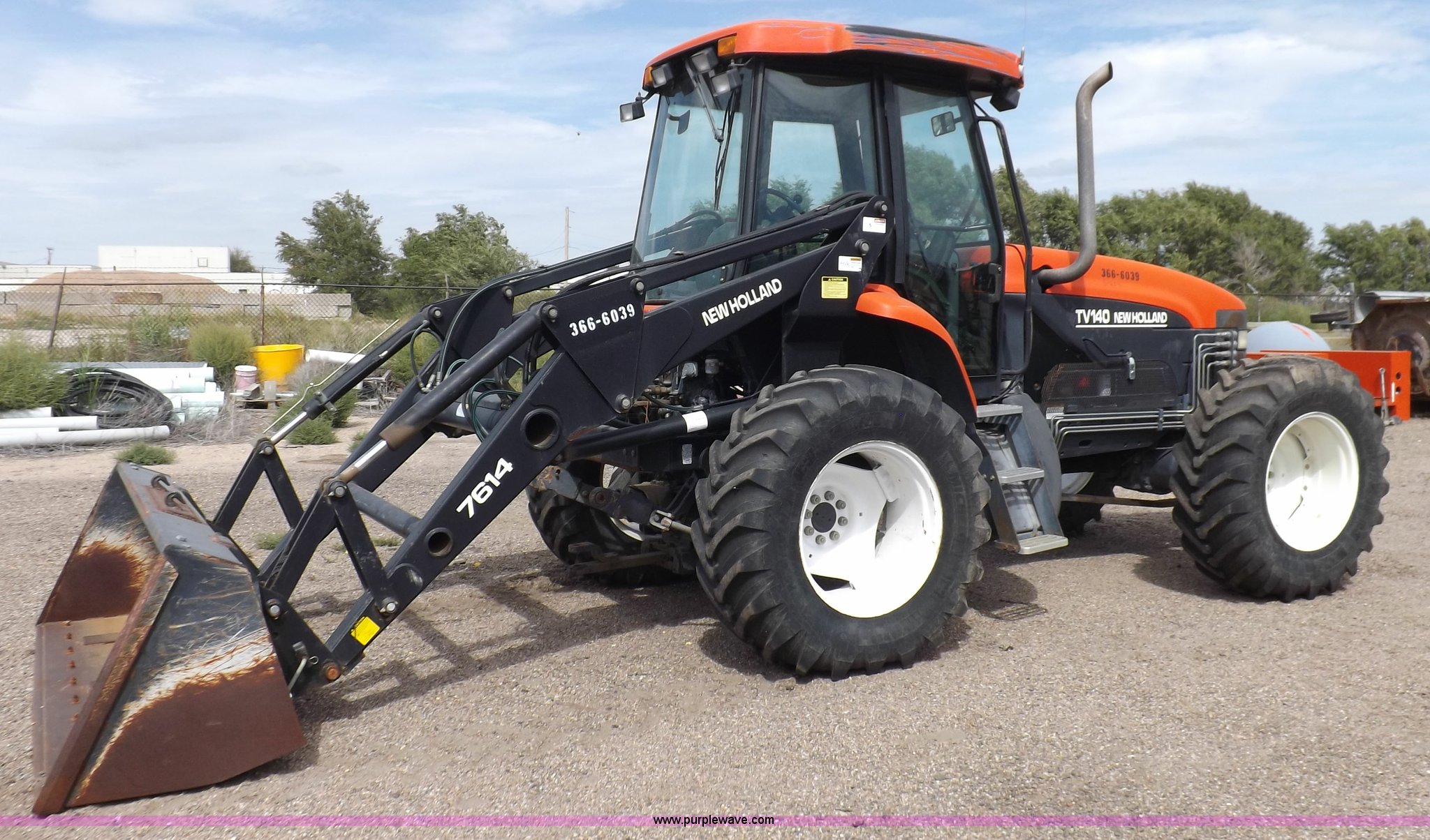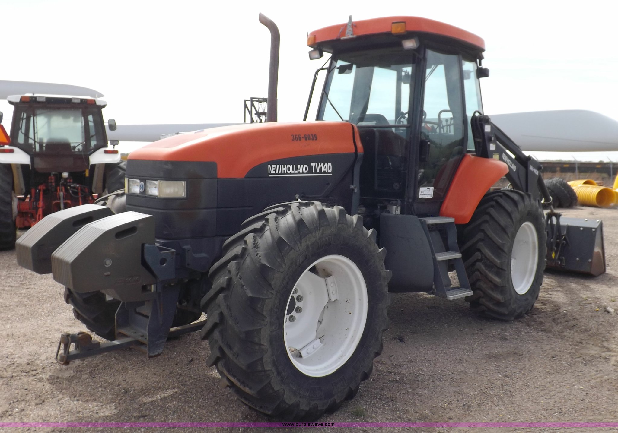 Purple Wave is selling a used Tractor in Kansas. This item is a 1999 New Holland TV140 bi-directional MFWD tractor with the following: 5,867 hours on meter, New Holland six cylinder diesel engine, 105 HP, Hydrostatic transmission, 3F-3R gears, Differential lock, AC and heat, AC does not blow cold, AM/FM, Air suspension seat, Tilt steering wheel, New Holland 7614 loader, 8.5'W bucket, Weld-on cutting edge, Manual quick attach, Three point, Draw bar, 540 PTO, Front and rear PTO, (2) front hydraulic remote sets, (4) rear hydraulic remote sets, (22) 67 lbs suitcase weights, 114" wheelbase, 440/80R28 tires, 14,715 lbs. base operating weight, Serial D204520, KDOT ID 366-6039