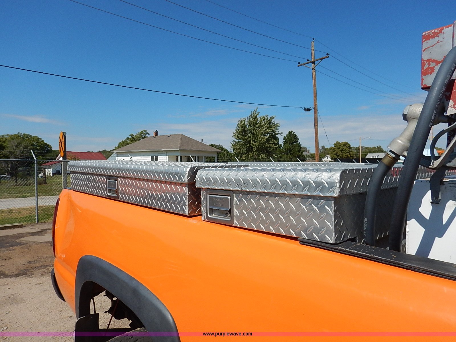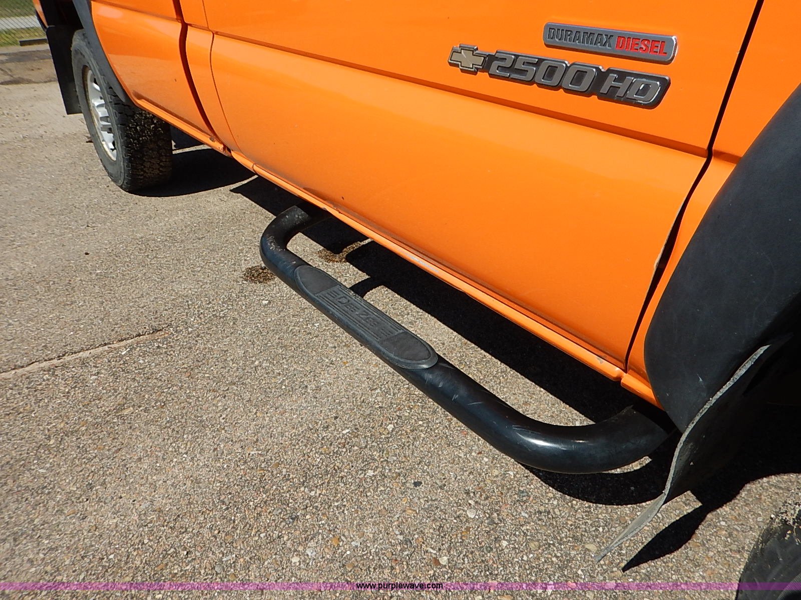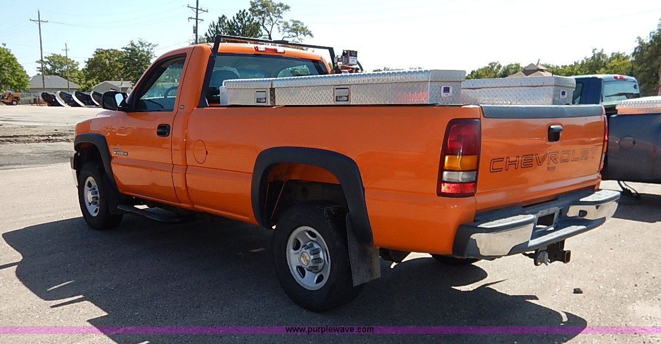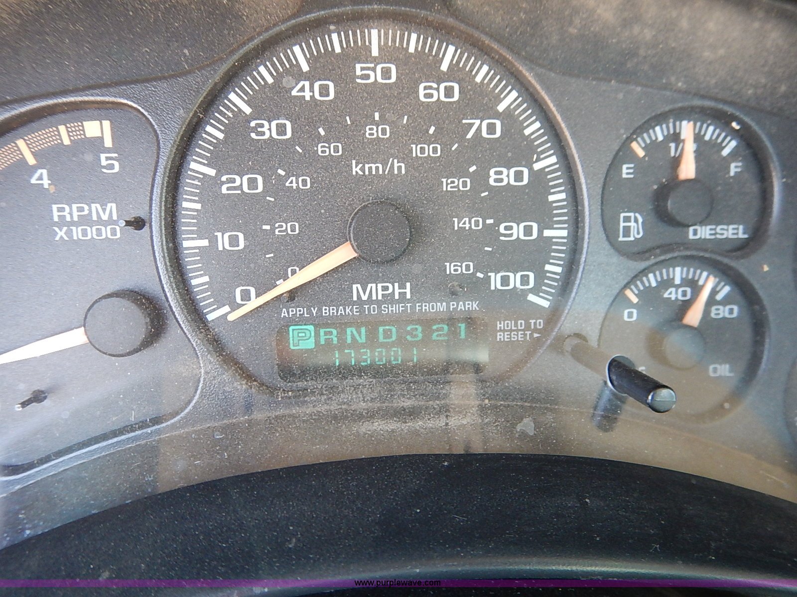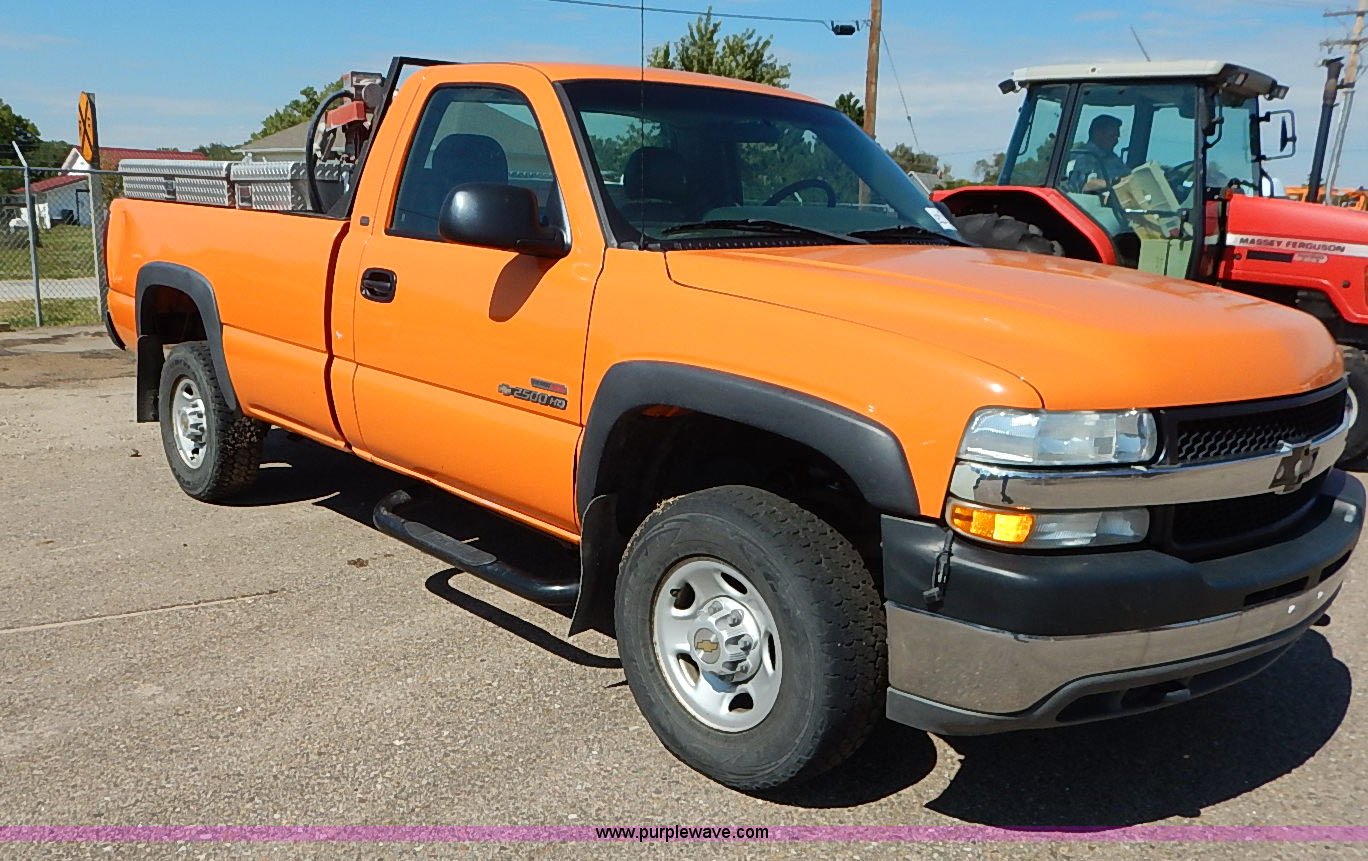 Purple Wave is selling a used 3/4 or 1 Ton Pickup or Van in Kansas. This item is a 2002 Chevrolet Silverado 2500 pickup truck with the following: 173,001 miles on odometer, 6.6L V8 OHV 32V turbo diesel engine, Automatic transmission, AC and heat, Tilt, Cruise, Manual windows and locks, Vinyl interior, Block heater, (3) toolboxes, 88 gallon fuel tank, Transfer pump, Headache rack, DeeZee running boards, Receiver hitch, Trailer wiring, 245/75R16 tires, Paint faded and scratched, Tires need replaced, Rear end makes noise, Driver's door has problems closing, Additional filters, KDOT ID 112-3122