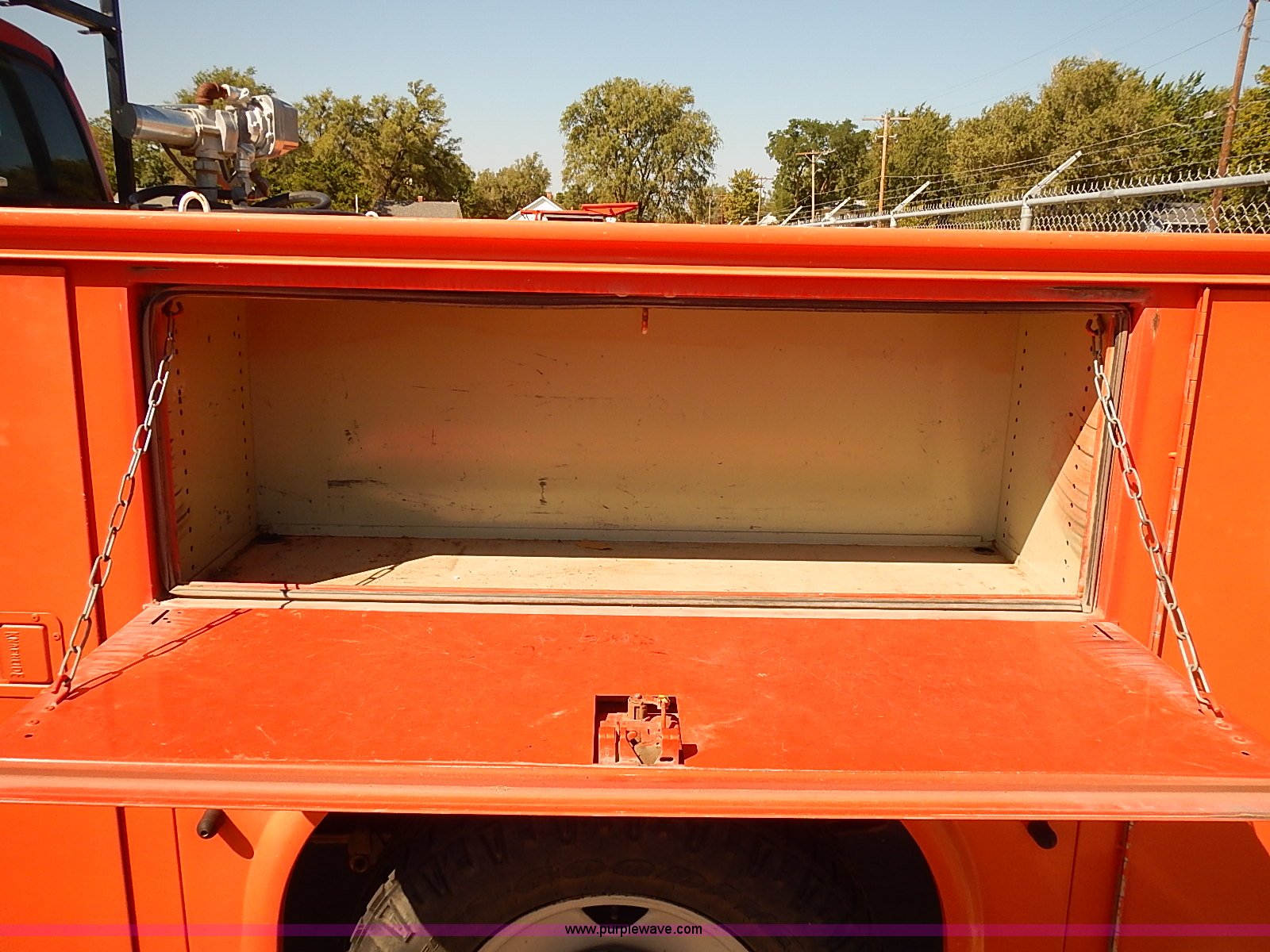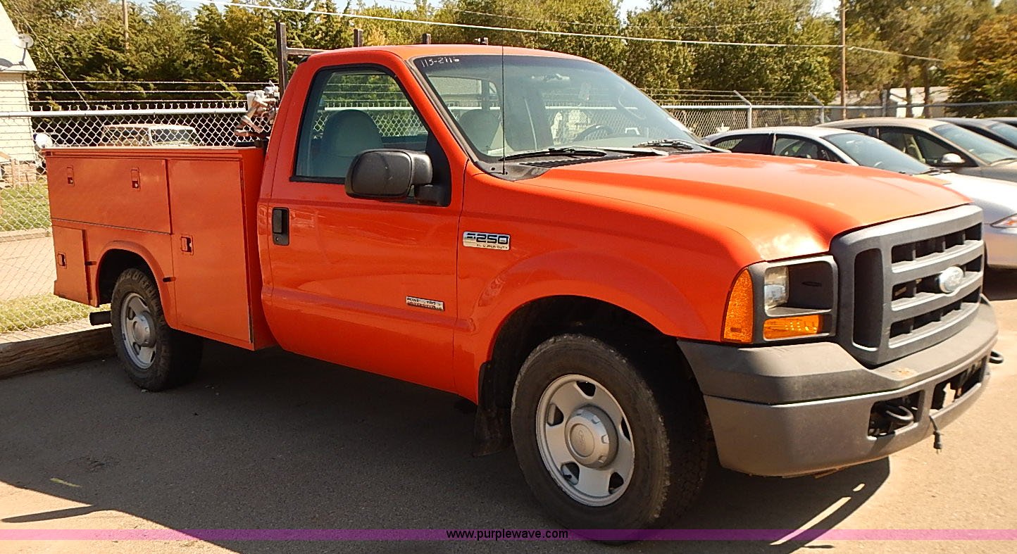 Purple Wave is selling a used Service Truck in Kansas. This item is a 2006 Ford F250 Super Duty utility truck with the following: 208,893 miles on odometer, 6.0L V8 OHV 32V turbo diesel engine, Automatic transmission, AC and heat, AM/FM, Tilt, Cruise, Manual windows and locks, Vinyl interior, Knapheide 8' utility bed, (6) compartments, Headache rack, 98 gallon fuel tank, Transfer pump,, Pintle hitch, 2" ball, 3:73 gear ratio limited slip differential, 17" wheels, Interior/exterior cosmetic damage, Scratches, Driver side window crank handle missing, Driver side window track broken, Engine has starting issues when operational temperature is reached, KDOT ID 113-2116