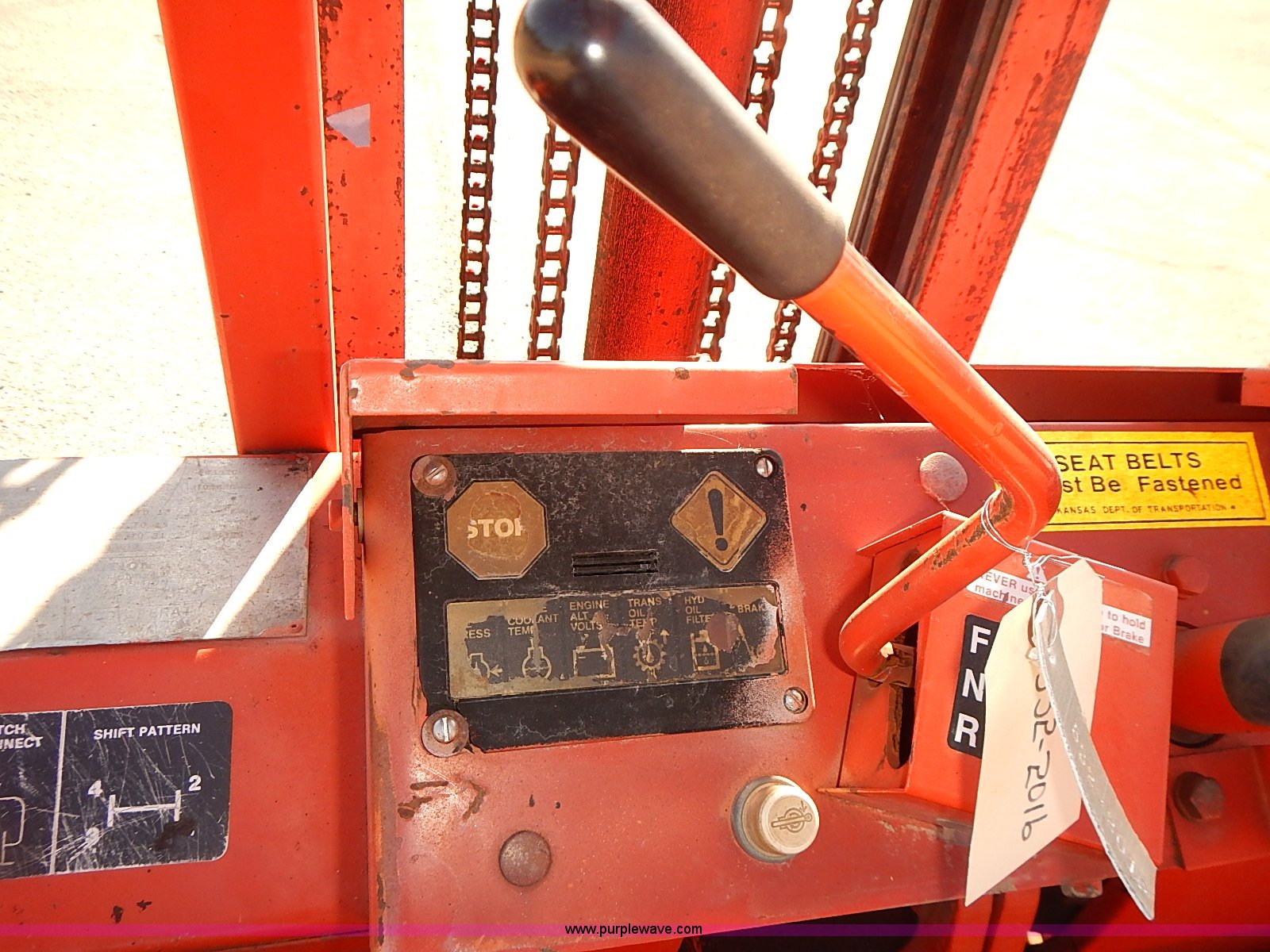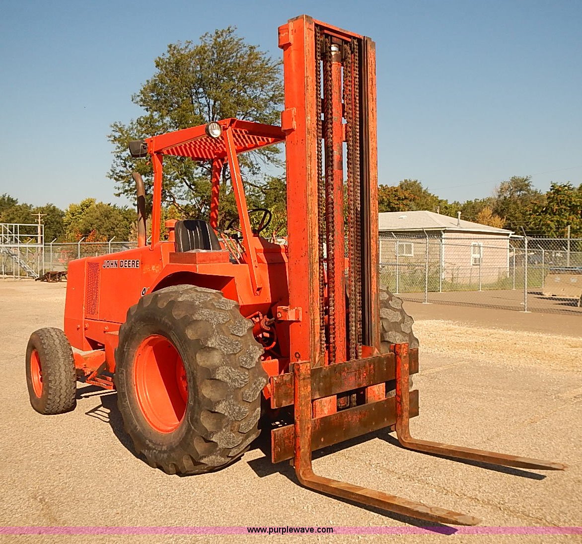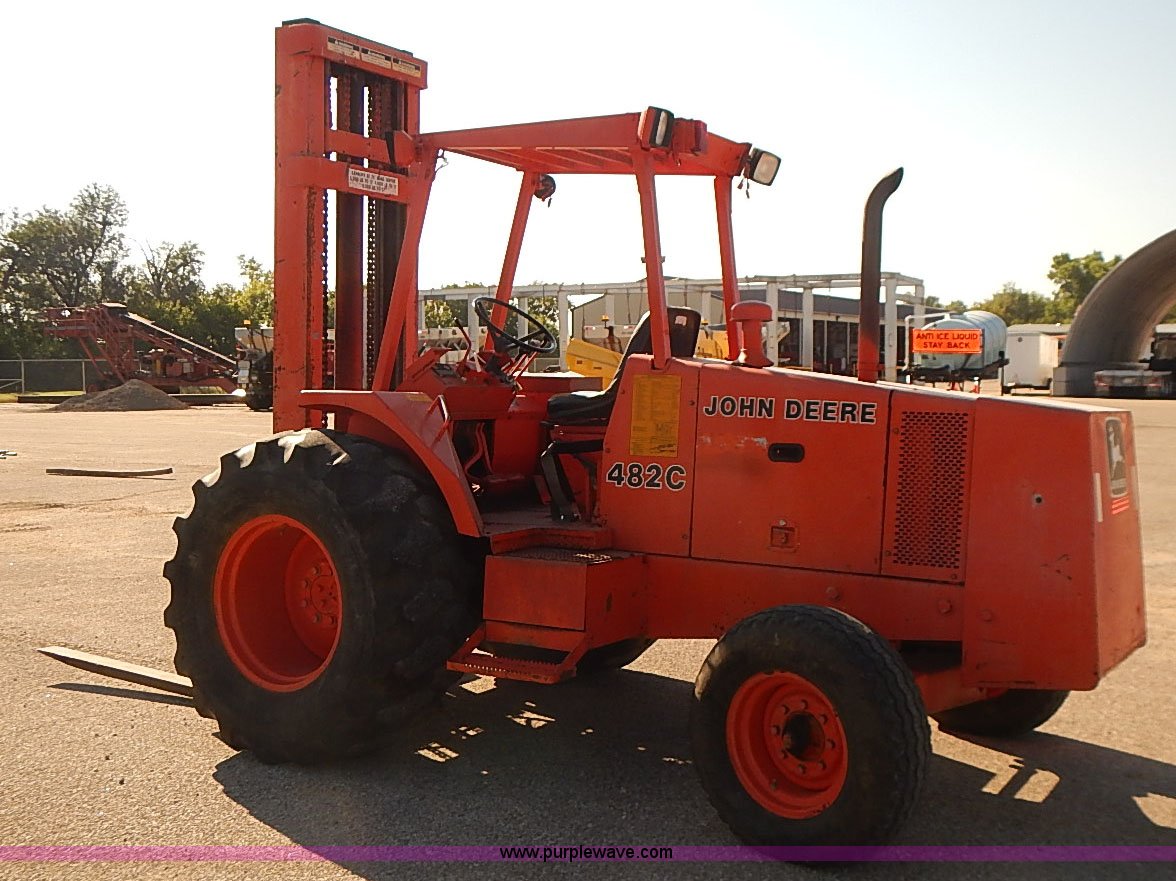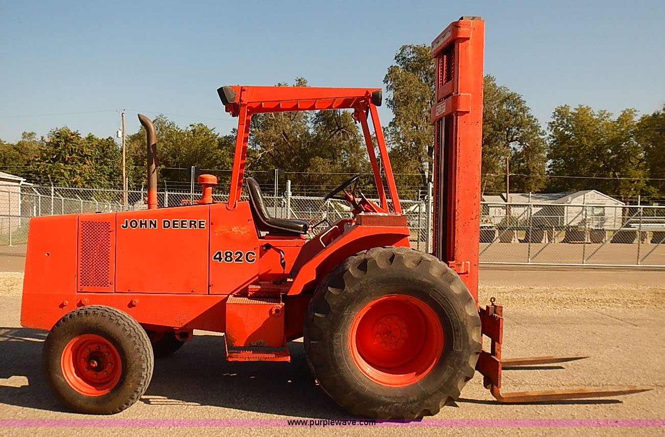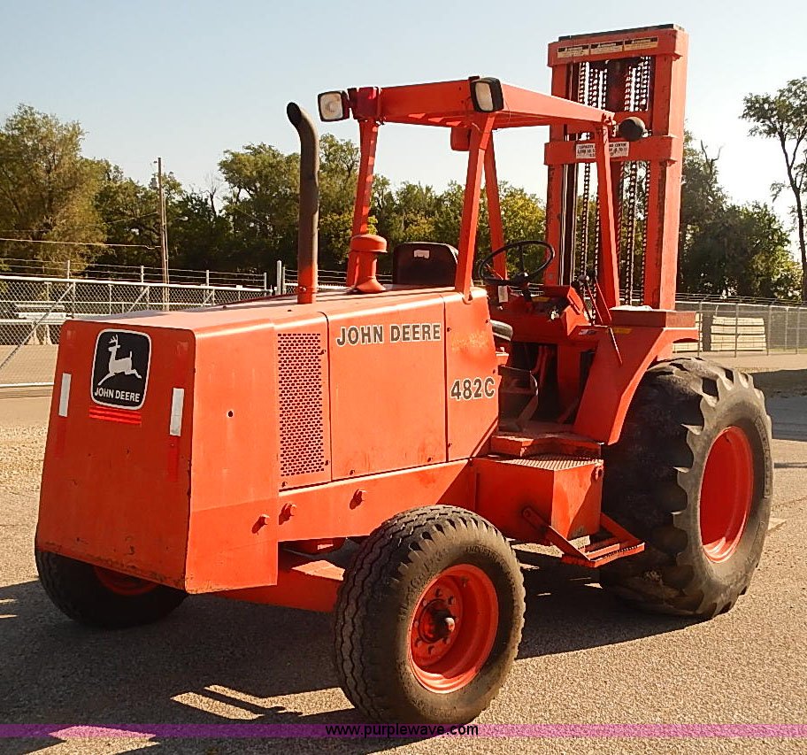 Purple Wave is selling a used Strt. Mast Rough Terr. Forklift in Kansas. This item is a 1986 John Deere 482C forklift with the following: 4,542 hours on meter, John Deere four cylinder diesel engine, Model T042390143320, Four speed torque/reverser transmission, Hydraulic lift, tilt, and side shift, Manual fork width adjustment, 21.5' lift height, 5,000 lbs rated lift capacity, 48" x 4" x 2" forks, 24" front wheels, 16" rear wheels, Manuals, Serial T0482CM730944, KDOT ID 532-2016