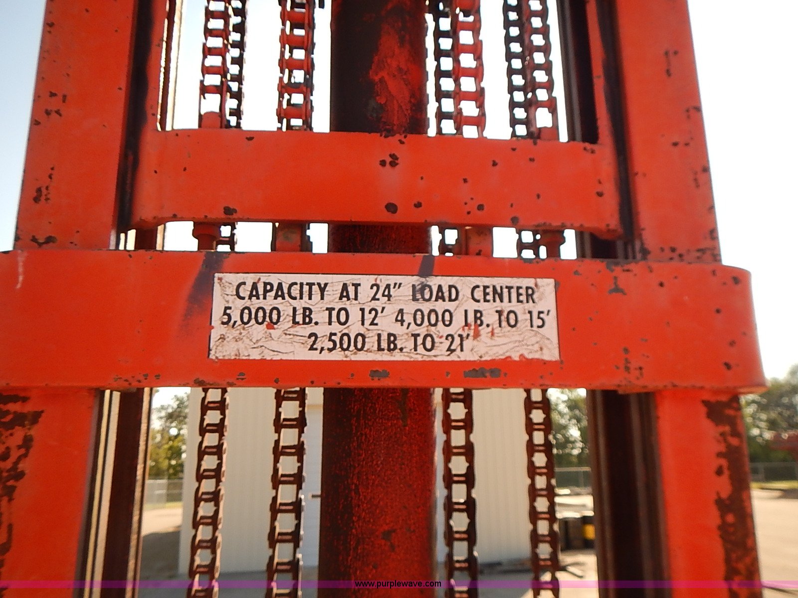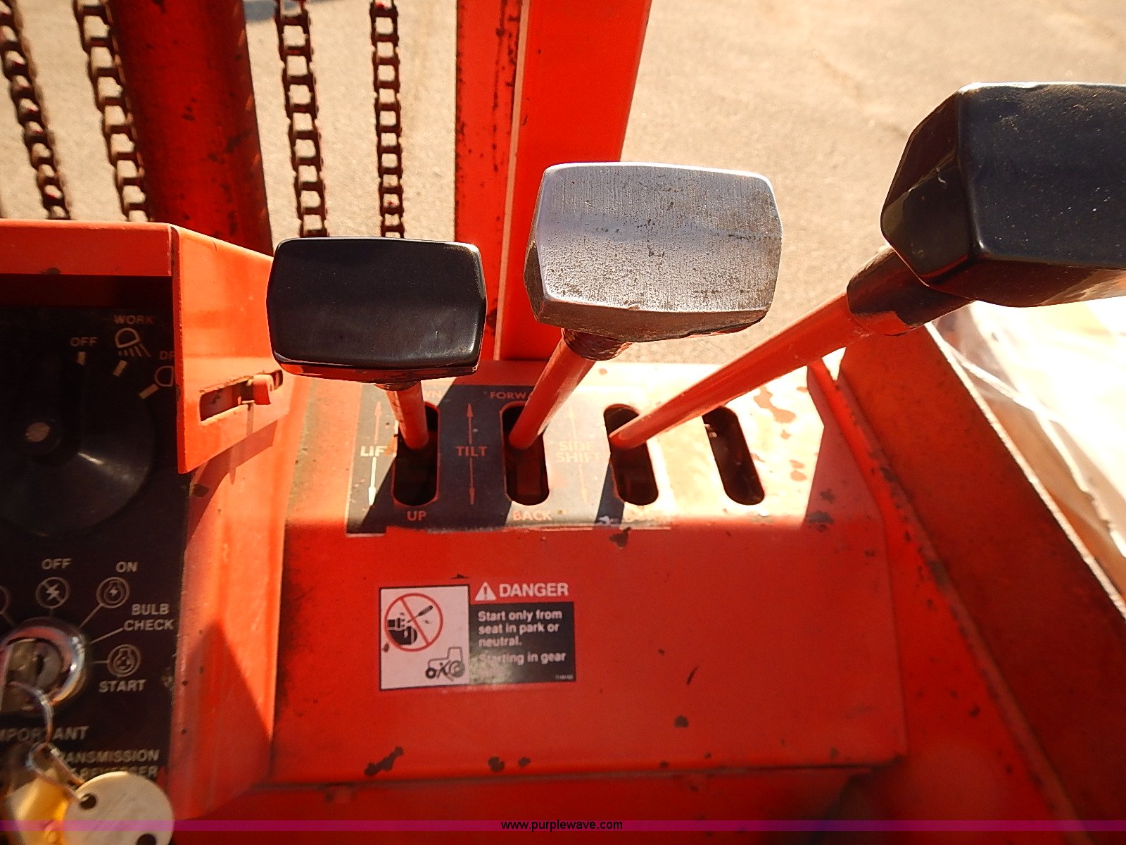 1986 John Deere 482C forklift. 4,542 hours on meter, John Deere four cylinder diesel engine Model T042390143320, Four speed torque/reverser transmission, Hydraulic lift, tilt, and side shift, Manual fork width adjustment, 21.5' lift height, 5,000 lbs rated lift capacity, 48" x 4" x 2" forks, 24" front wheels, 16" rear wheels, Manuals, Serial T0482CM730944, KDOT ID 532-2016. View equipment video. Kansas Department of Transportation - Salina. 1006 N 3rd St. Salina, KS 67402