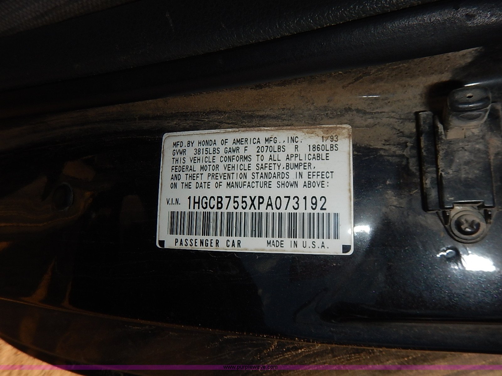 Purple Wave is selling a used Passenger Vehicle in Kansas. This item is a 1993 Honda Accord LX with the following: 182,964 miles on odometer, 2.2L L4 SOHC 16V gas engine, Five speed manual transmission, AC and heat, Tilt, Cruise, AM/FM, Power windows, locks, and mirrors, Cloth interior, Keys, 185/70R14 tires, Interior/exterior cosmetic damage, Dents, Scratches, Rust, Windows rolled down, Paint faded, Cracked windshield, Contents included, Unknown operating condition, Case# 14C047152