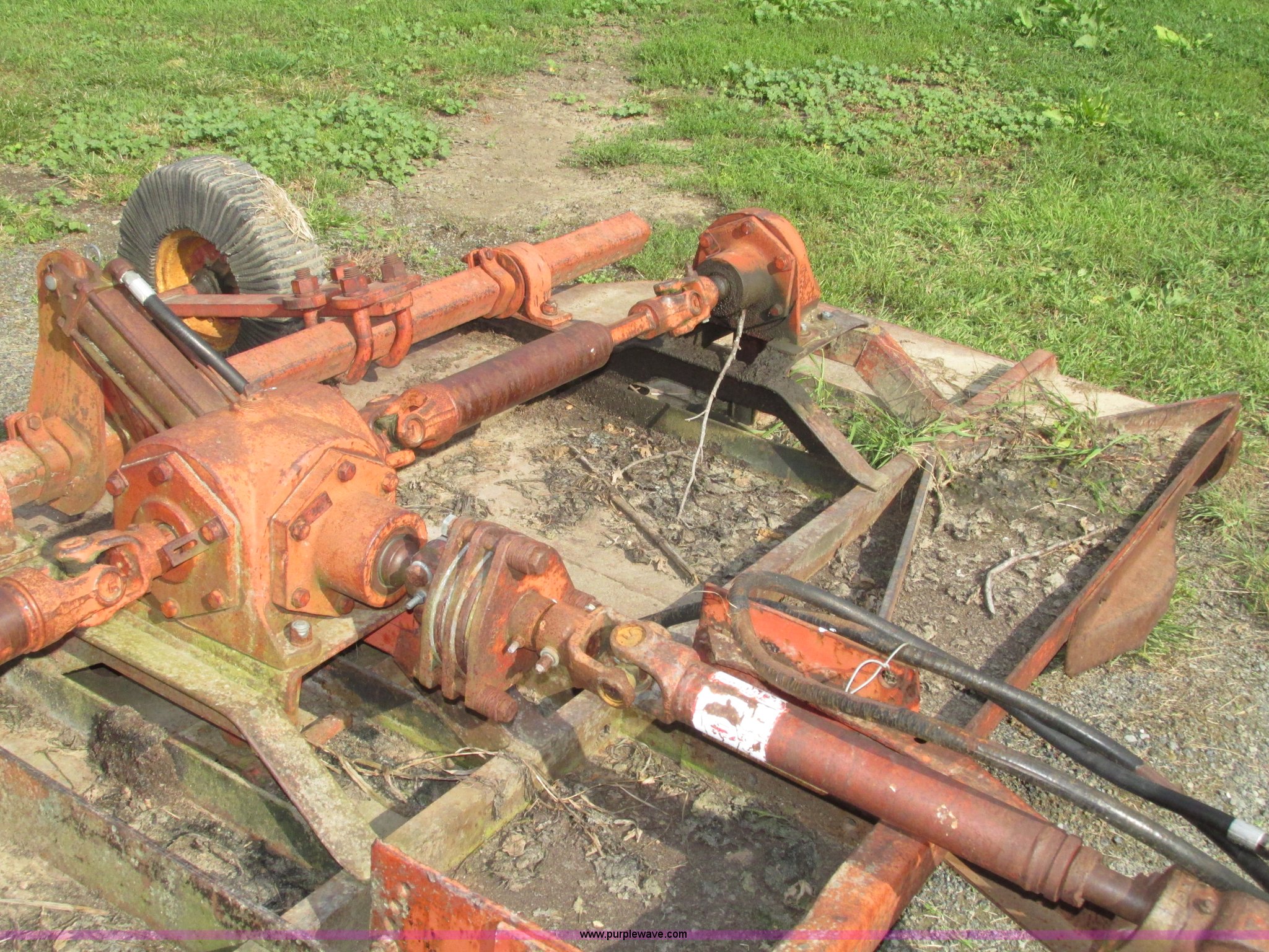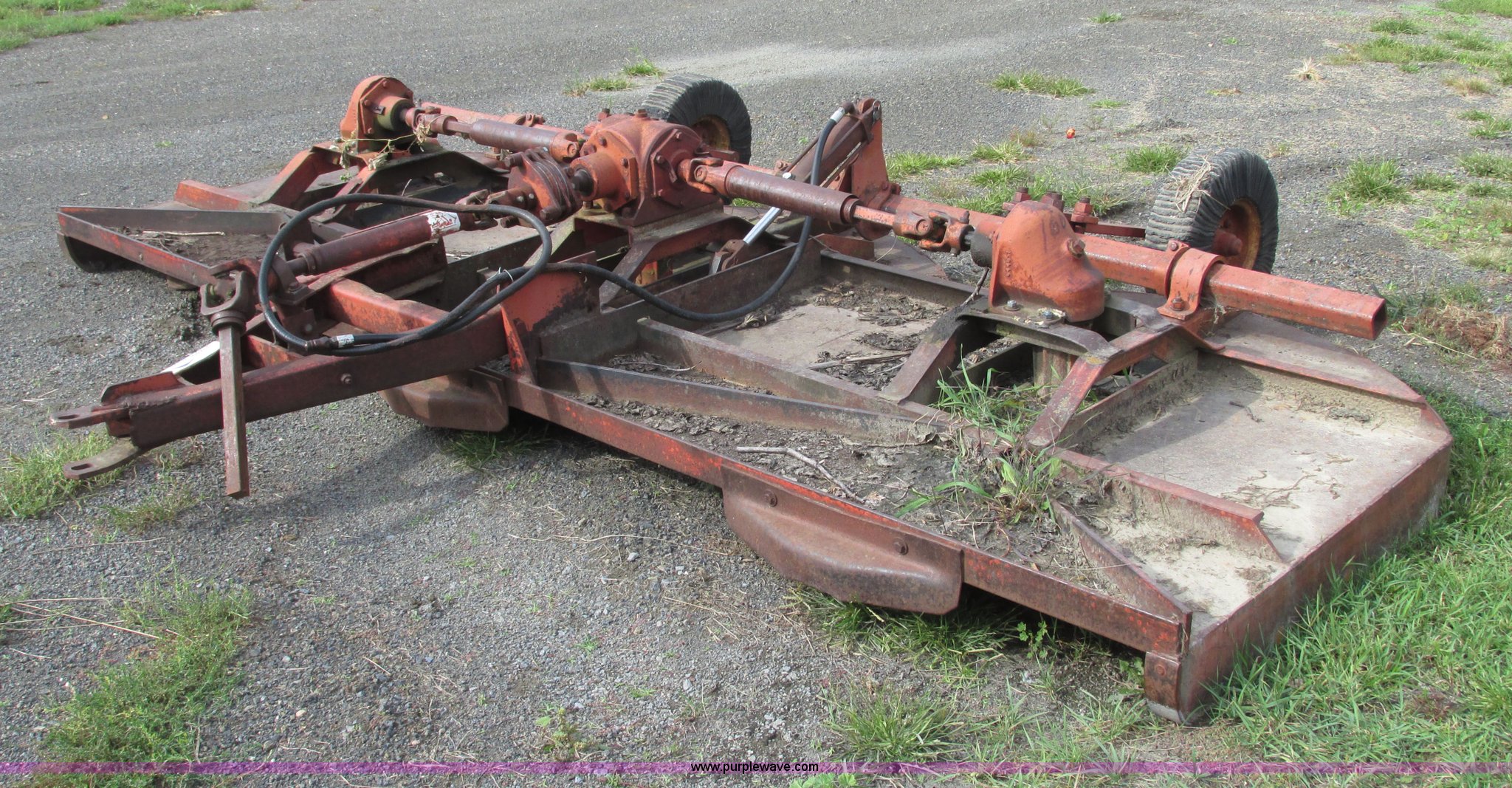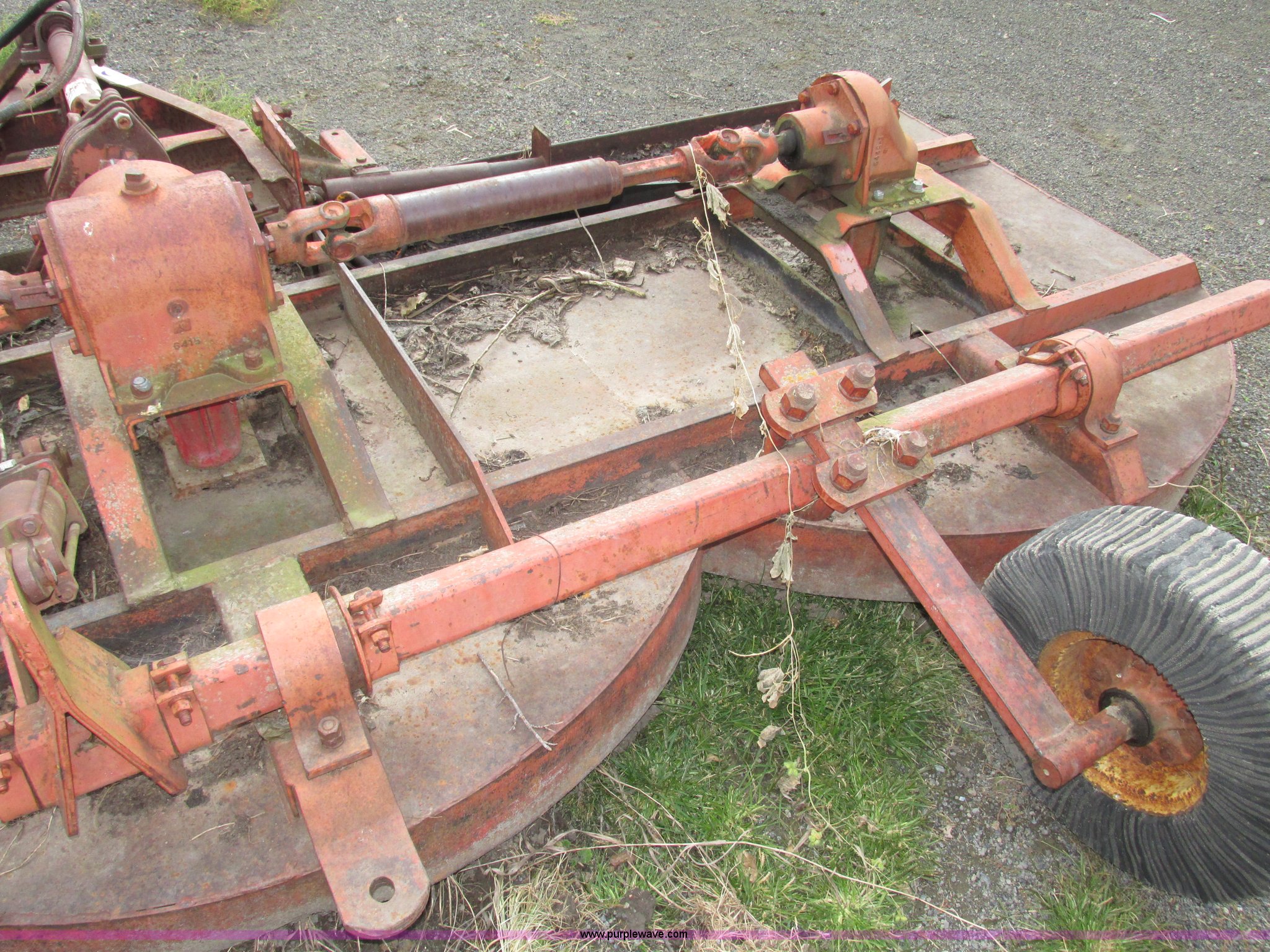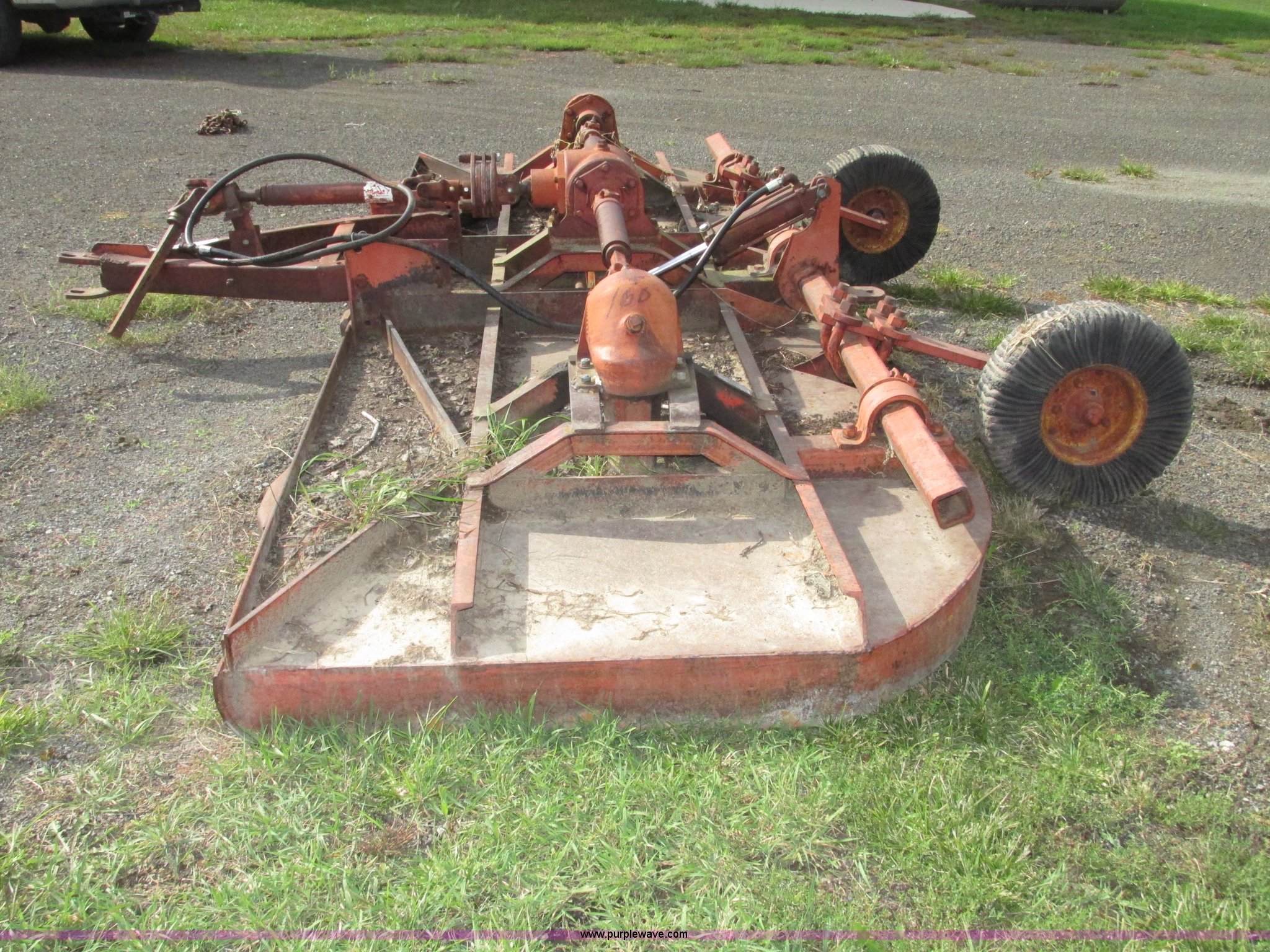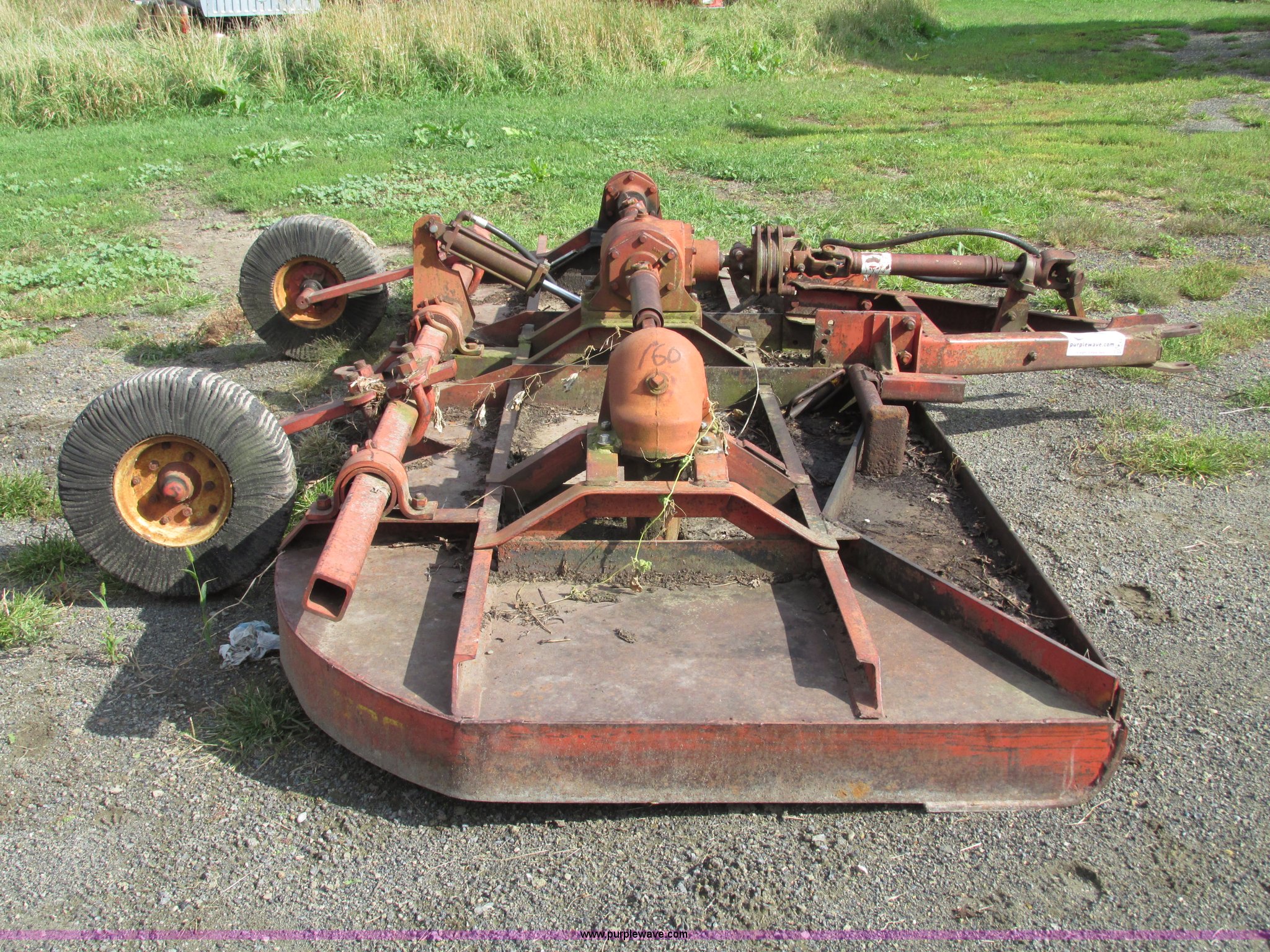 Purple Wave is selling a used Mower, Cutter, Shredder in Iowa. This item is a Bush Hog 160 rotary mower with the following: 13'W, Three blade design, Pin hitch, 10 1/4"L x 3" diameter lift cylinder, Hydraulic hose with male Pioneer fitting, 540 PTO, Shaft end included, Adjustable jack stand, Rear pin hitch, 21" laminated wheels, 10 5/8" five bolt steel wheels, Hydraulic hose weather cracked and worn, Serial 16873