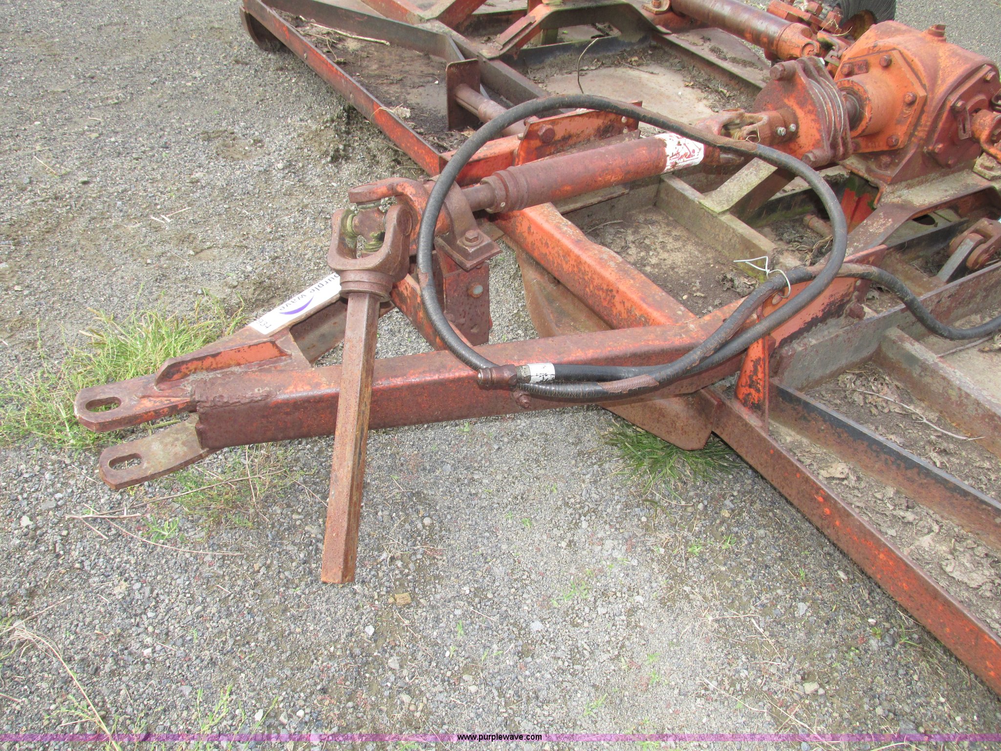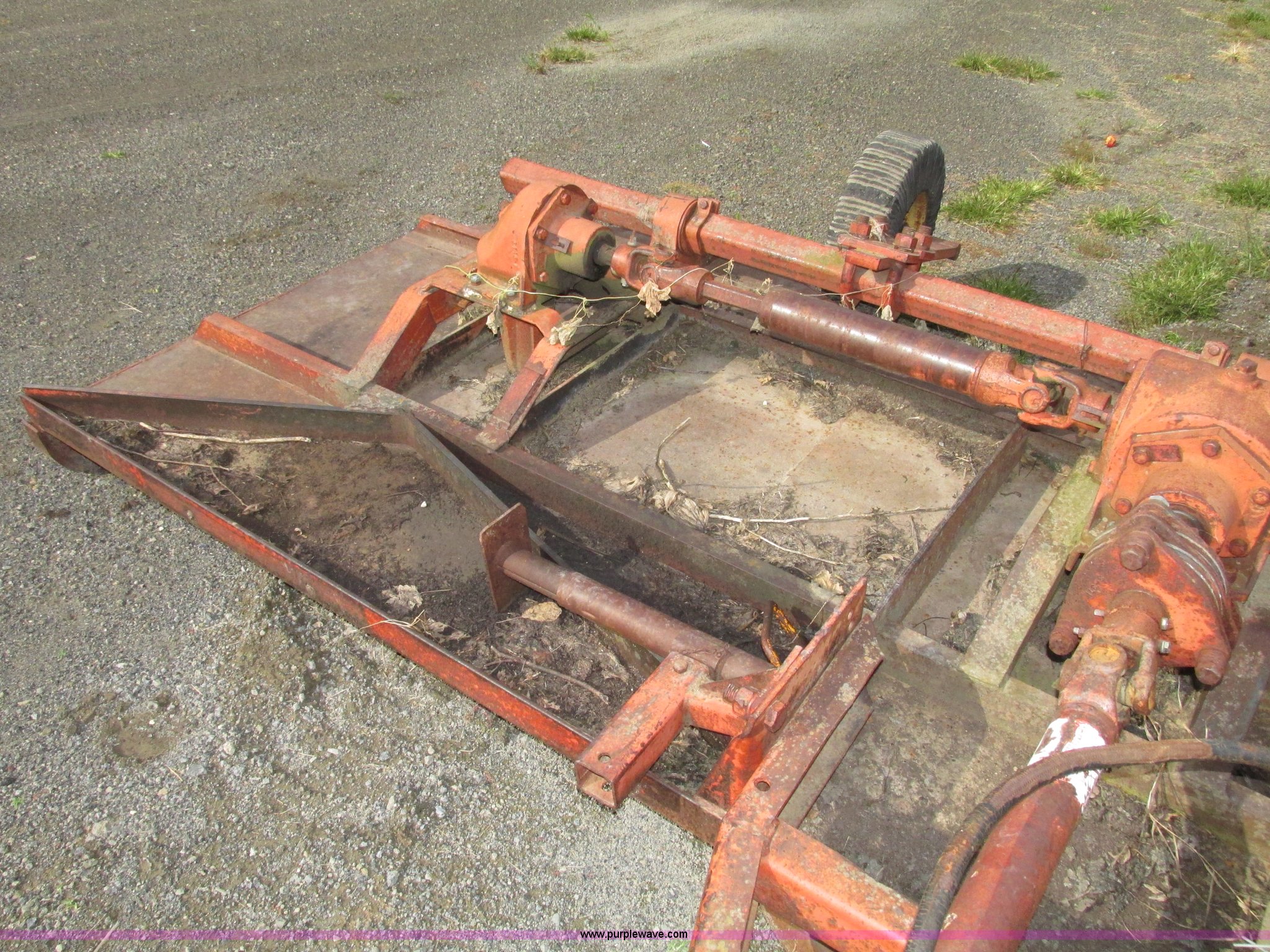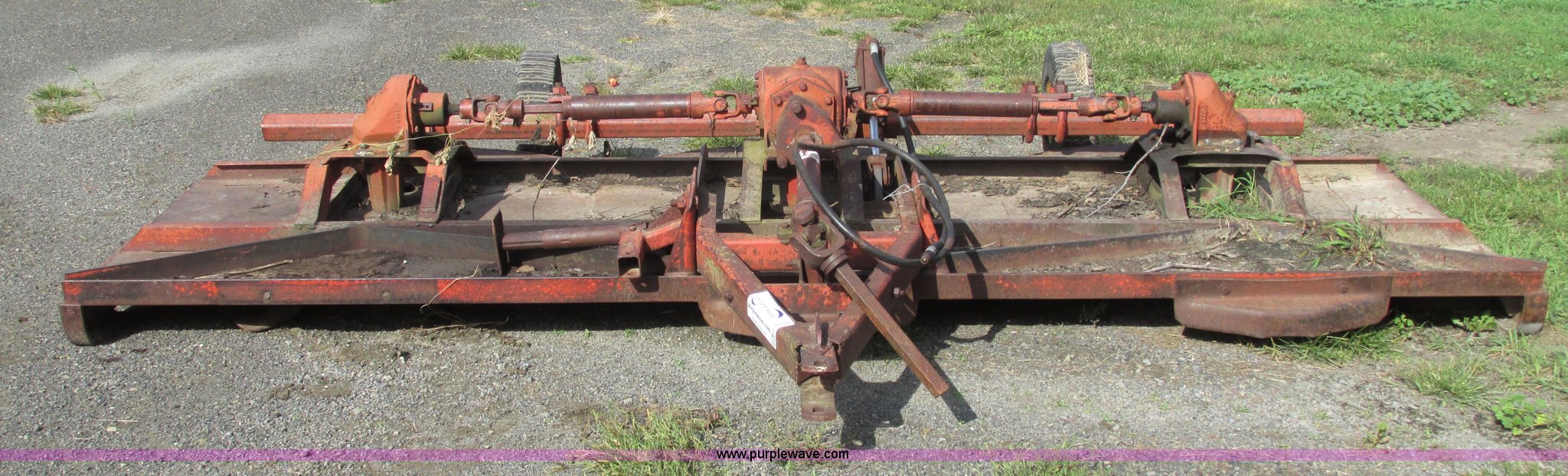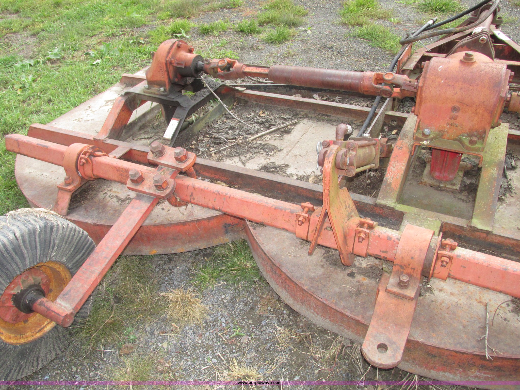 Purple Wave is selling a used Mower, Cutter, Shredder in Iowa. This item is a Bush Hog 160 rotary mower with the following: 13'W, Three blade design, Pin hitch, 10 1/4"L x 3" diameter lift cylinder, Hydraulic hose with male Pioneer fitting, 540 PTO, Shaft end included, Adjustable jack stand, Rear pin hitch, 21" laminated wheels, 10 5/8" five bolt steel wheels, Hydraulic hose weather cracked and worn, Serial 16873