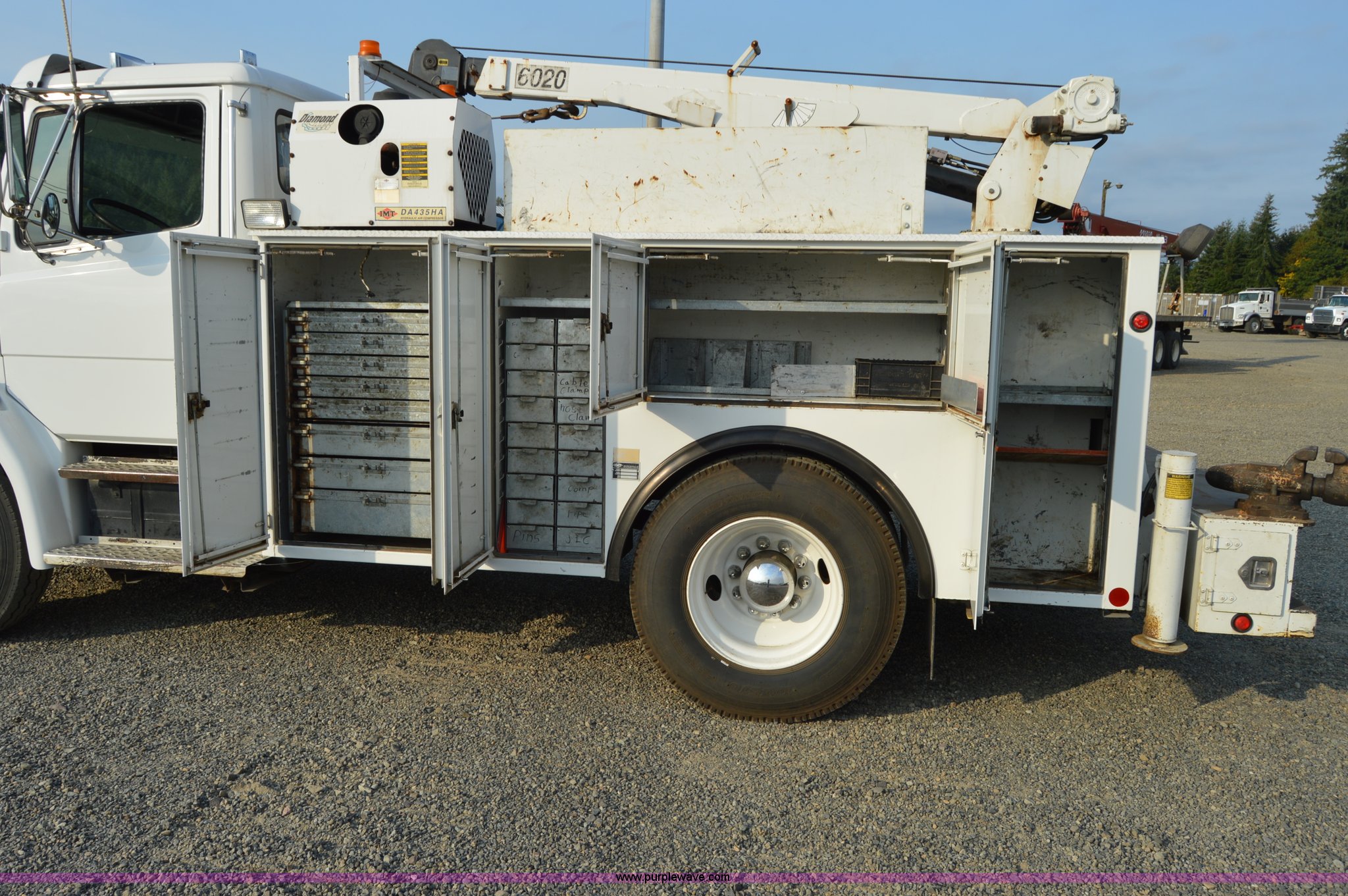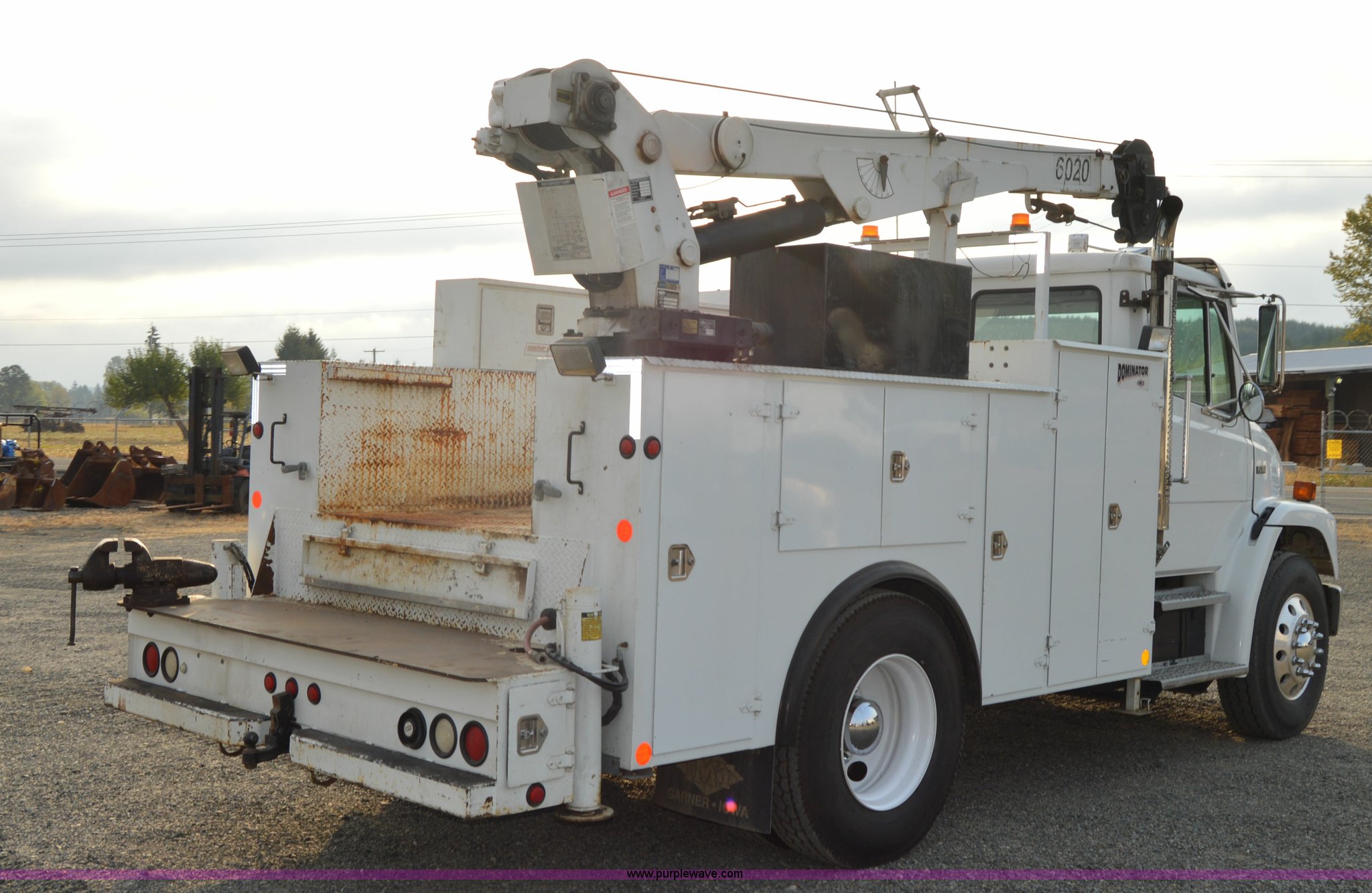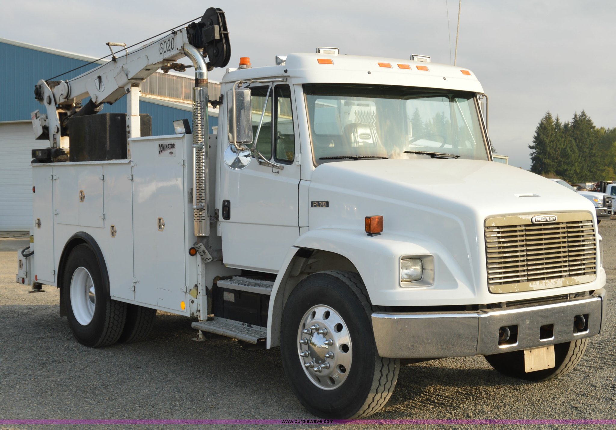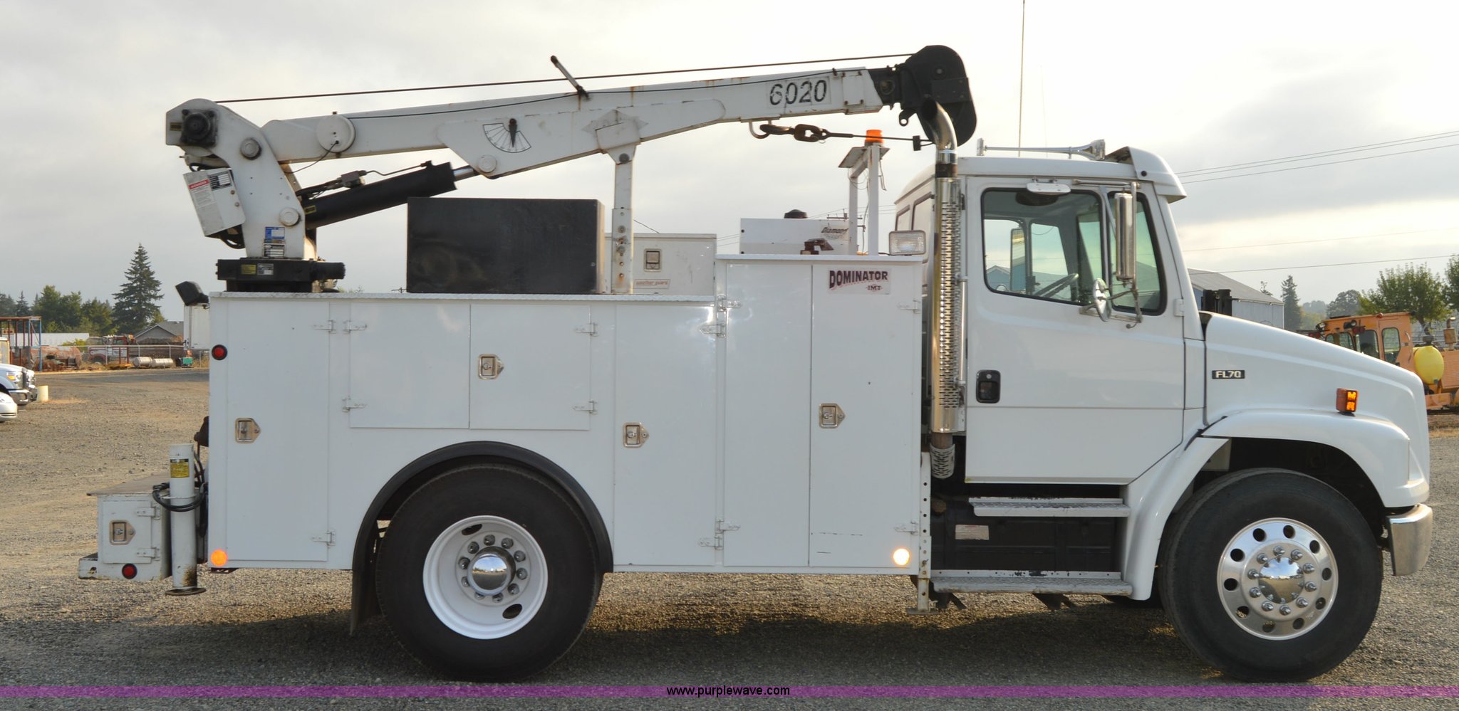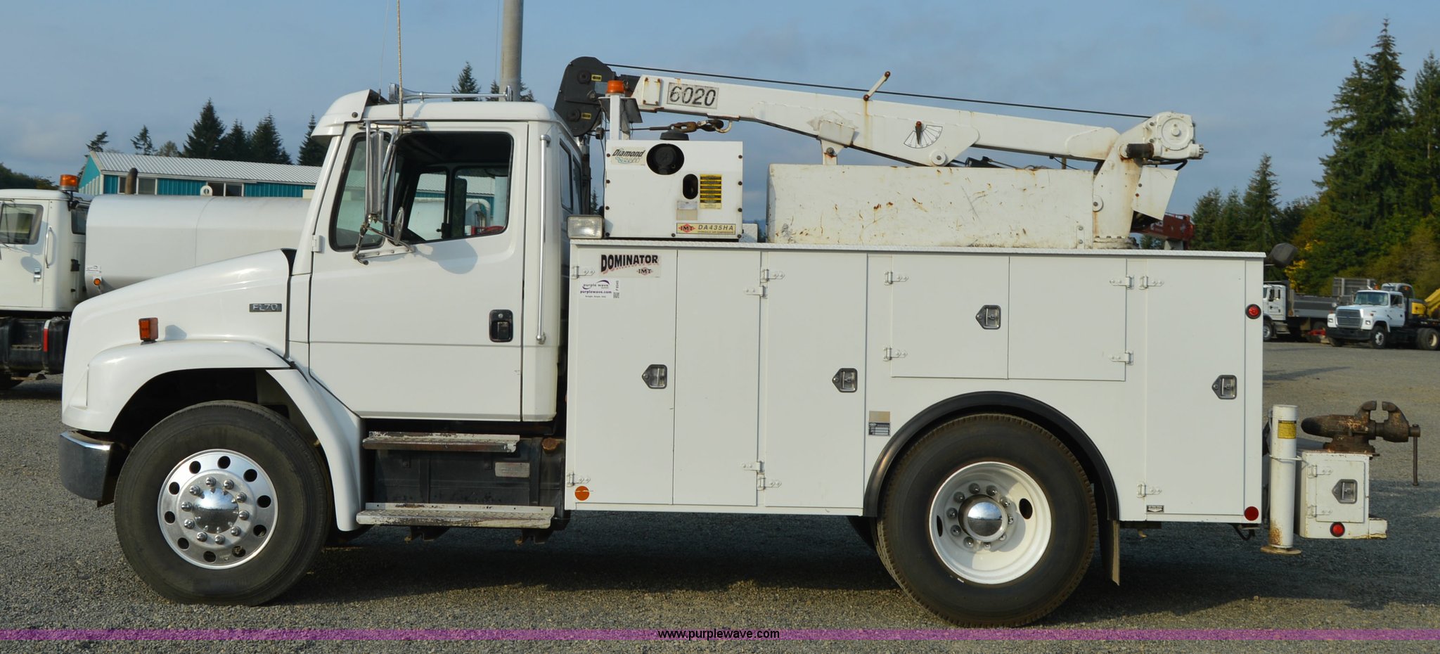 Purple Wave is selling a used Service Truck in Washington. This item is a 2000 Freightliner FL70 service truck with the following: 120,754 miles on odometer, 5,453 hours on meter, Caterpillar 3126 7.2L L6 diesel engine, Serial 8YL47709, Eaton Fuller nine speed manual transmission, AC and heat, Cruise, AM/FM/cassette, Manual windows and locks, Vinyl interior, Air suspension seat, Trailer brake controller, IMT D0M2-11 utility bed, Rear hydraulic outriggers, Rear work bench bumper, Rear vise, IMT DA435HA hydraulic air compressor, Work lights, Miller Trailblazer 28NT welder/generator, 337 hours on meter, 240/120V outputs, 8,000 watts, IMT Rotator 6020 crane, Model 170-00014-1, Serial 00B00023-01,, Exterior visor, Dual 50 gallon fuel tanks, Chrome front bumper, Air brakes, Aluminum wheels, 11R22.5 tires, GVWR 33,000 lbs, FAWR 12,000 lbs, RAWR 21,000 lbs, Unit# 110439