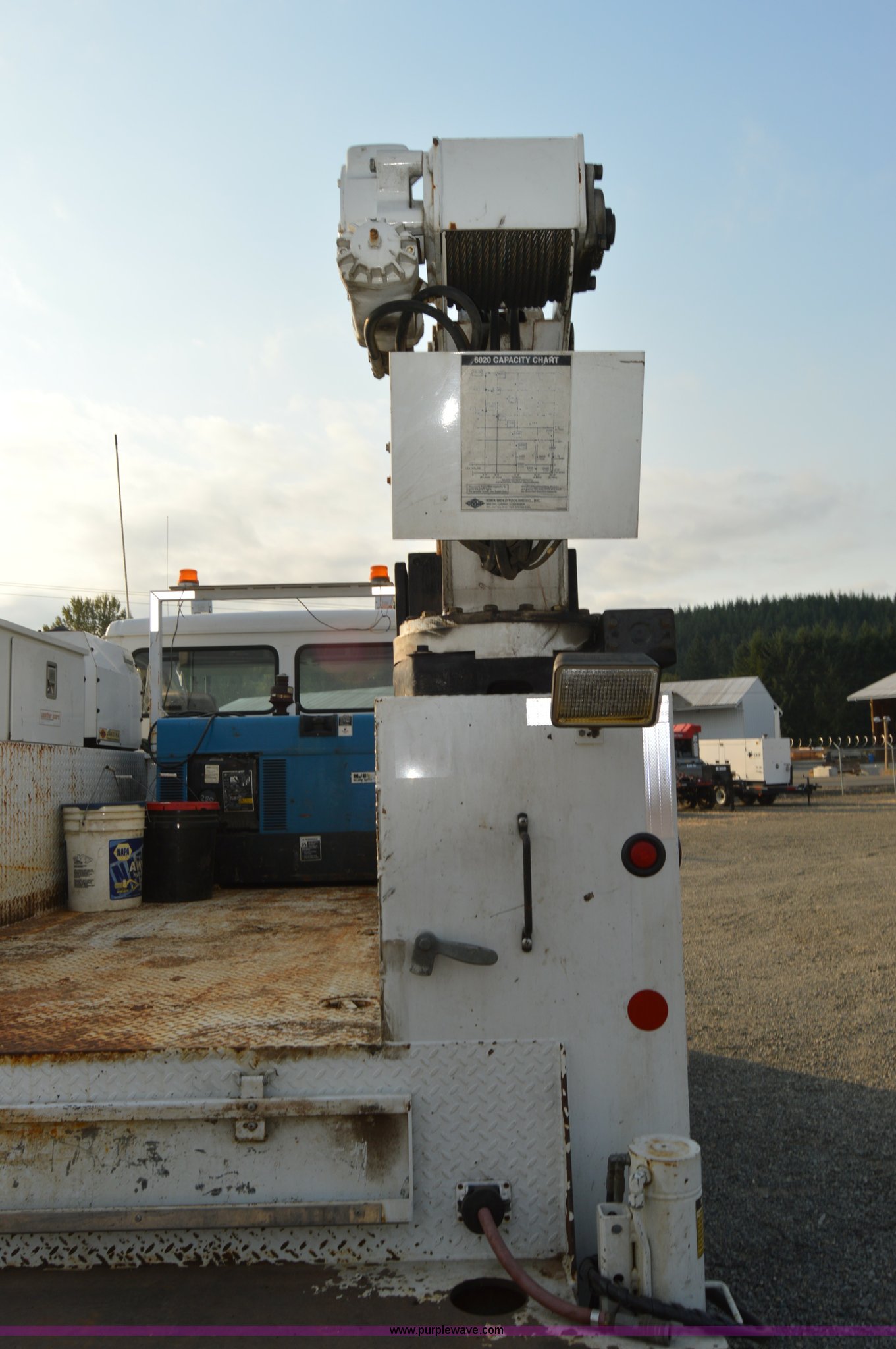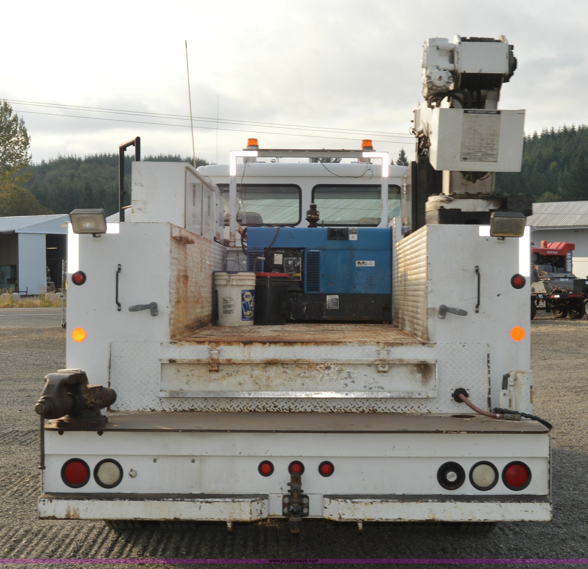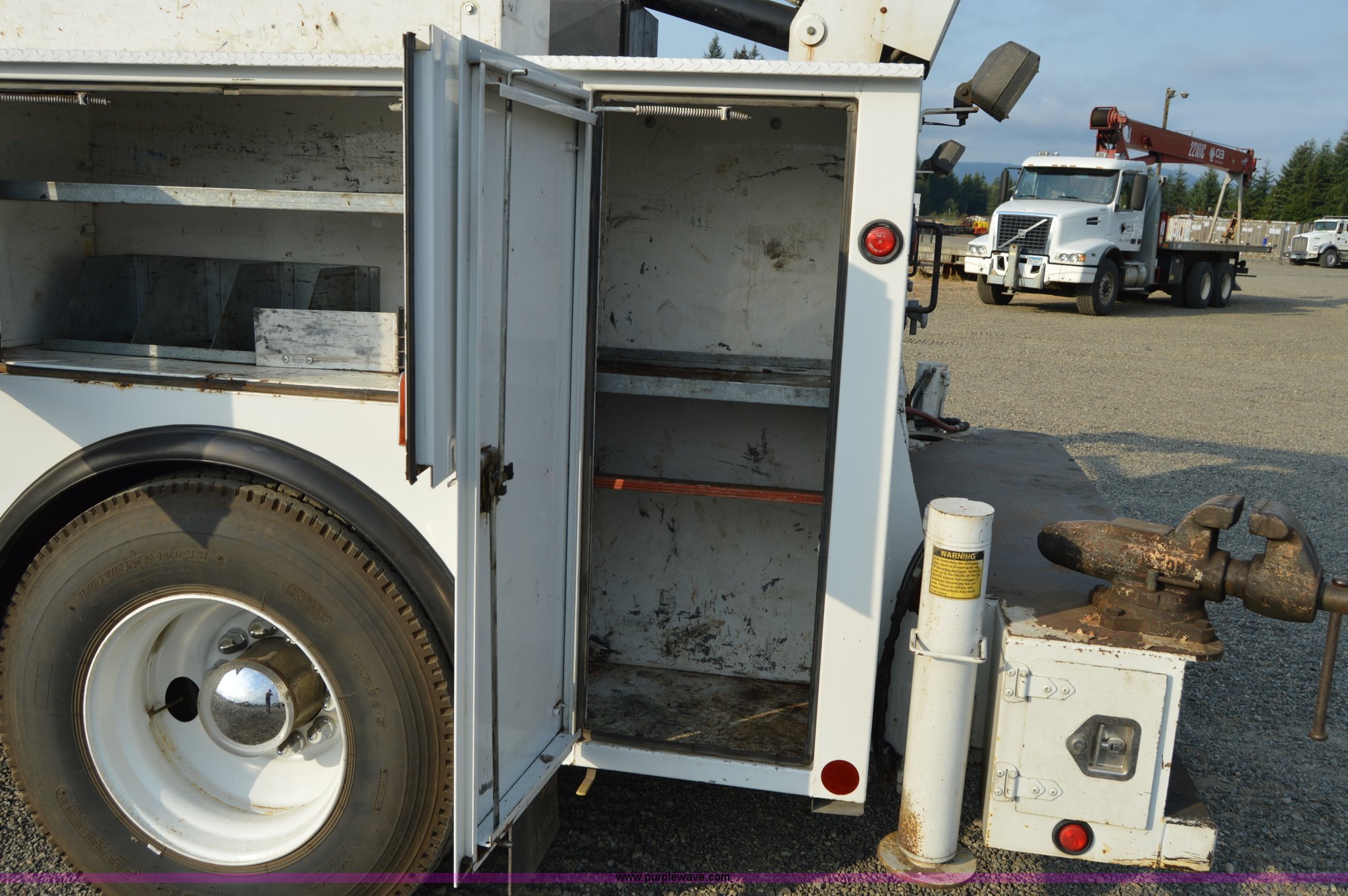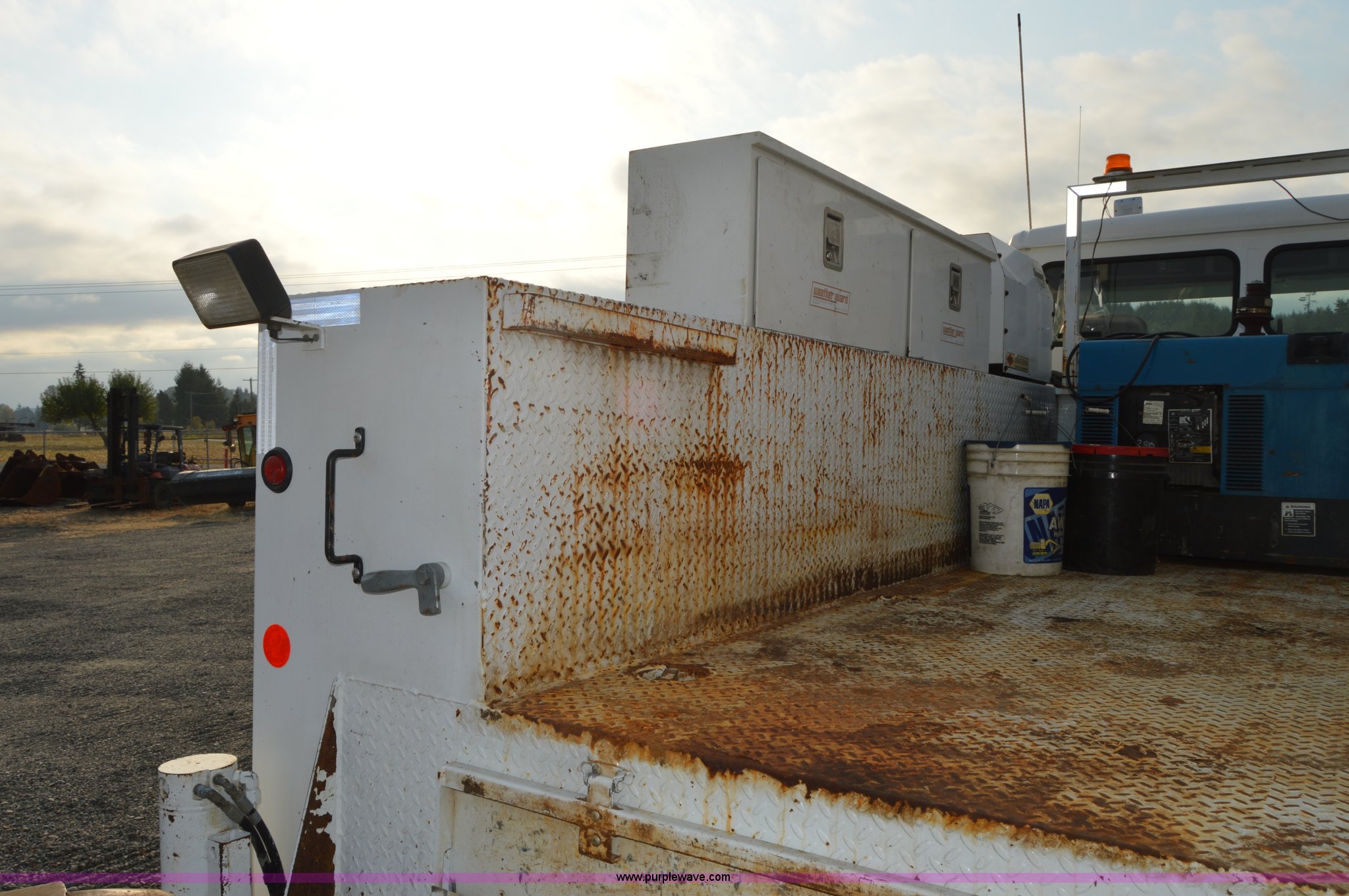 Purple Wave is selling a used Service Truck in Washington. This item is a 2000 Freightliner FL70 service truck with the following: 120,754 miles on odometer, 5,453 hours on meter, Caterpillar 3126 7.2L L6 diesel engine, Serial 8YL47709, Eaton Fuller nine speed manual transmission, AC and heat, Cruise, AM/FM/cassette, Manual windows and locks, Vinyl interior, Air suspension seat, Trailer brake controller, IMT D0M2-11 utility bed, Rear hydraulic outriggers, Rear work bench bumper, Rear vise, IMT DA435HA hydraulic air compressor, Work lights, Miller Trailblazer 28NT welder/generator, 337 hours on meter, 240/120V outputs, 8,000 watts, IMT Rotator 6020 crane, Model 170-00014-1, Serial 00B00023-01,, Exterior visor, Dual 50 gallon fuel tanks, Chrome front bumper, Air brakes, Aluminum wheels, 11R22.5 tires, GVWR 33,000 lbs, FAWR 12,000 lbs, RAWR 21,000 lbs, Unit# 110439