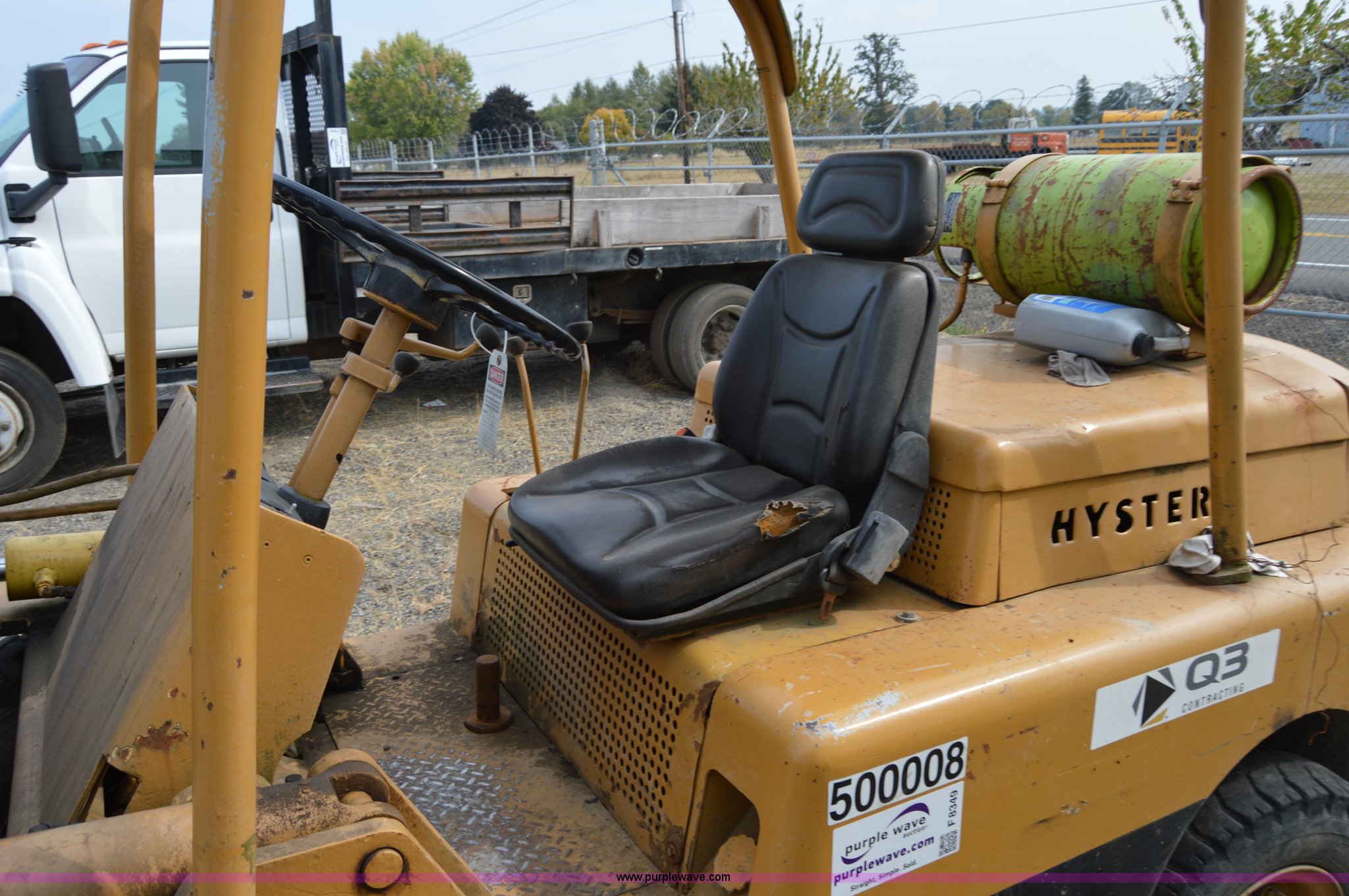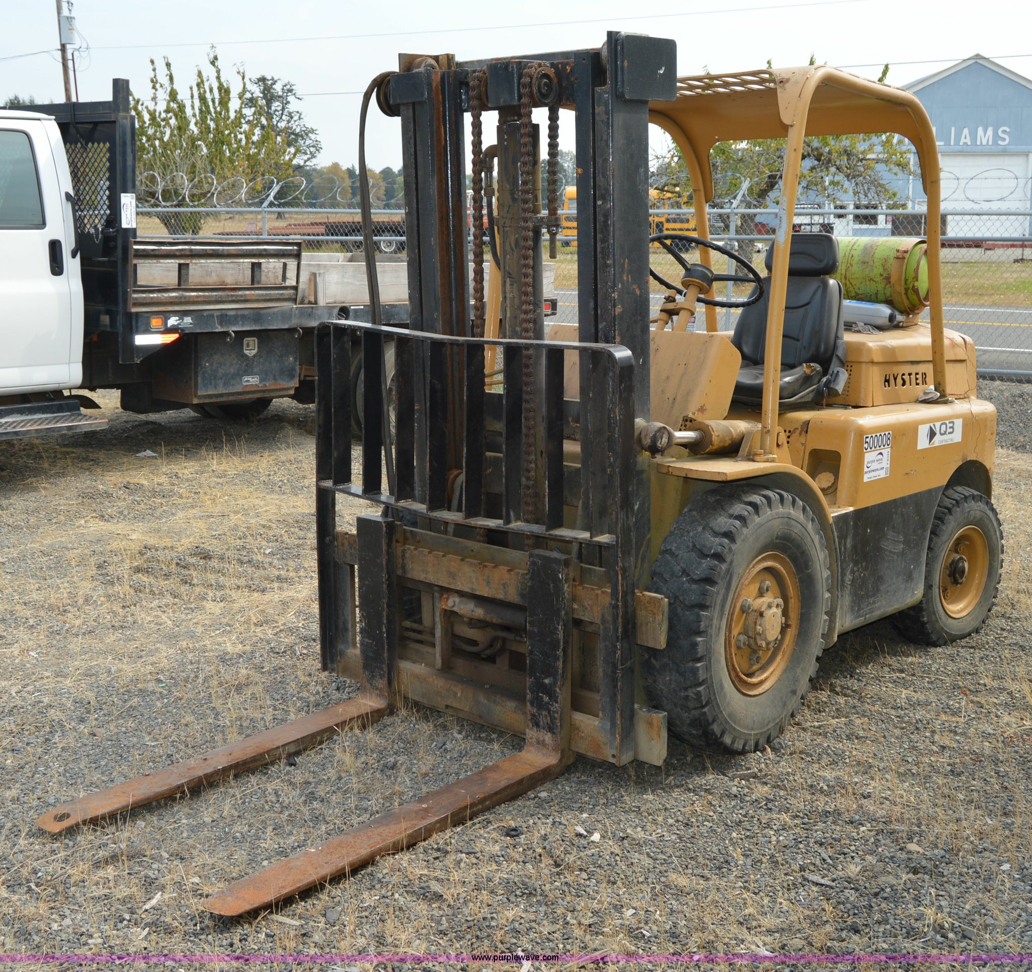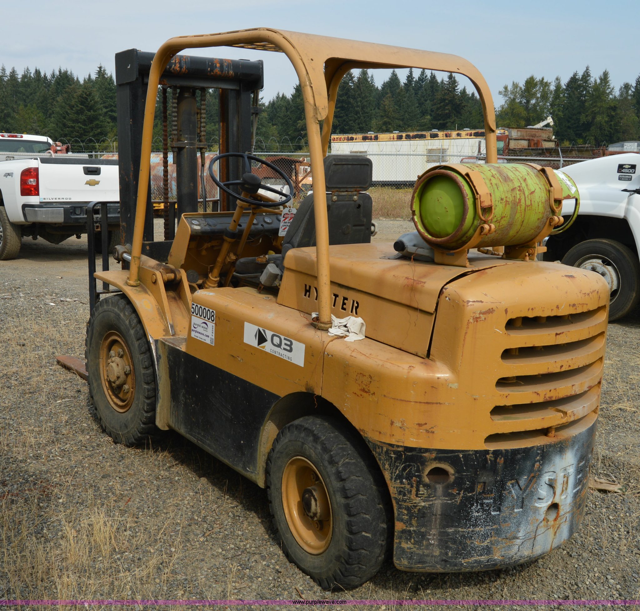 Hyster forklift. Six cylinder propane engine, Shuttle shift transmission 2F-2R gears, Two stage mast, 4'L x 5"W x 2" thick forks, 45"W adjustable fork spread, 8.25-15 front tires, 7-12 rear tires, Non-operational brakes, Unit# 500008. Q3 Contracting. 954 Jackson Highway South. Toledo, WA 98591