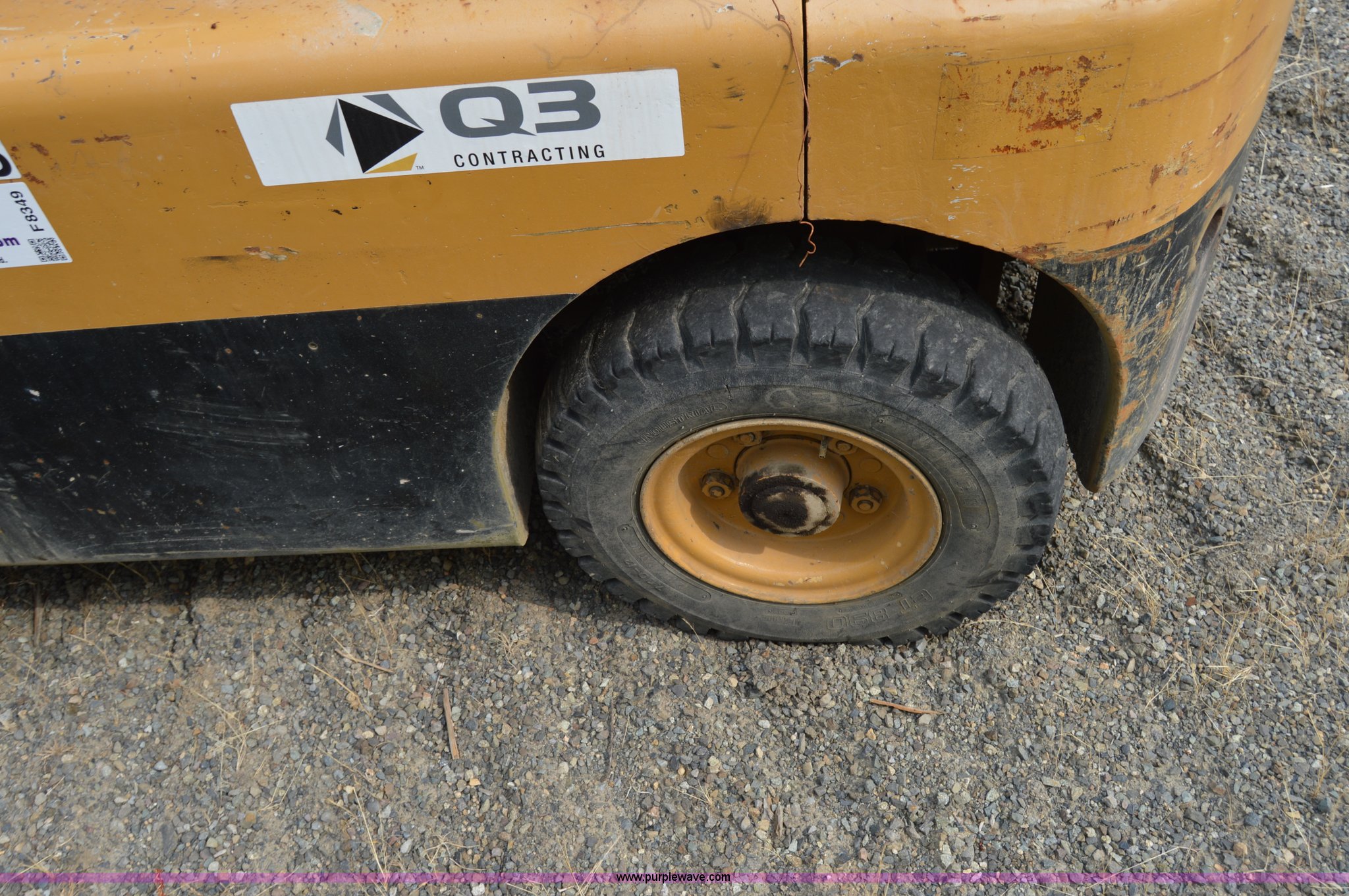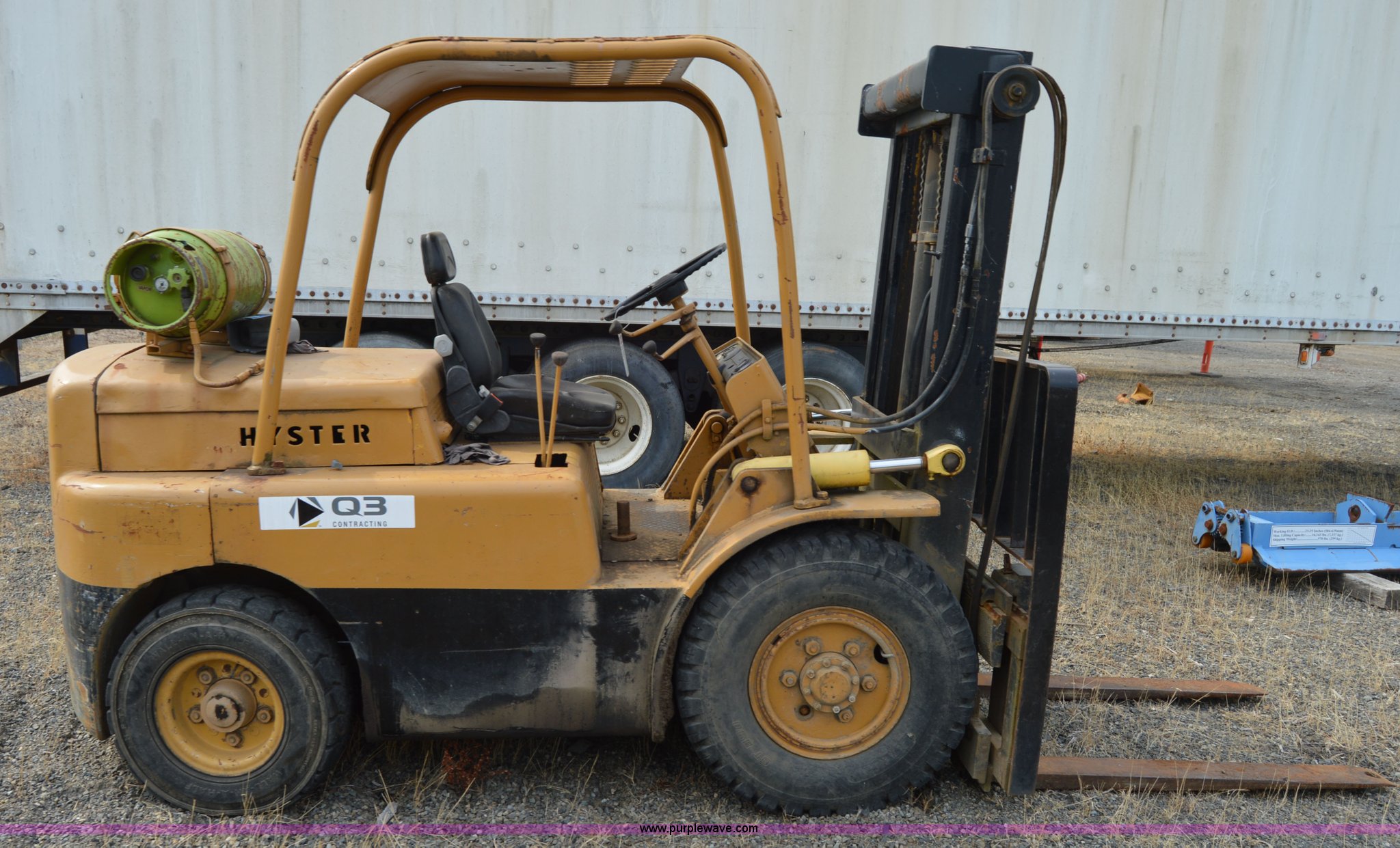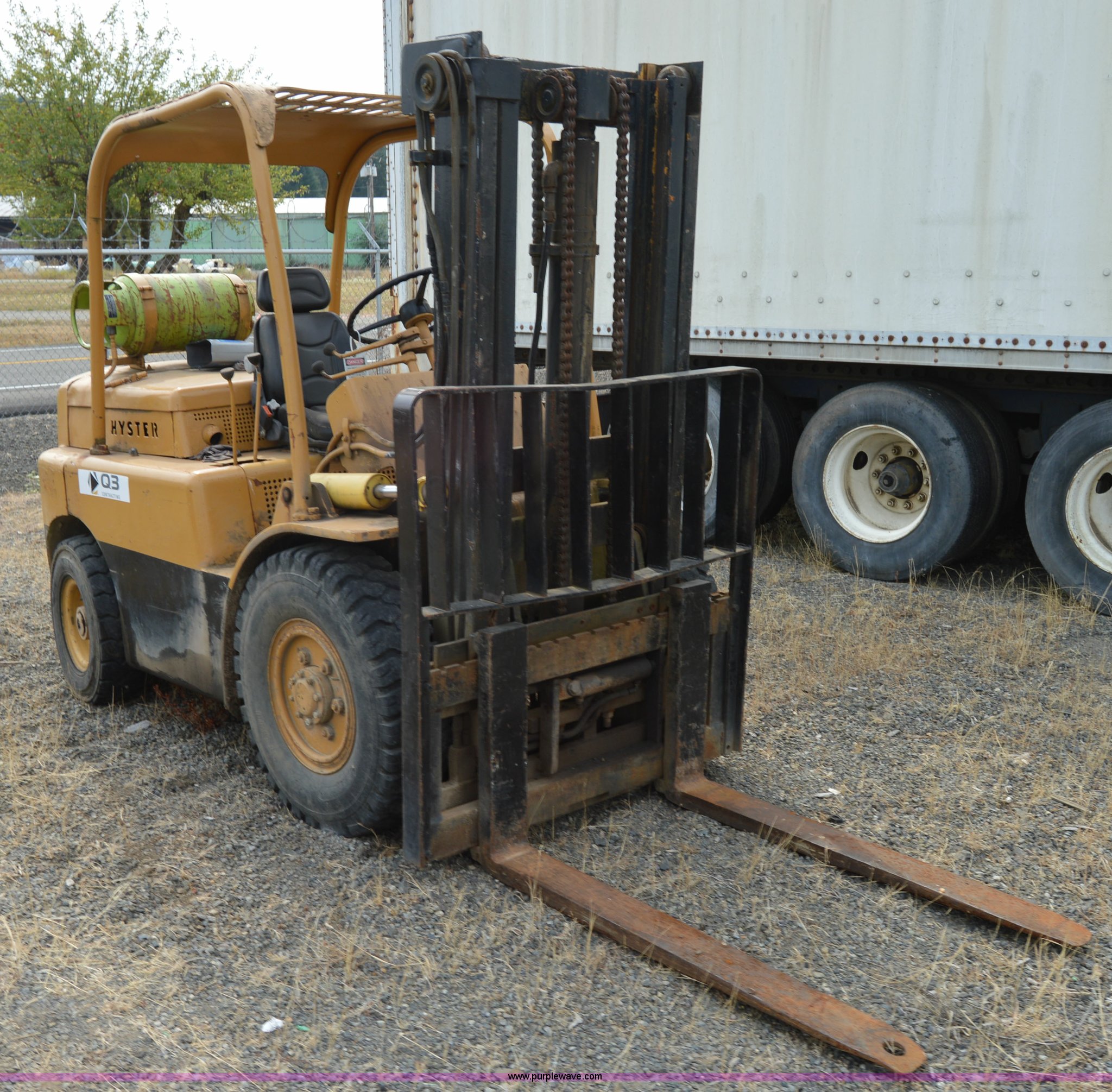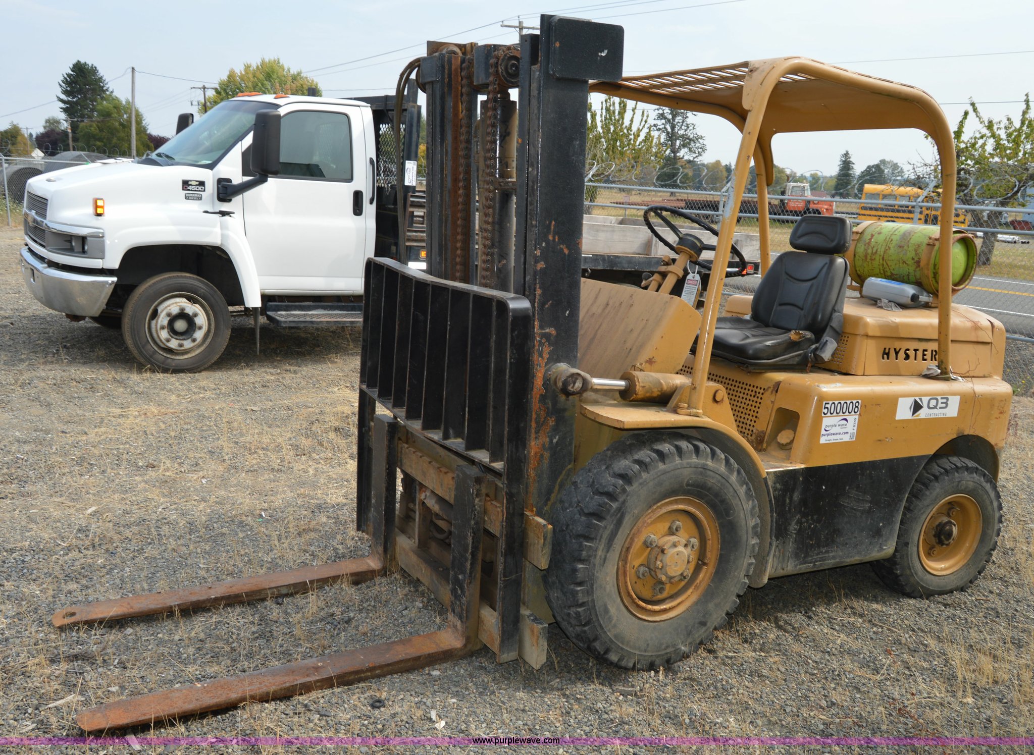 Hyster forklift. Six cylinder propane engine, Shuttle shift transmission 2F-2R gears, Two stage mast, 4'L x 5"W x 2" thick forks, 45"W adjustable fork spread, 8.25-15 front tires, 7-12 rear tires, Non-operational brakes, Unit# 500008. Q3 Contracting. 954 Jackson Highway South. Toledo, WA 98591