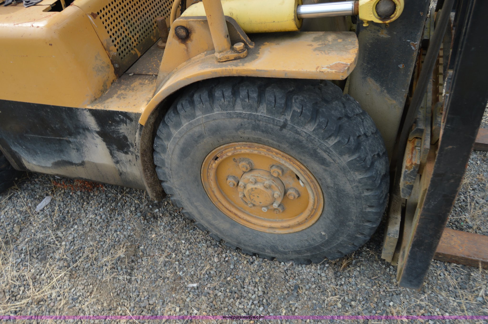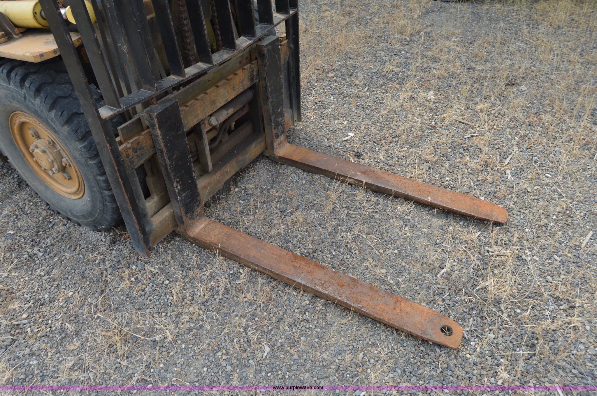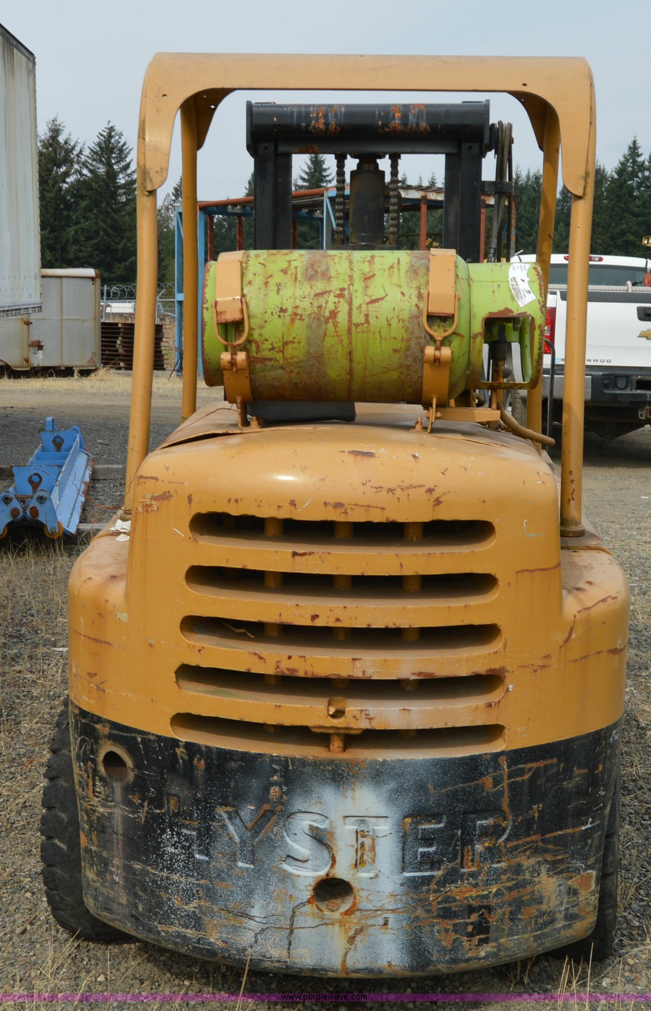 Purple Wave is selling a used Cushion Tire or Pneumatic Forklift in Washington. This item is a Hyster forklift with the following: Six cylinder propane engine, Shuttle shift transmission, 2F-2R gears, Two stage mast, 4'L x 5"W x 2" thick forks, 45"W adjustable fork spread, 8.25-15 front tires, 7-12 rear tires, Non-operational brakes, Unit# 500008