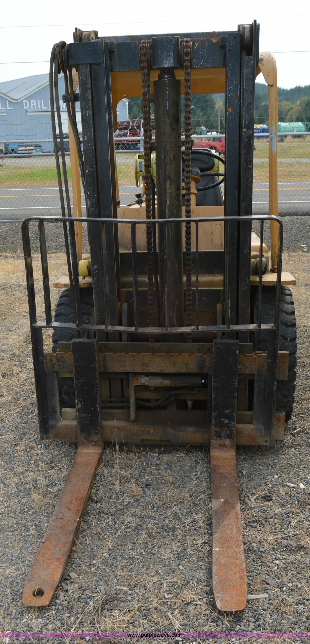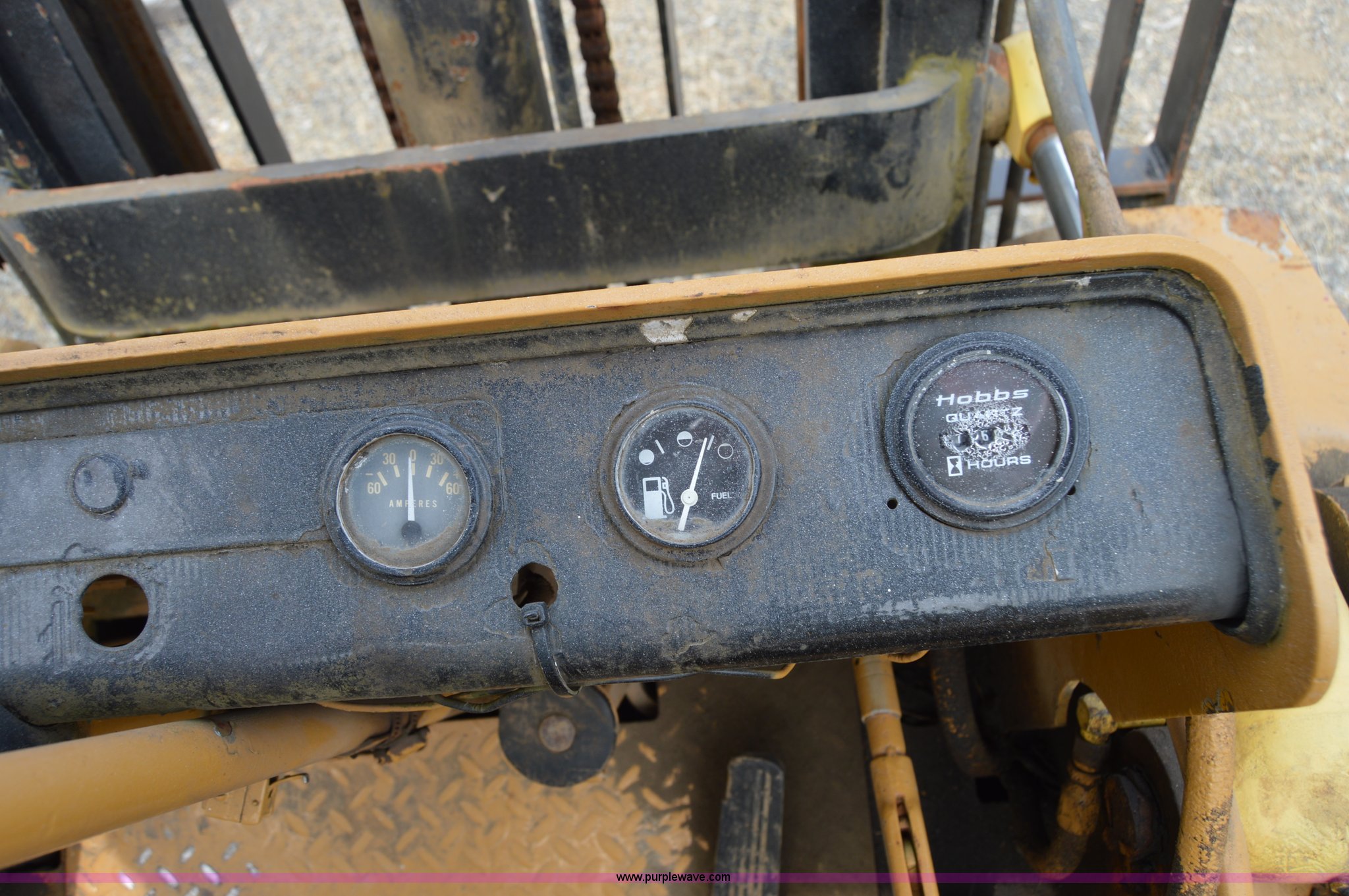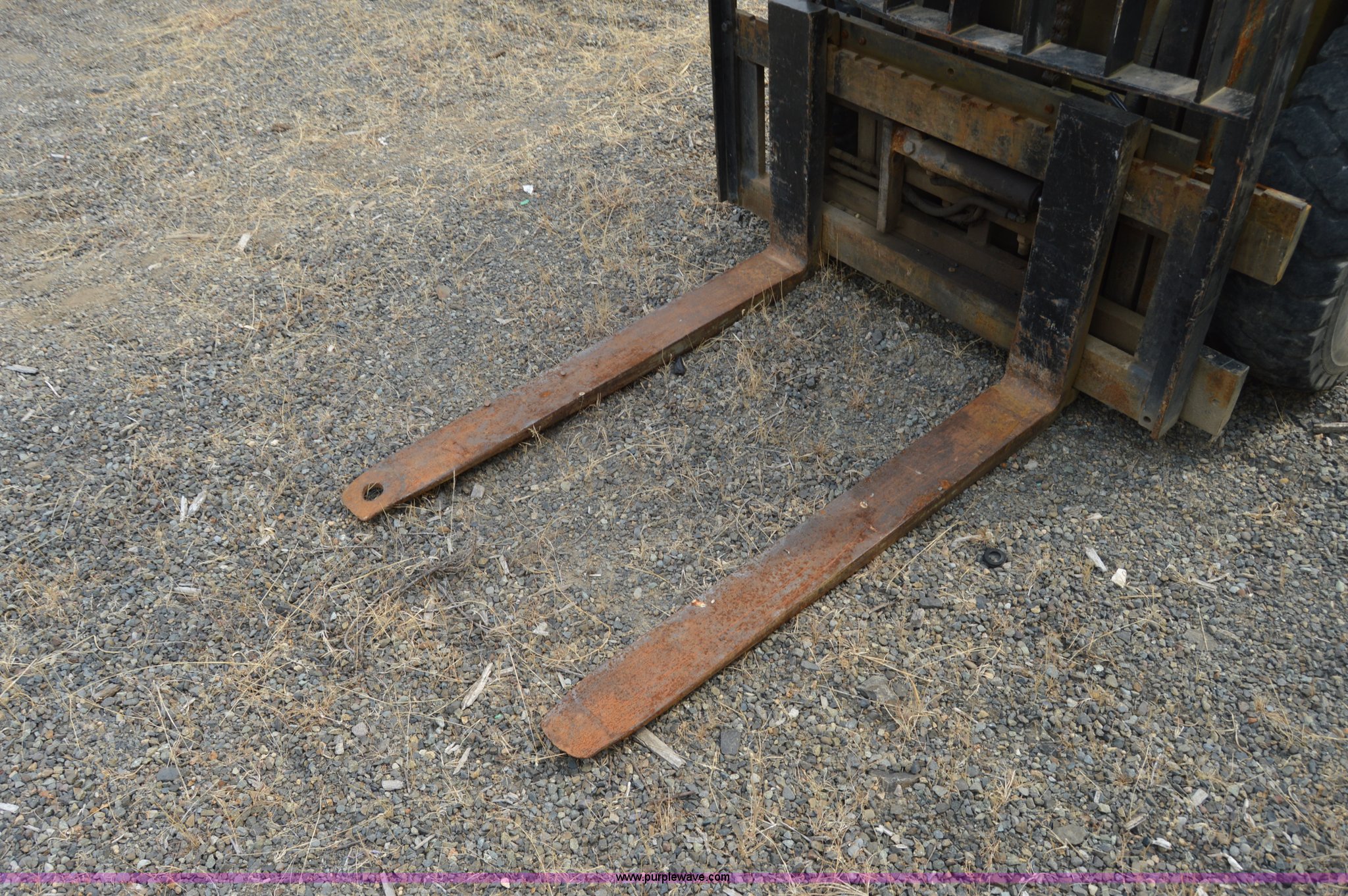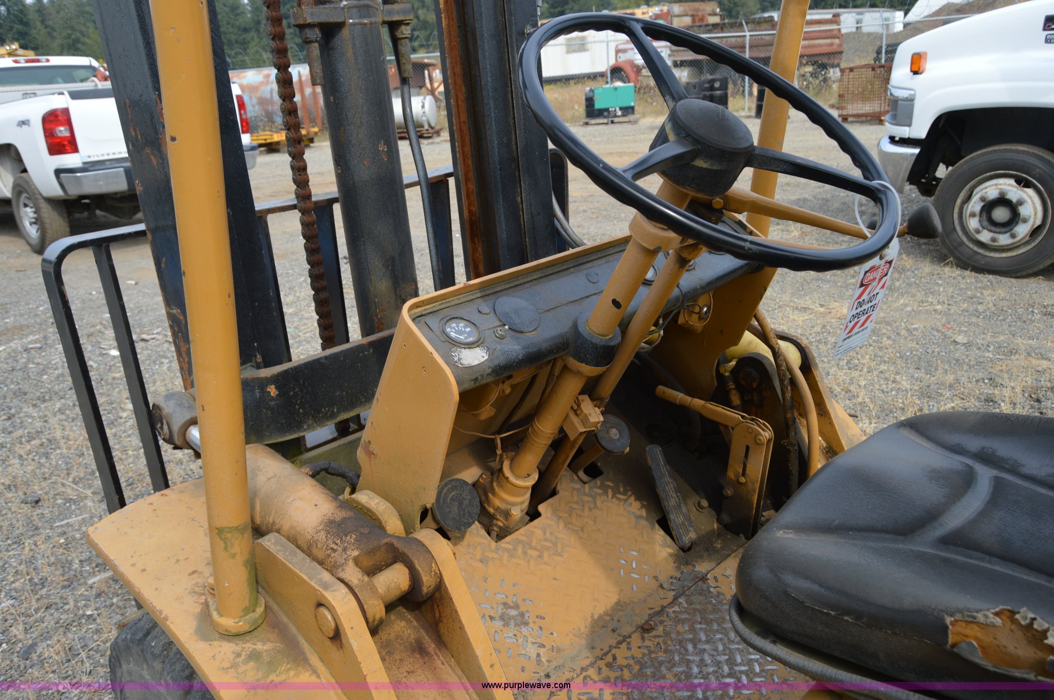 Purple Wave is selling a used Cushion Tire or Pneumatic Forklift in Washington. This item is a Hyster forklift with the following: Six cylinder propane engine, Shuttle shift transmission, 2F-2R gears, Two stage mast, 4'L x 5"W x 2" thick forks, 45"W adjustable fork spread, 8.25-15 front tires, 7-12 rear tires, Non-operational brakes, Unit# 500008