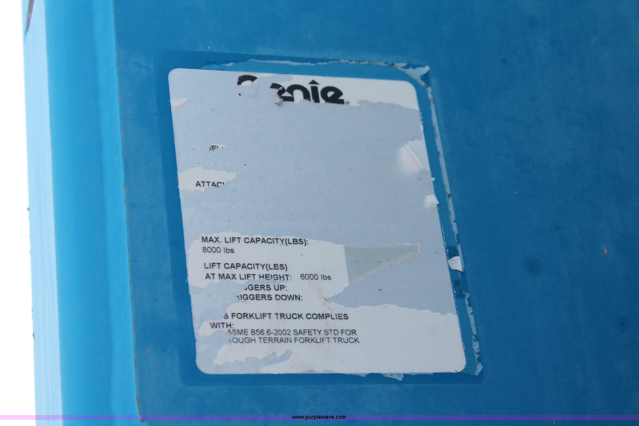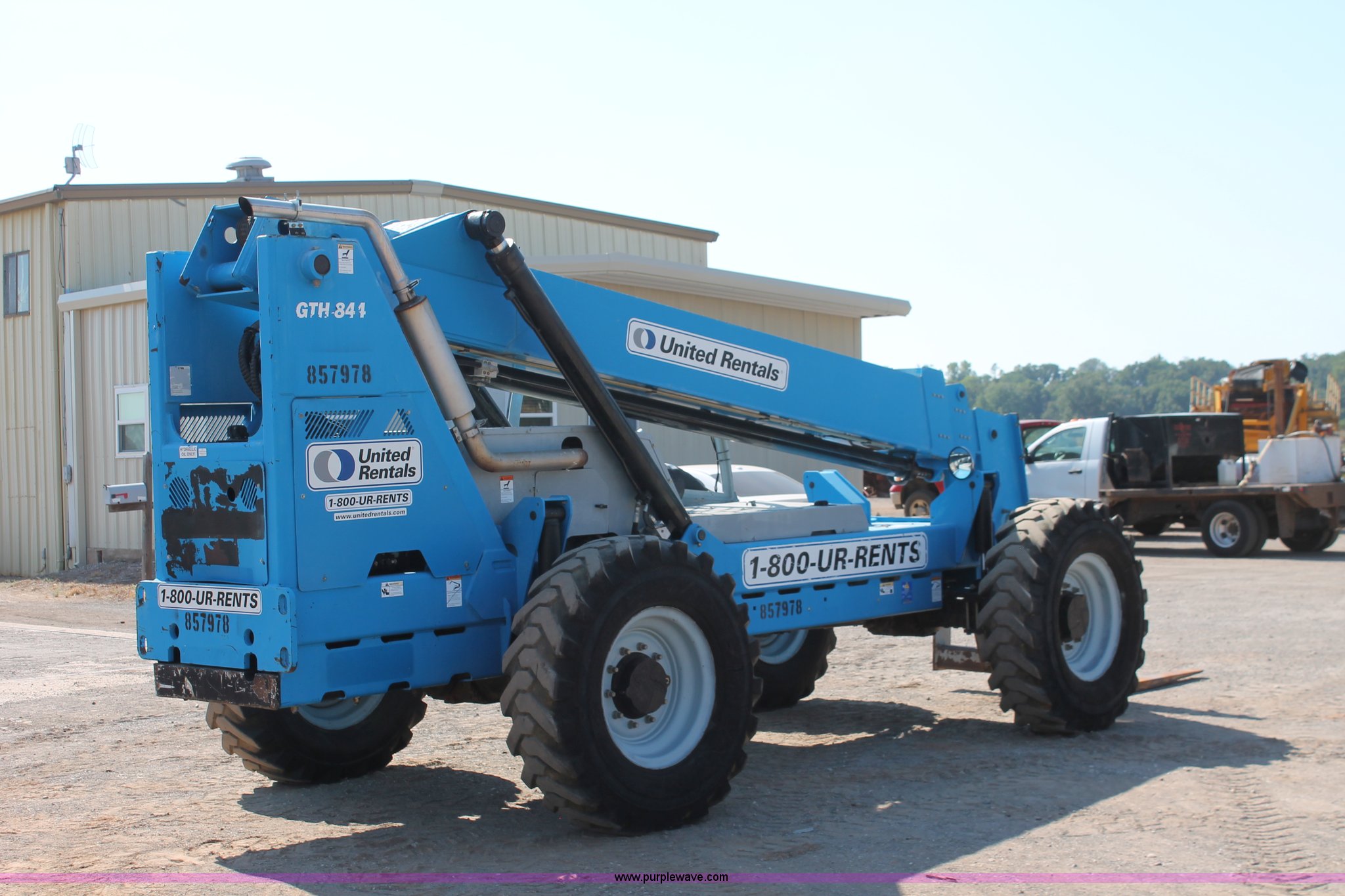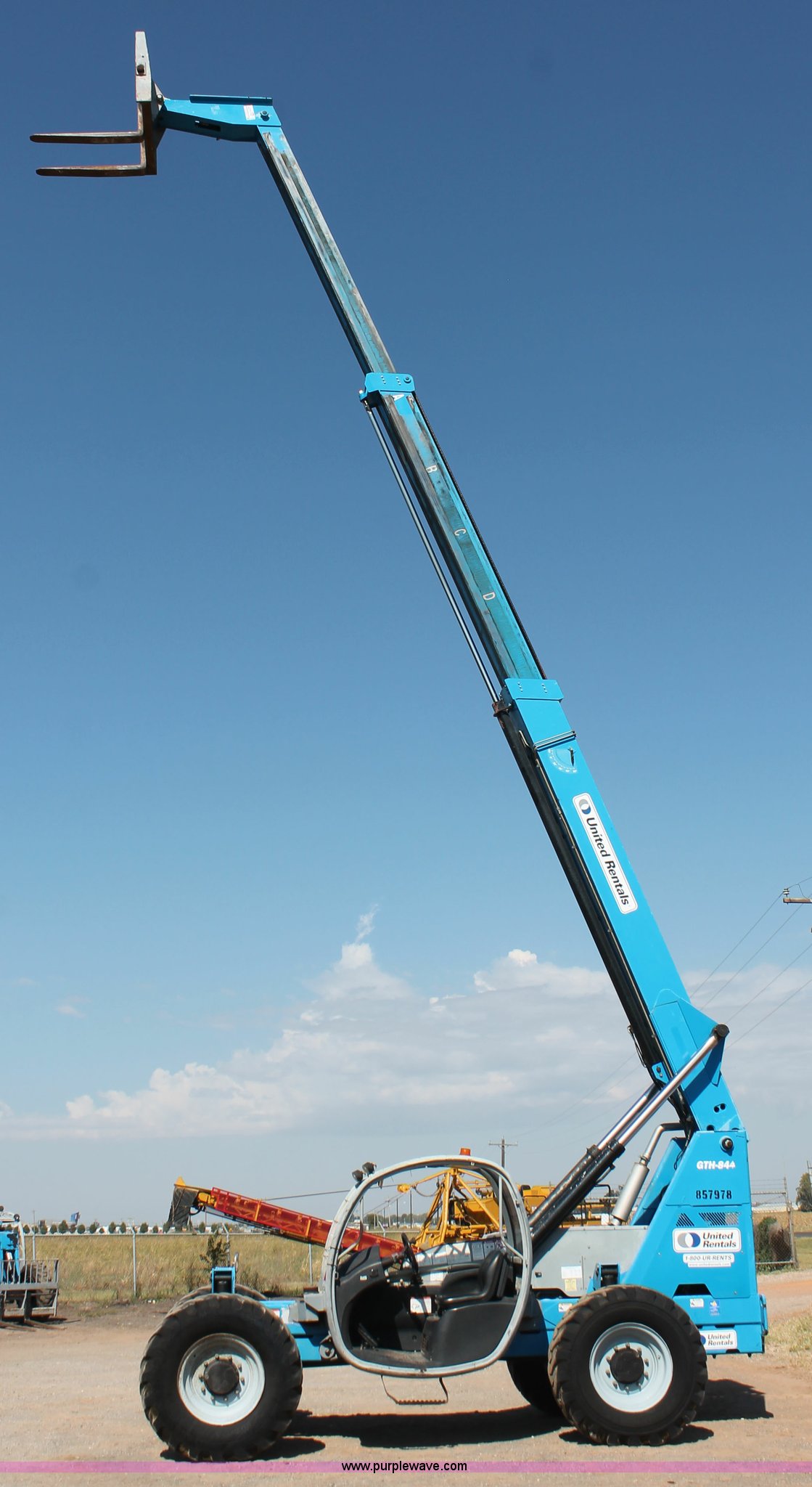 Purple Wave is selling a used Telehandler in Oklahoma. This item is a 2006 Genie GTH-844 telehandler with the following: 4,729 hours on meter, Deutz four cylinder diesel engine, Powershift transmission, 3F-3R gears, Four wheel drive, Crab steer, Circle steer, ROPS, Work lights, Amber warning beacon, 8,000 lbs maximum lift capacity, 44' maximum reach, Three boom sections, 48"L x 5"W forks, 50" x 42" carriage, Tilt carriage, Auxiliary hydraulics, Hydraulic leveling, 14.00-24 foam filled tires, Operator and safety manuals, Serial GTH0806B7211