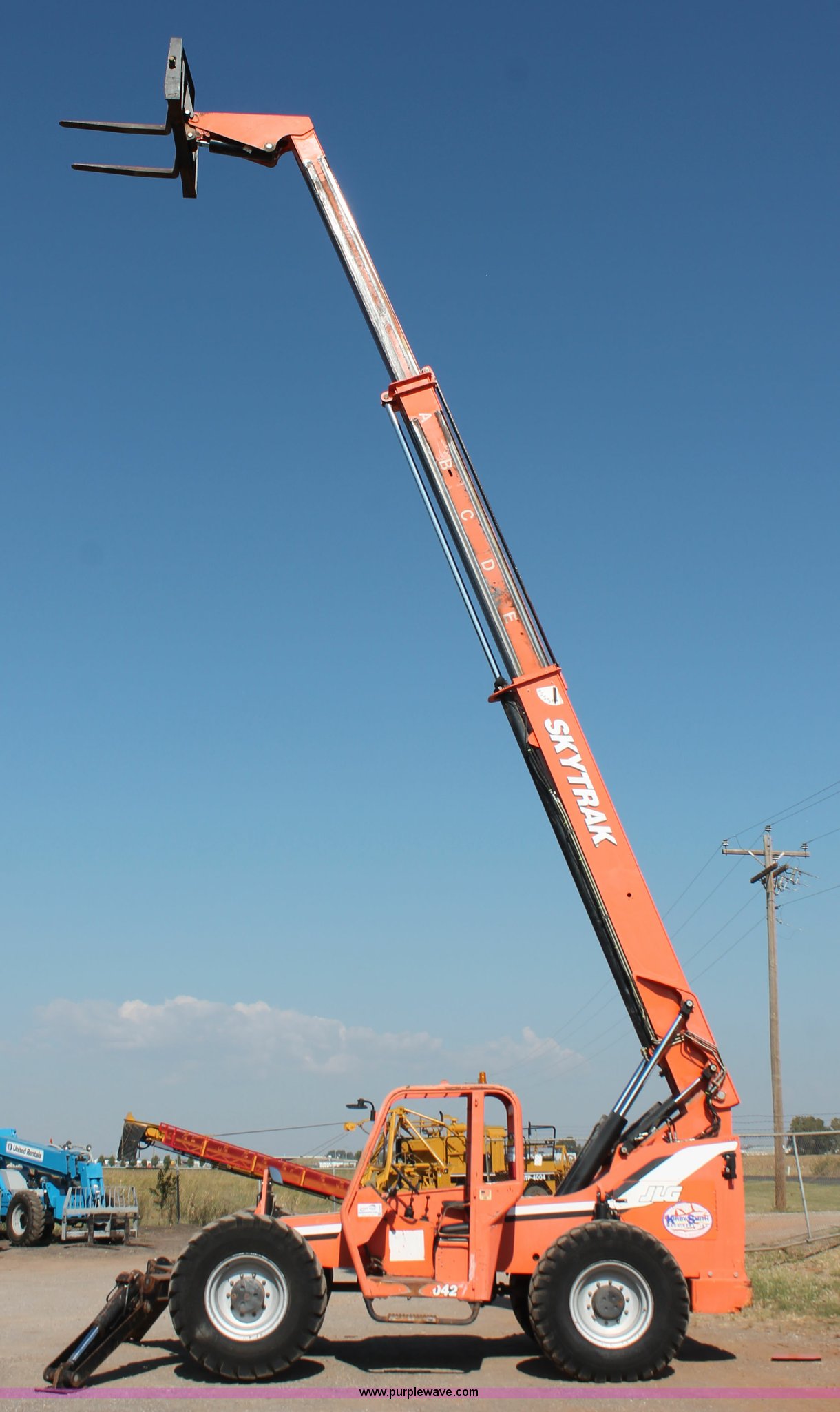 Purple Wave is selling a used Telehandler in Oklahoma. This item is a 2006 SkyTrak 10042 telehandler with the following: 1,022 hours on meter, Cummins QS84.5 four cylinder diesel engine, 110 HP, Serial 30230093, Powershift transmission, 4F-4R gears, Four wheel drive, Crab steer, Circle steer, ROPS, Amber beacon, Work lights, 10,000 lbs lift capacity, 42'L reach, (3) boom sections, 48" x 4" forks, 72" x 42" carriage, Hydraulic outriggers, Tilt carriage, Auxiliary hydraulics, Hydraulic leveling, 17.5-25 tires, 28,900 lbs. base operating weight, Operation and safety manuals, Serial 0160025939
