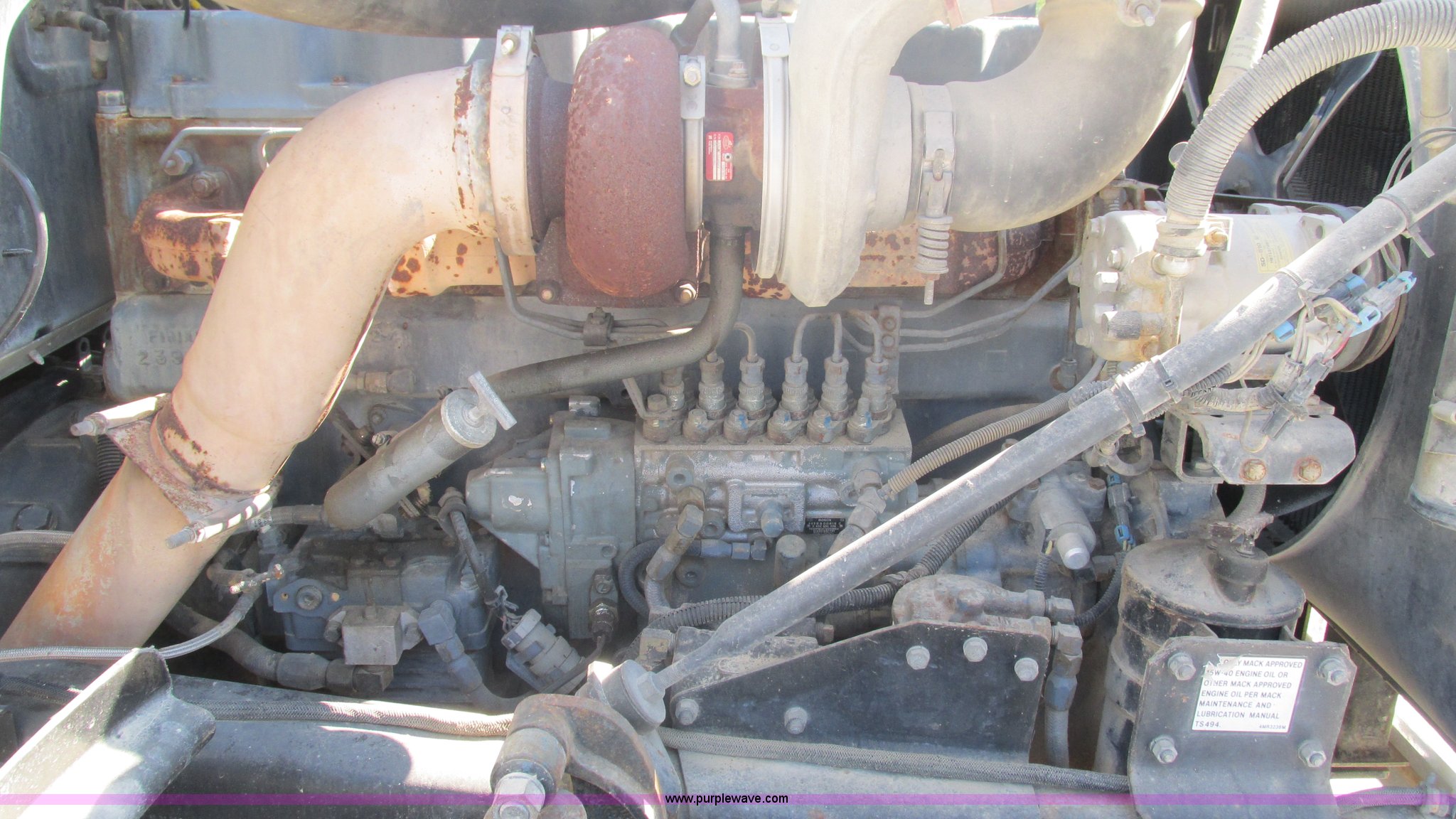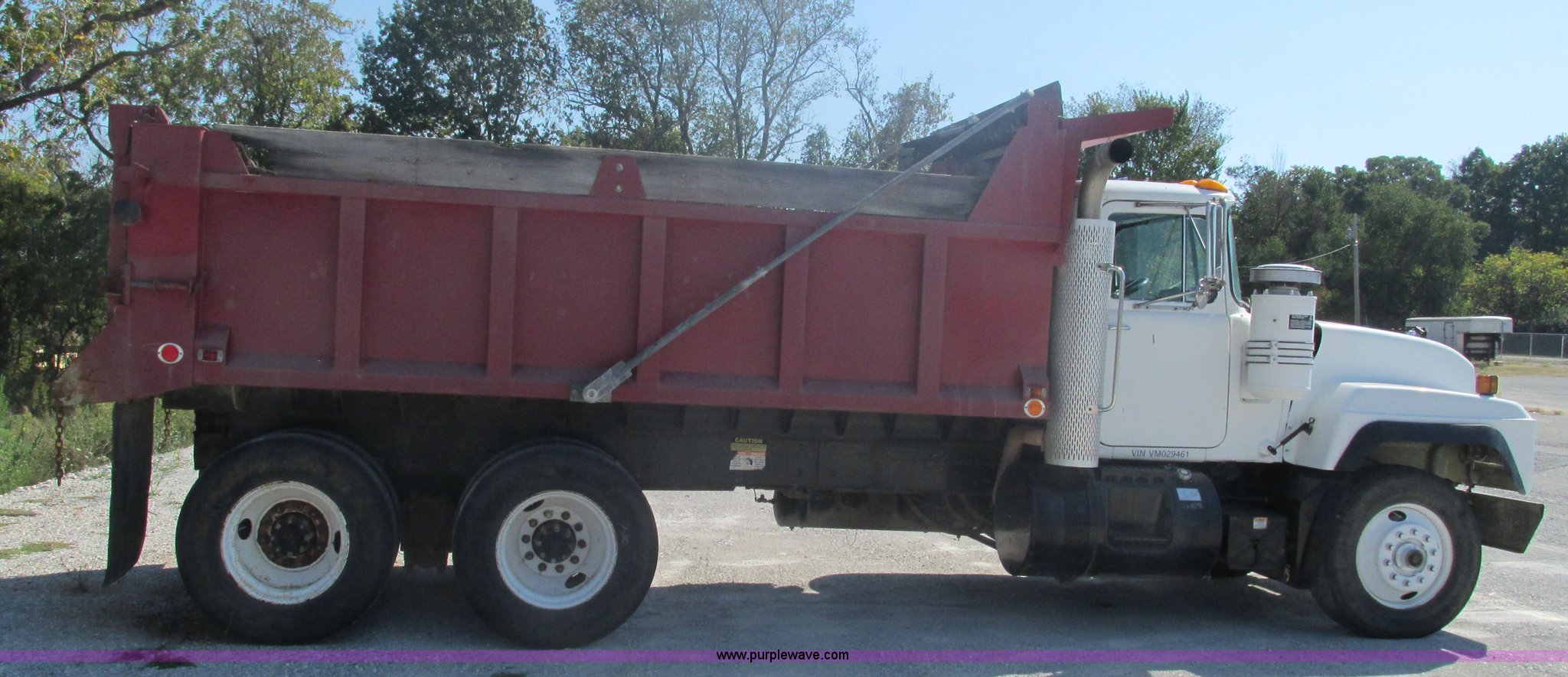 Purple Wave is selling a used Construction Dump Truck in Missouri. This item is a 1997 Mack RD688S dump truck with the following: 178,216 miles on odometer, Mack E7 12.0L L6 diesel engine, 350 HP, Maxi Torque T2090 nine speed manual transmission, Twin screw, AC and heat, AM/FM/CD, Spring suspension seat, Air ride cab, Heated mirrors, 14'L x 8'W x 39"H dump bed, Rollover tarp, Three stage single ram, Air end gate, Side boards damaged, Chrome bumper, Dual 150 gallon fuel tanks, PTO, Mack Camelback spring suspension, Air brakes, 275/80R22.5 tires, Interior/exterior cosmetic damage, Hood cracked