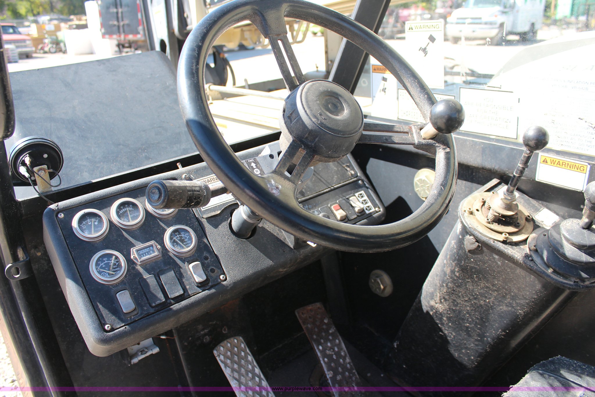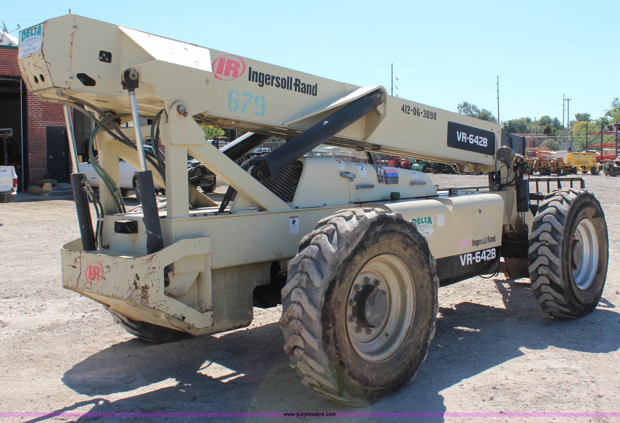 Purple Wave is selling a used Telehandler in Kansas. This item is a 2003 Ingersoll Rand VR642B telehandler with the following: 5,007 hours on meter, Cummins four cylinder diesel engine, 99 HP, Powershift transmission, 3F-3R gears, Four wheel drive, Crab steer, Circle steer, ROPS, 6,700 lbs lift capacity, 42' reach length, (3) boom sections, 48" x 4" fork lengths, Tilt carriage, Rotating carriage, 13-24 foam-filled tires, 18,600 lbs. base operating weight, Used tires installed since the initial listing, Serial 173296