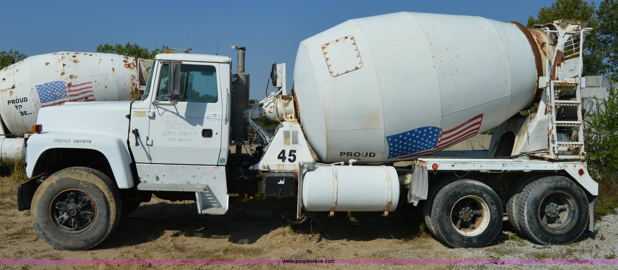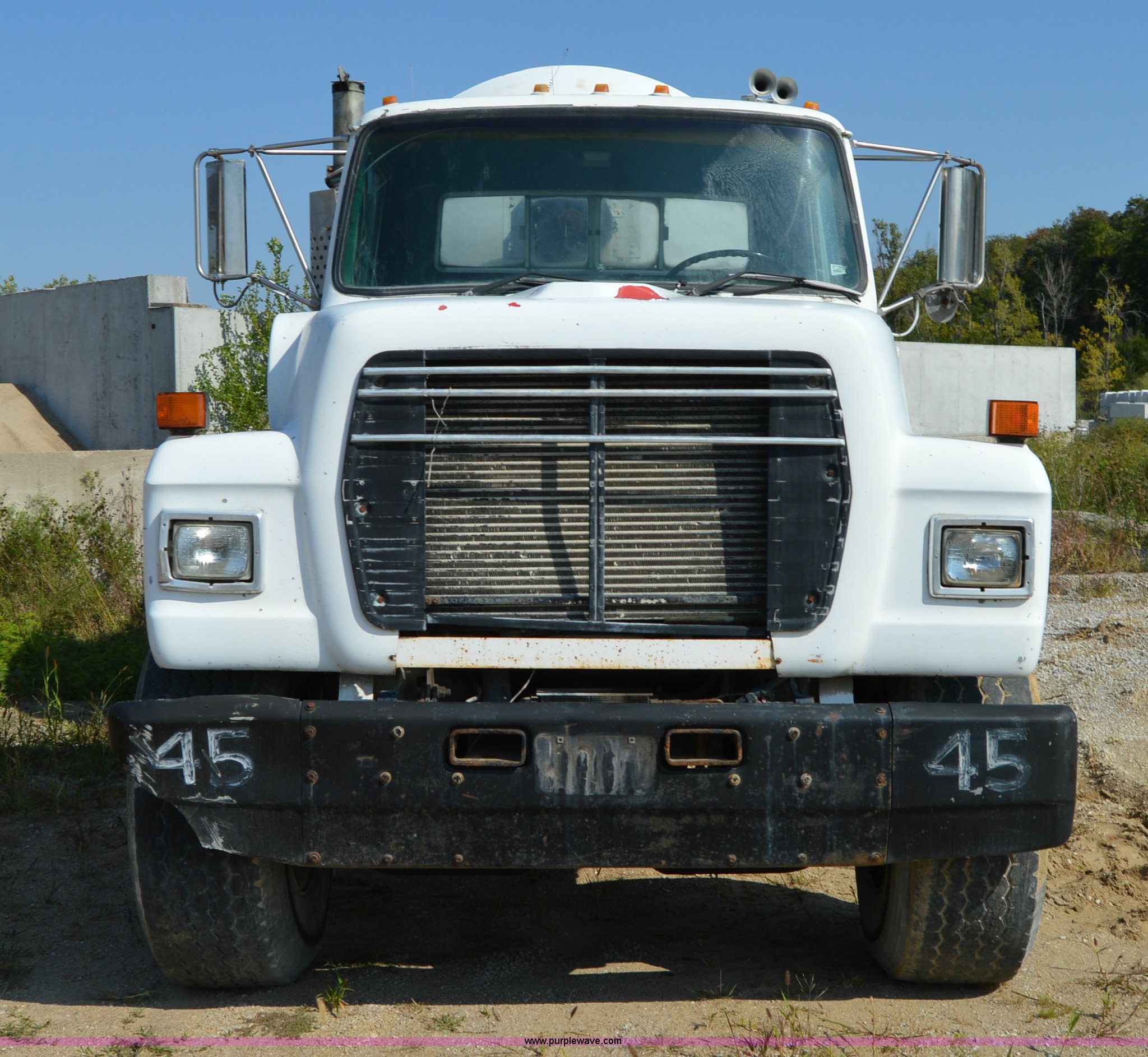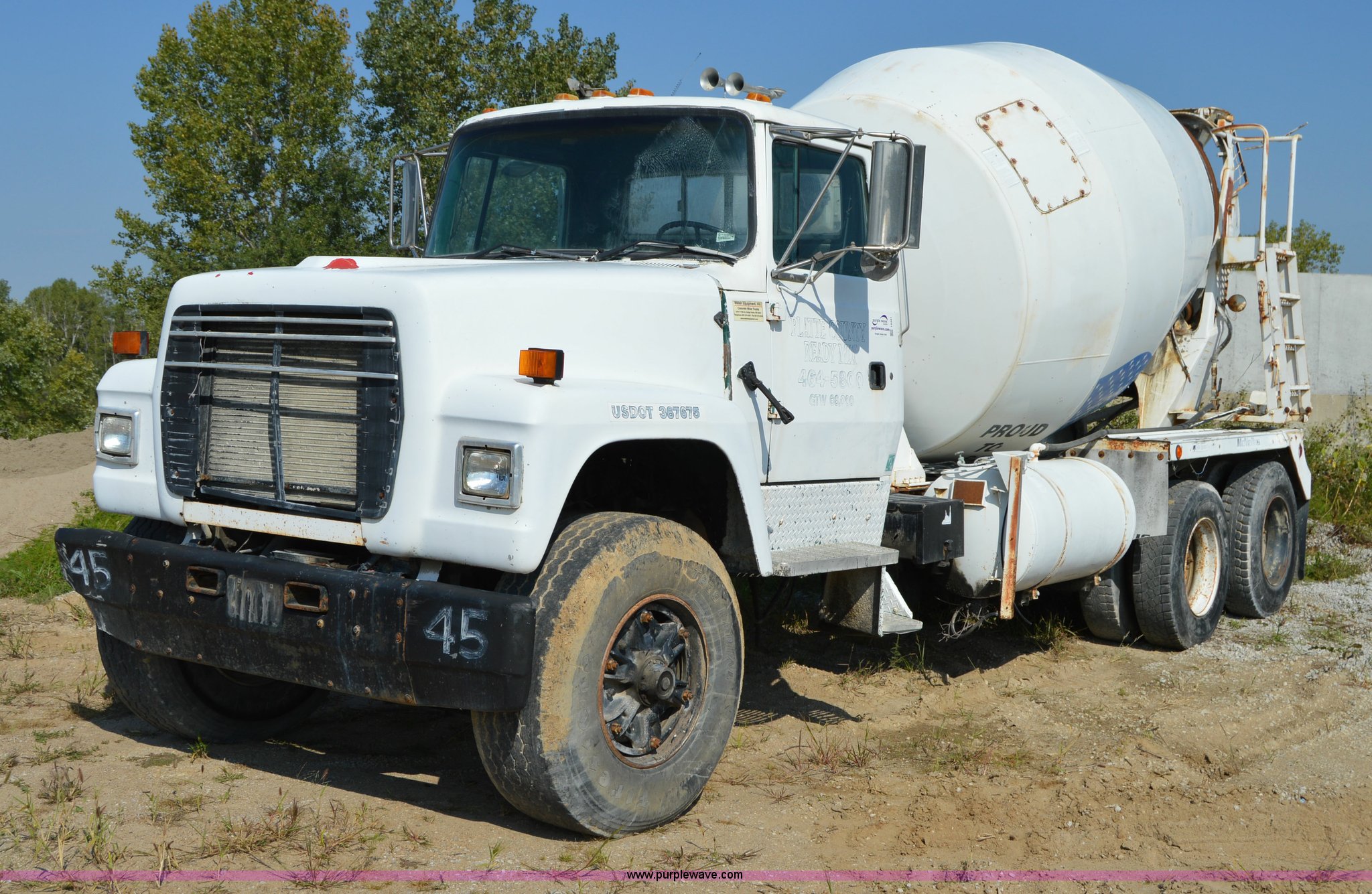 Purple Wave is selling a used Ready Mix or Pump Truck in Missouri. This item is a 1995 Ford LT9000 mixer truck with the following: 177,991 miles on odometer, Cummins L10 10.6L L6 diesel engine, Eaton Fuller seven speed manual transmission, Heat, Air suspension seat, PTO, 10.5 cubic yard mixer, 40 gallon fuel tank, Drop hammer pile driver, Spring suspension, Air brakes, 240" wheelbase, 425/65R22.5 front tires, 11R22.5 rear tires, GVWR 60,000 lbs, FAWR 20,000 lbs, IAWR 20,000 lbs, RAWR 20,000 lbs, Interior/exterior cosmetic damage, Windshield cracked, Batteries dead, Michigan tilt cylinder blade is not included, Unit# 45
