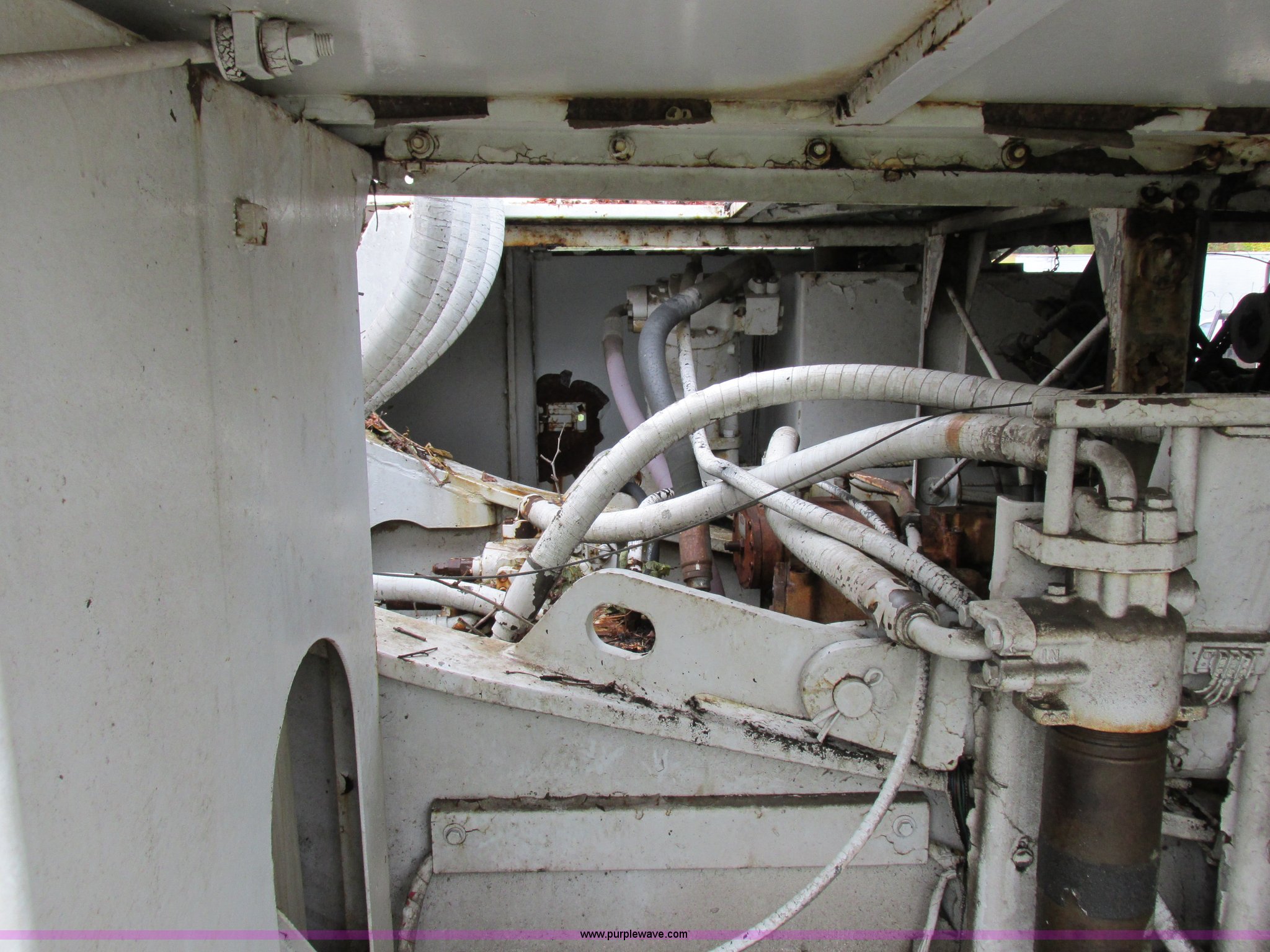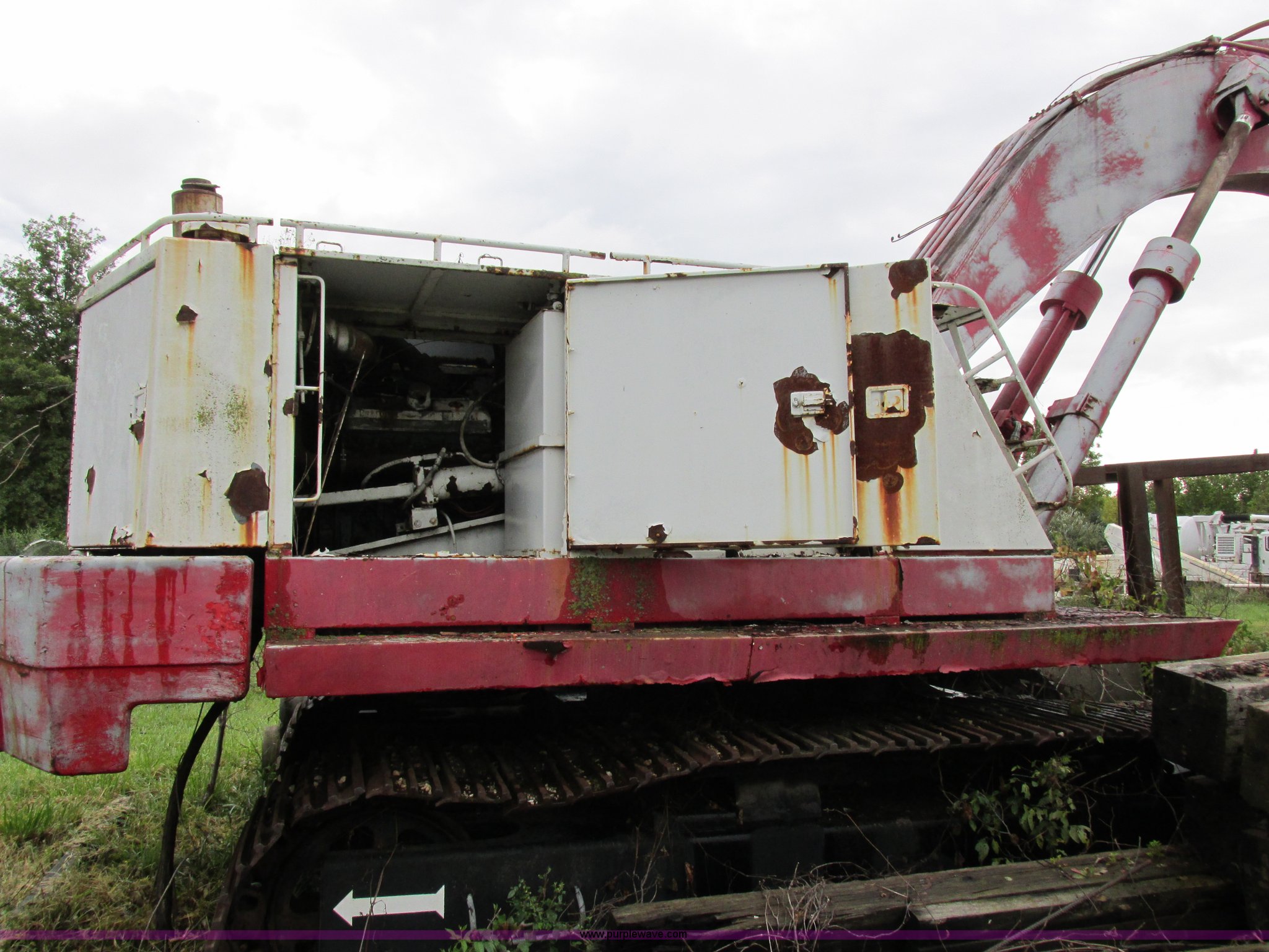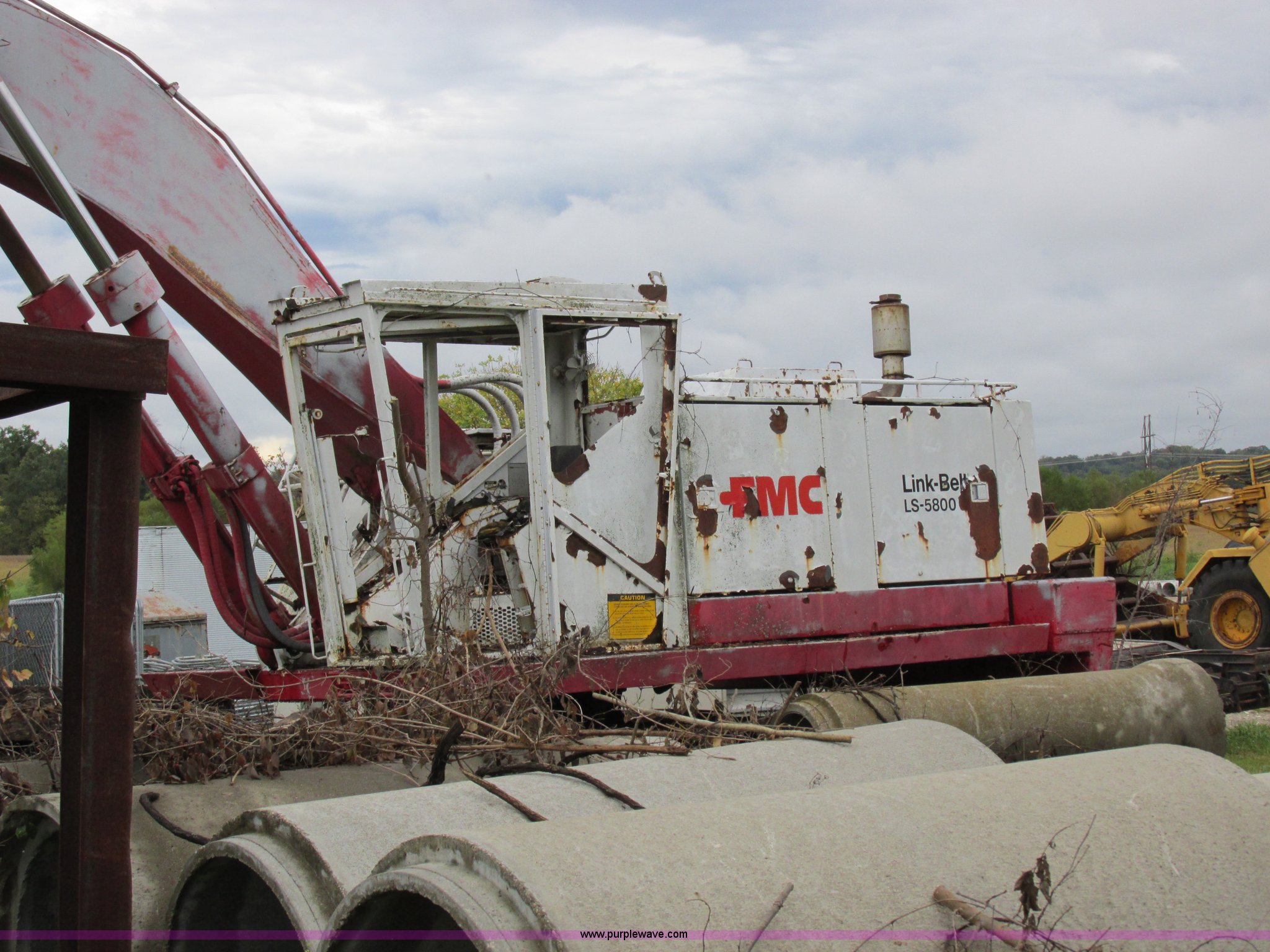 Link Belt LS-5800 excavator. Detroit Diesel eight cylinder diesel engine Non-operational engine, Hydrostatic transmission, ROPS, Spring suspension seat, Joystick controls, Standard boom, MPM 54"W bucket 2.75 cubic yard capacity, 36"W steel track pads, 11'11"W, Approximately 99,000 lbs operating weight, Interior/exterior cosmetic damage, Unknown operating condition, Serial 1280. J. Louis Crum Corporation. 1010 Highway UU North. Columbia, MO 65202